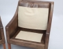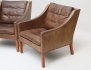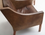 fåtöljer 1 par modell 2207, Fredricia Stoleabrik Danmark, modellen formgiven 1963, mullvadsfärgat läder, lösa plymåer, benställning i mahogny (bruksslitage, repor, ena stolens rygg med skada i skinnet)