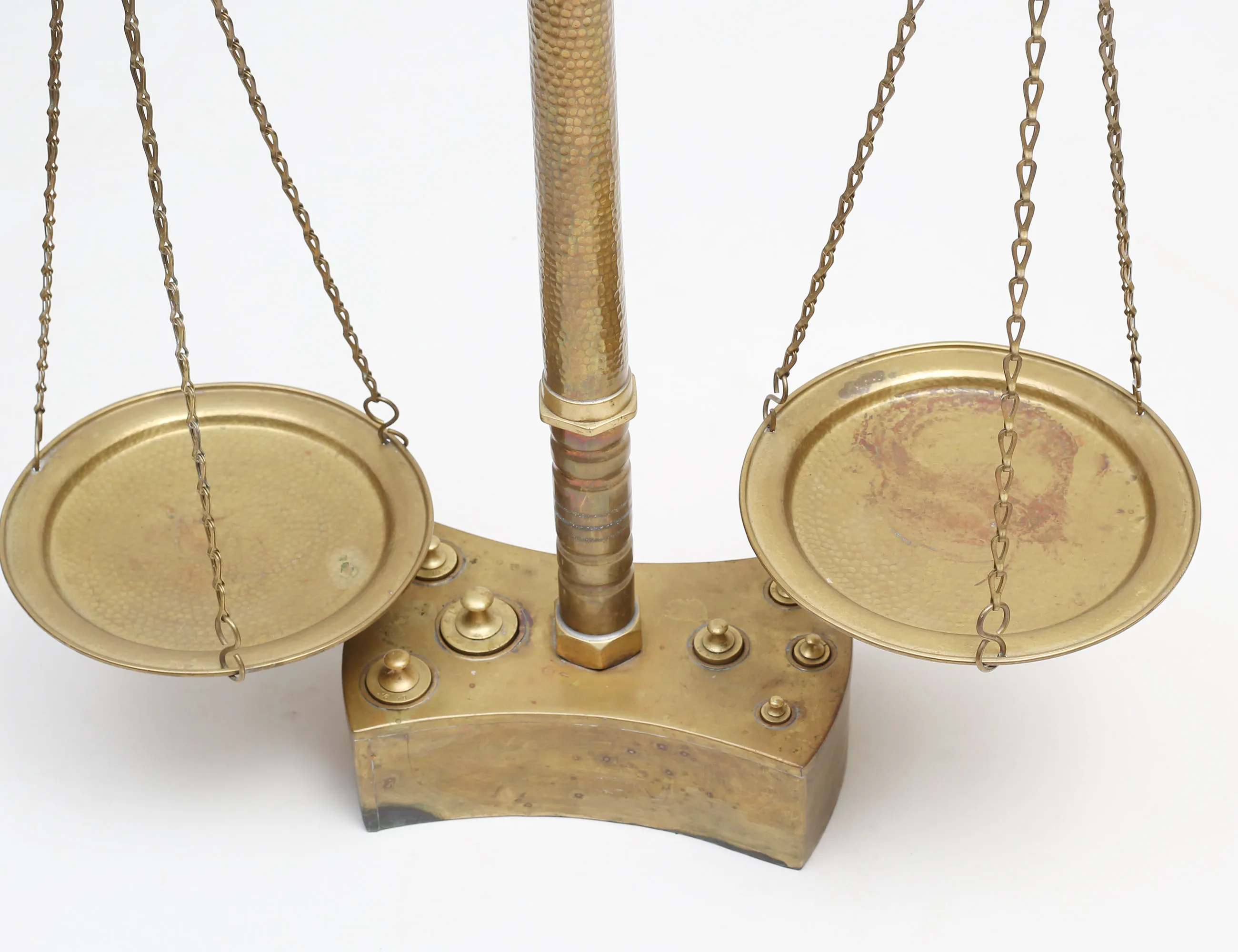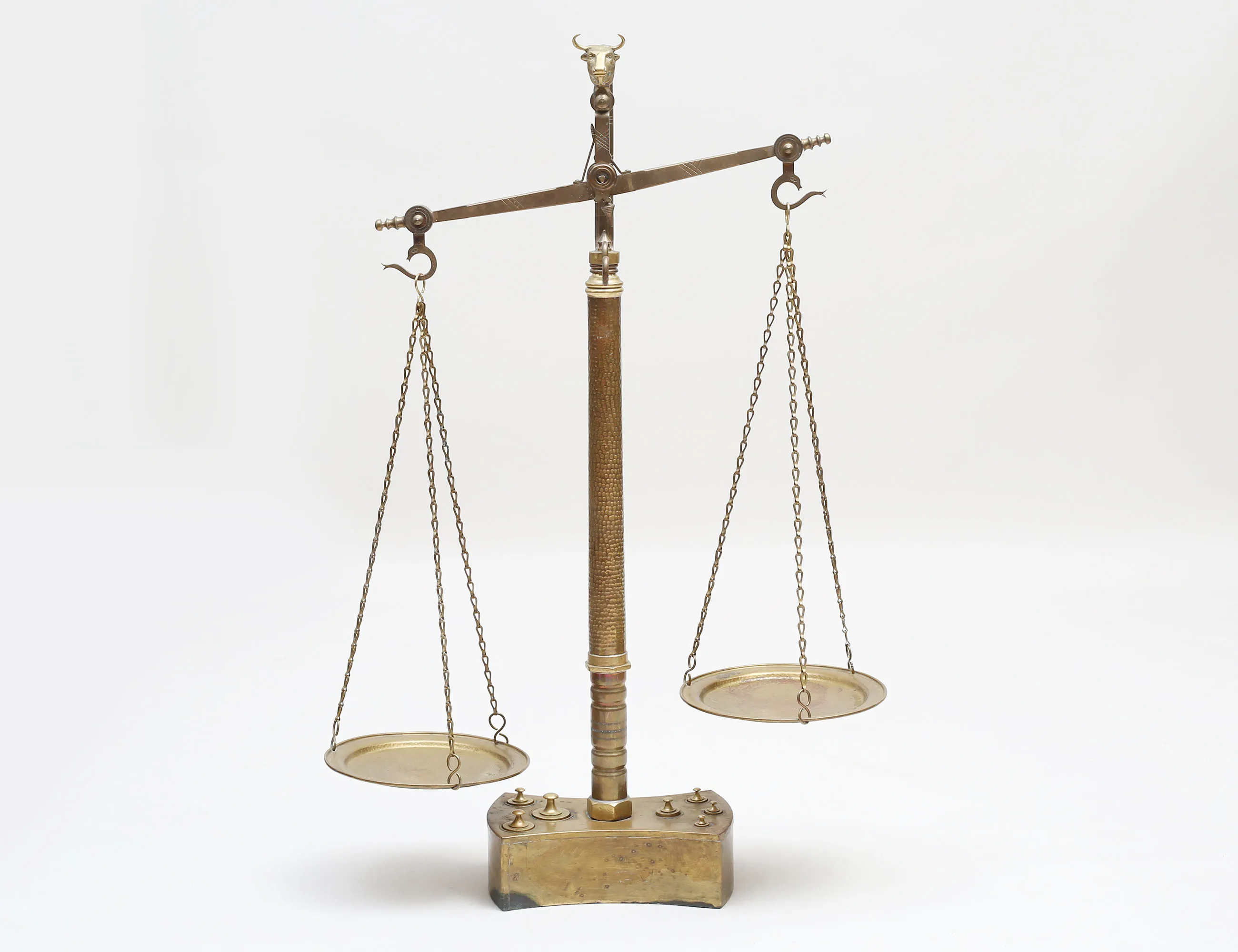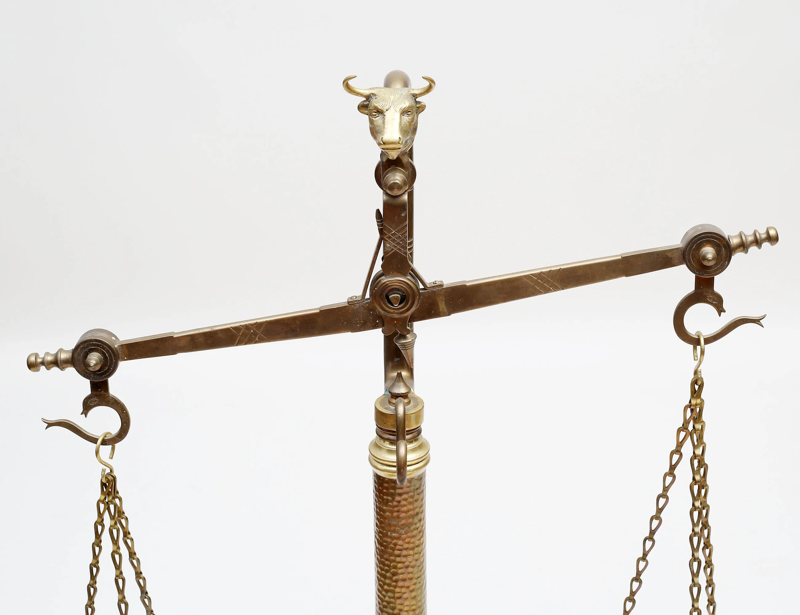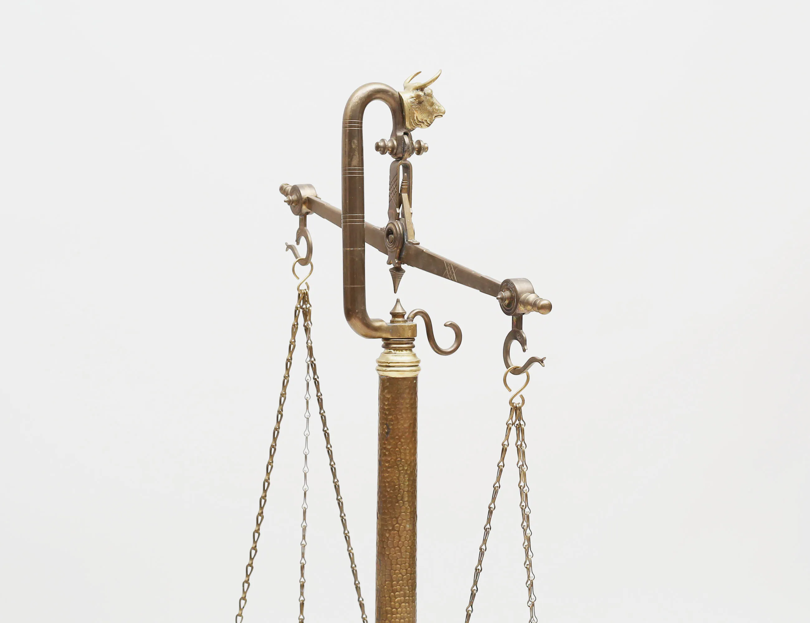 mässing, krön med tjurhuvud, fundament med 7 stycken viktsatser, höjd 114, bredd 60