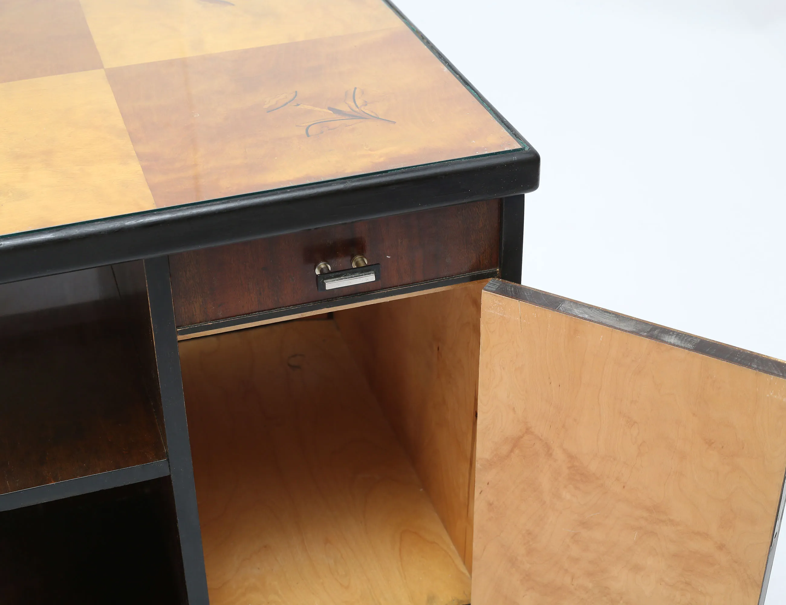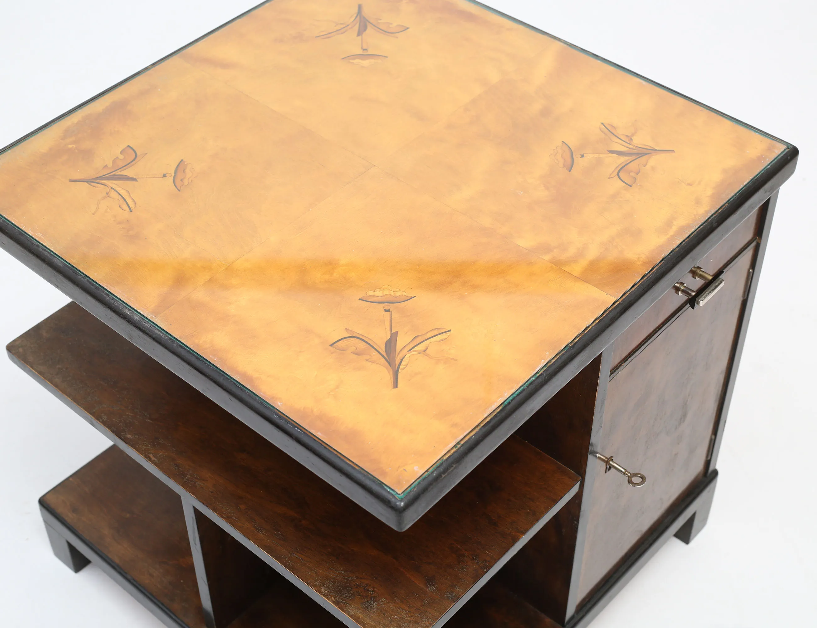 betsad björk, skivan med intarsiadekor under glas, dubbla skåpdörrar, en låda, ett hyllplan, höjd 58, bredd 58x58 (smärre bruksslitage)