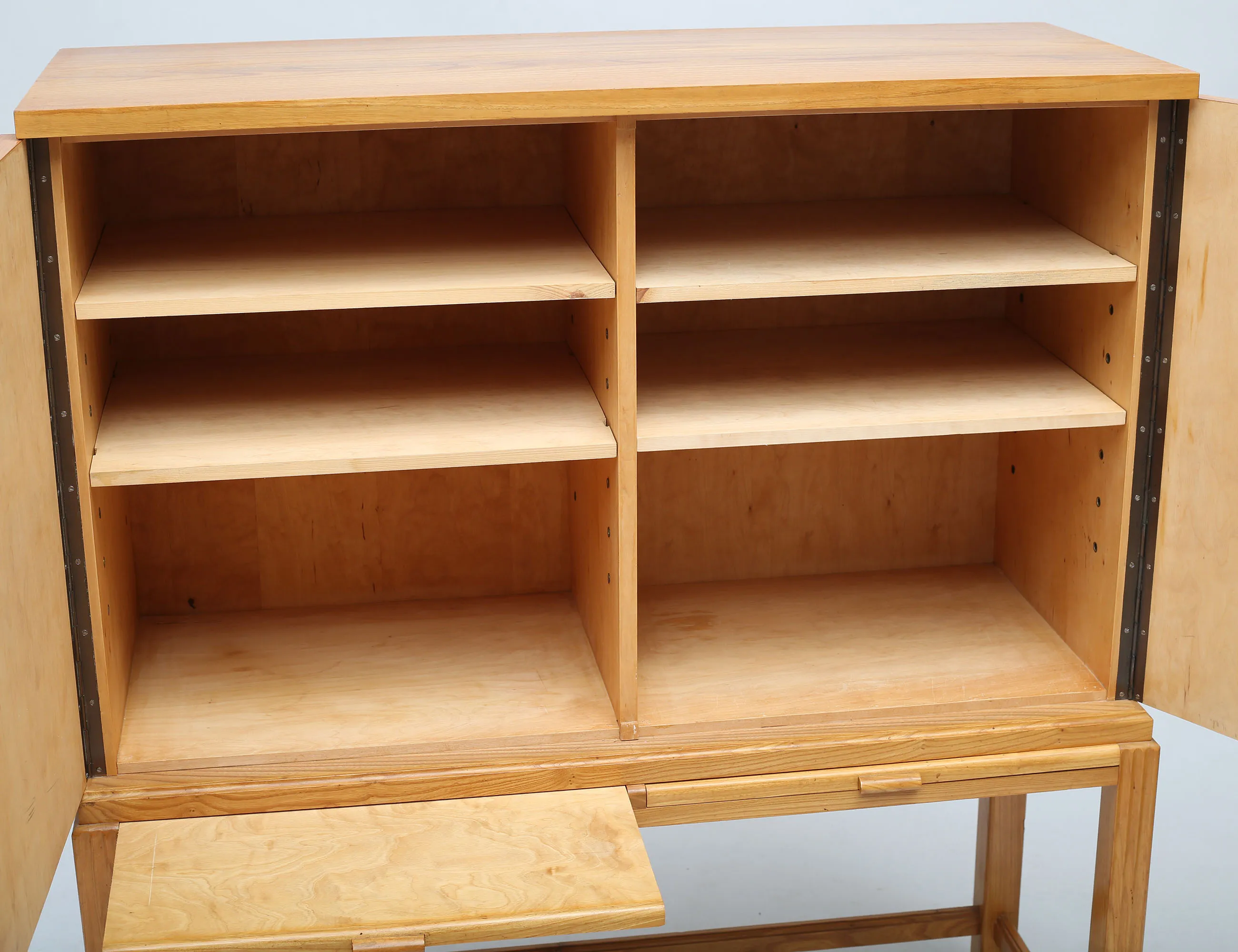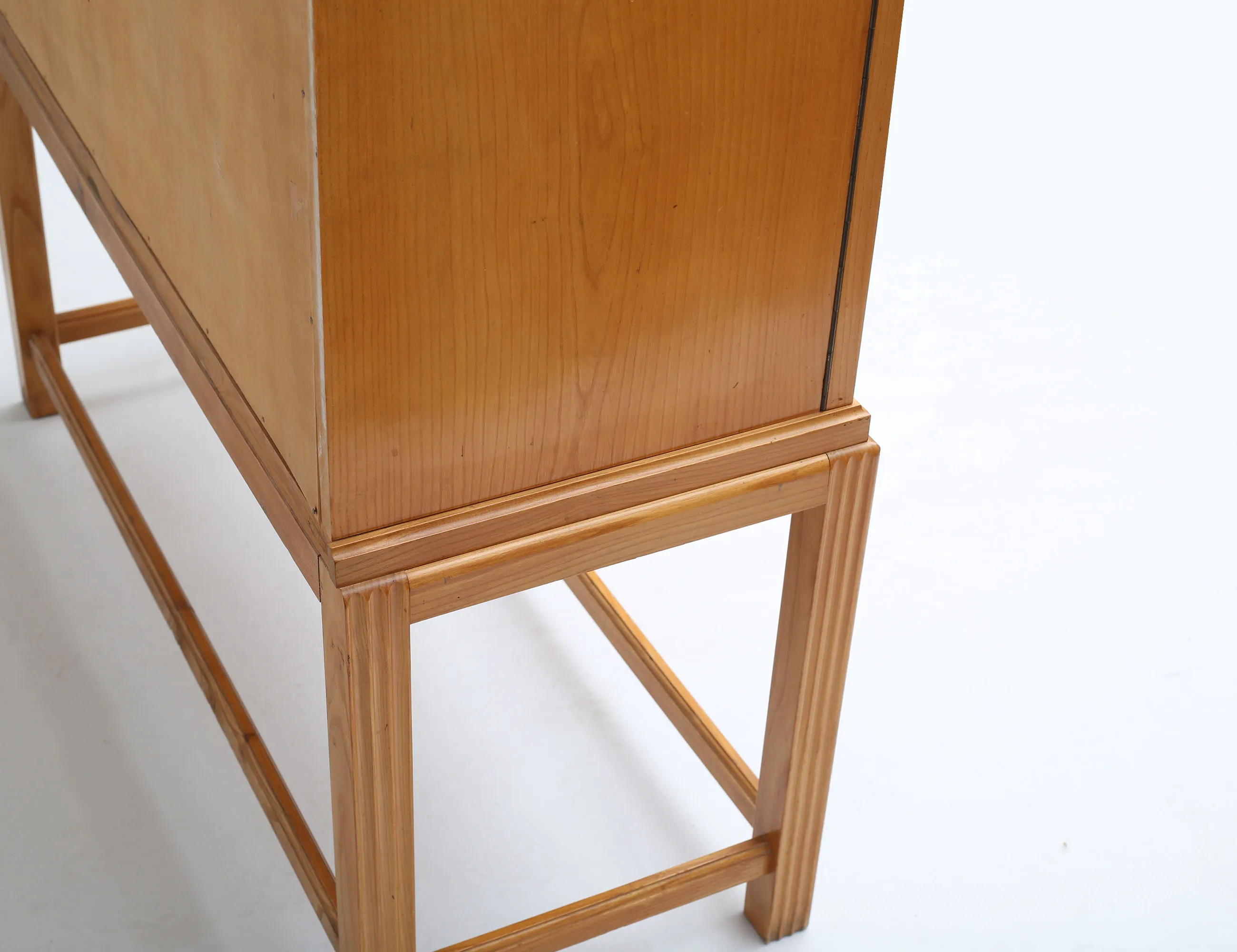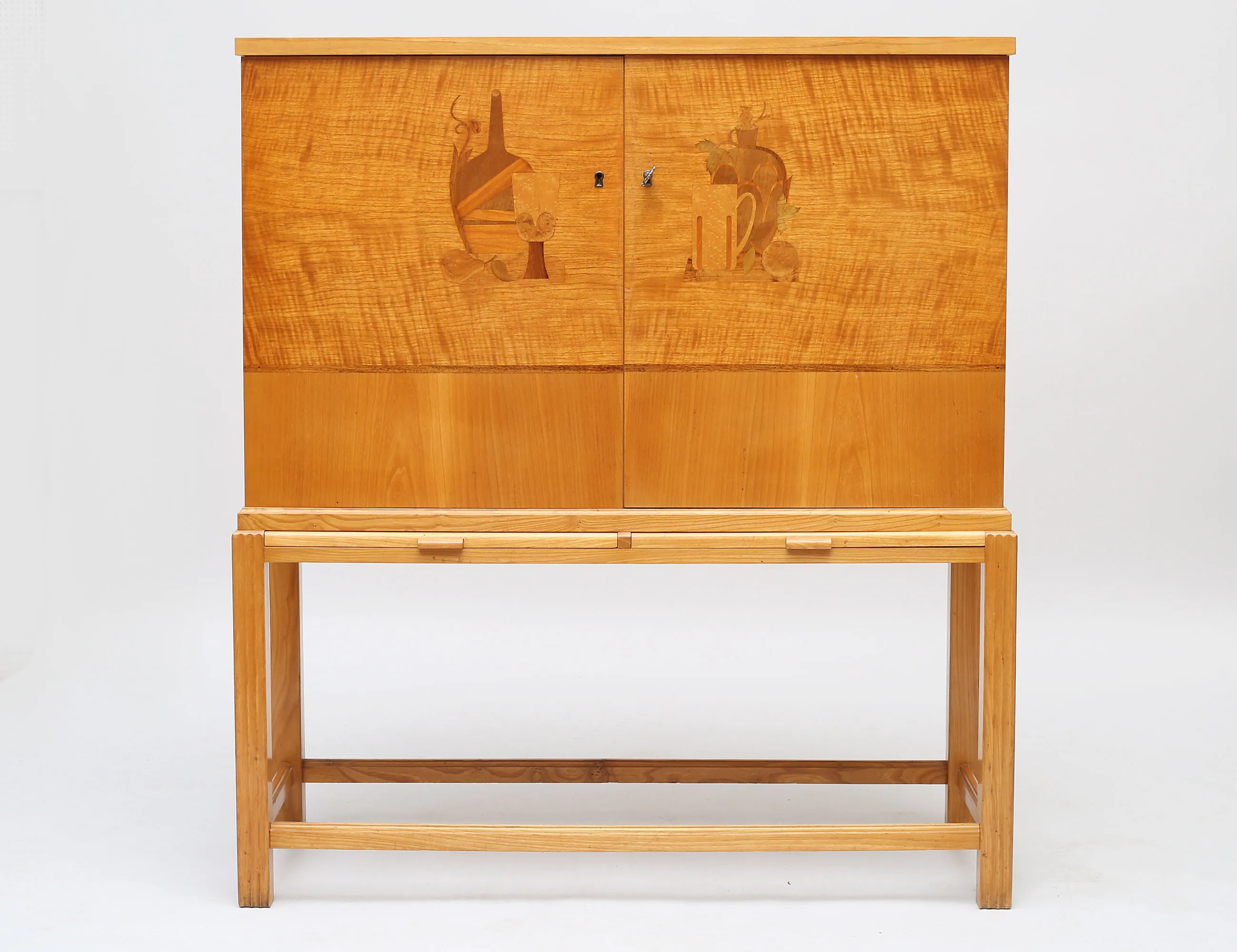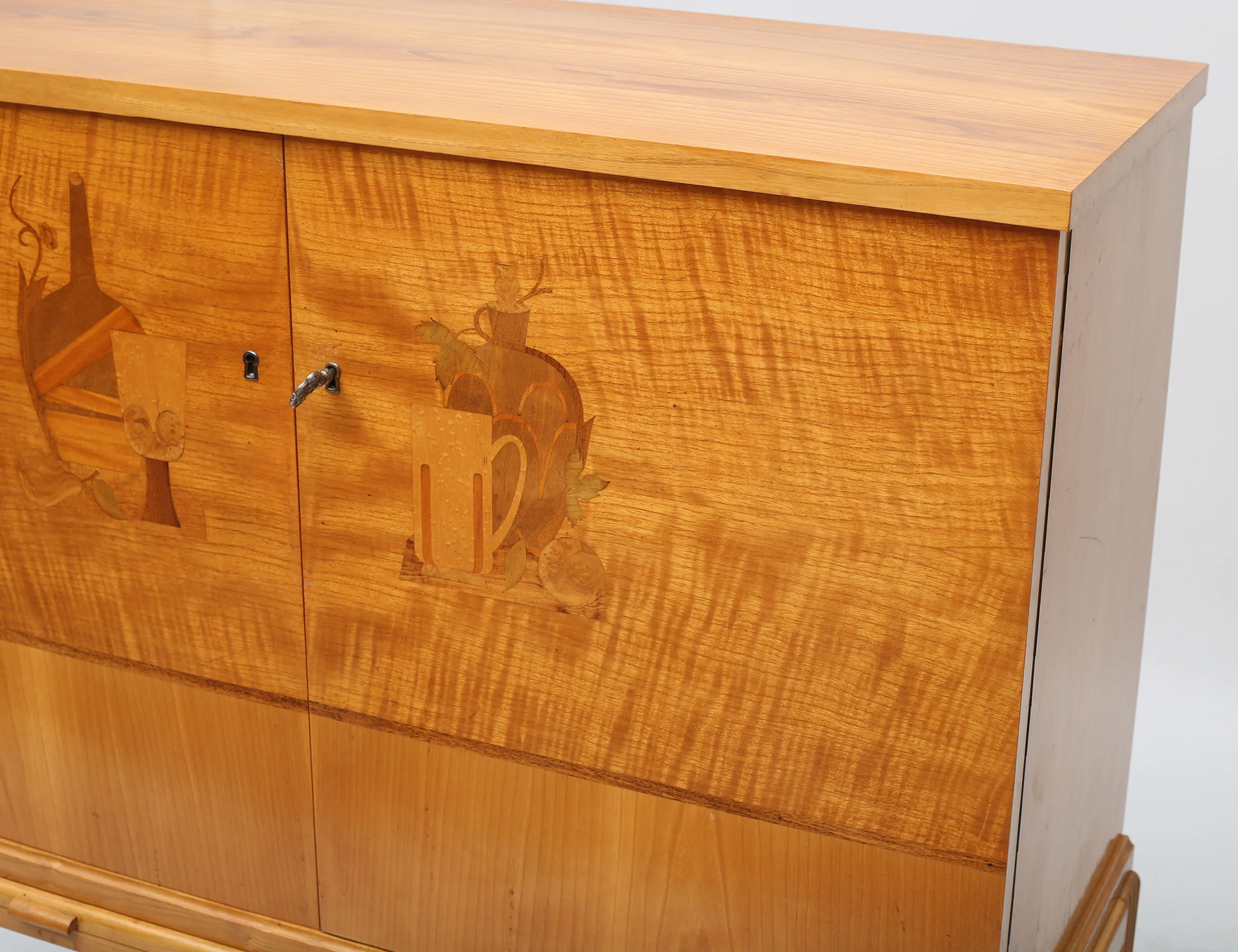 fanerat med alm, intarsiadekor av drinkattribut, invändig hyllinredning, två utdragbara skivor, på benställning, höjd 119, bredd 103, djup 42 (smärre fanerskada vid ena dörren)
