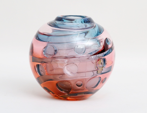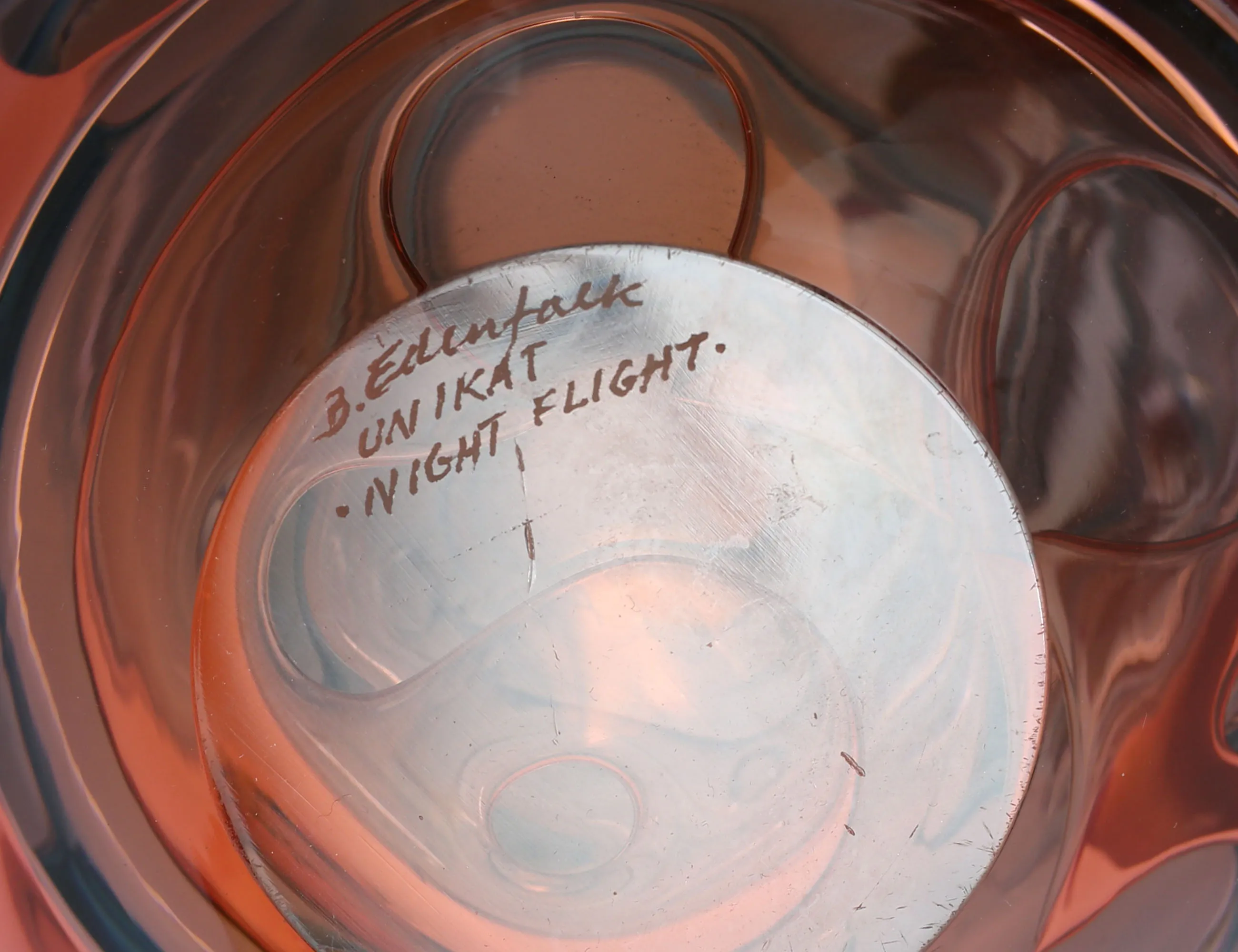 konstglas "Night Flight", 1990-tal, Thalatta teknik, inneslutna ristningar och luftblåsor, unikat, signerad, bok medföljer, höjd 15,5, diameter 16 (smärre repor ca 5 cm på mitten