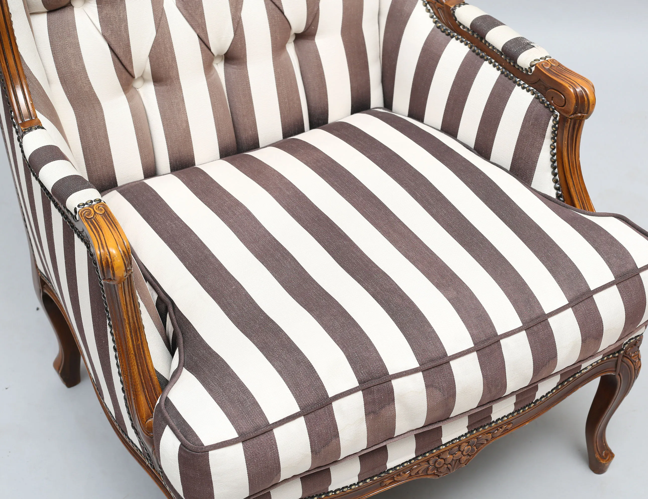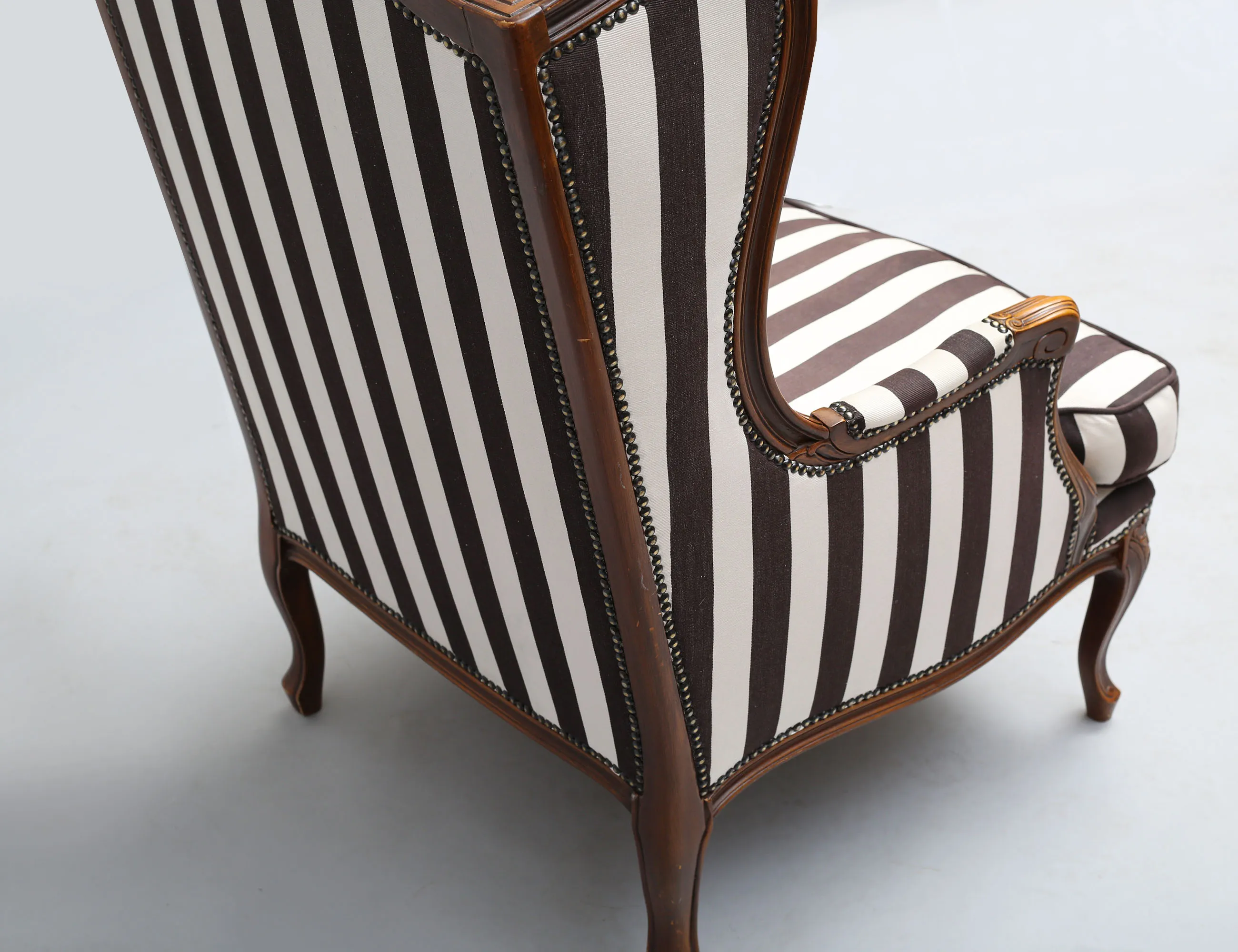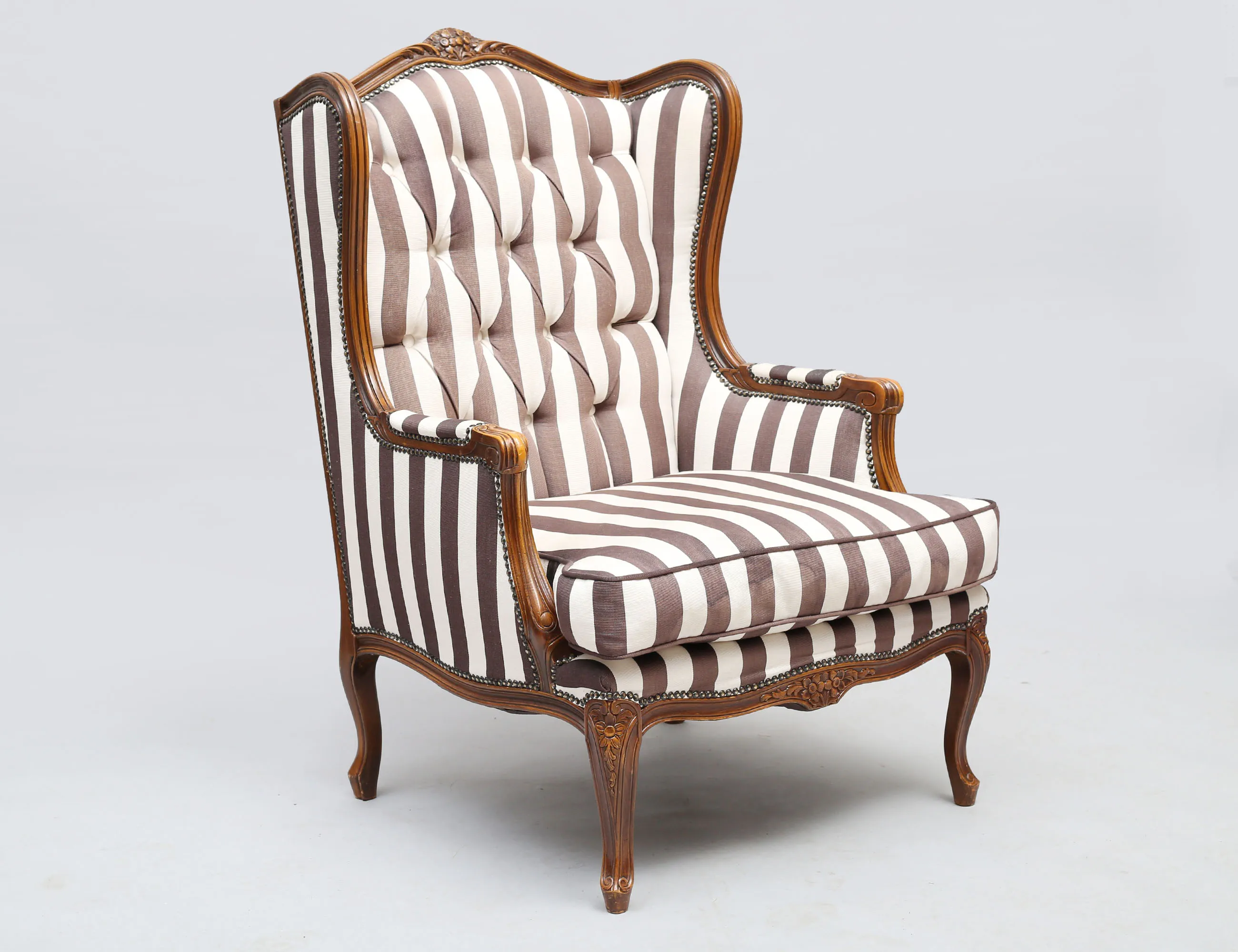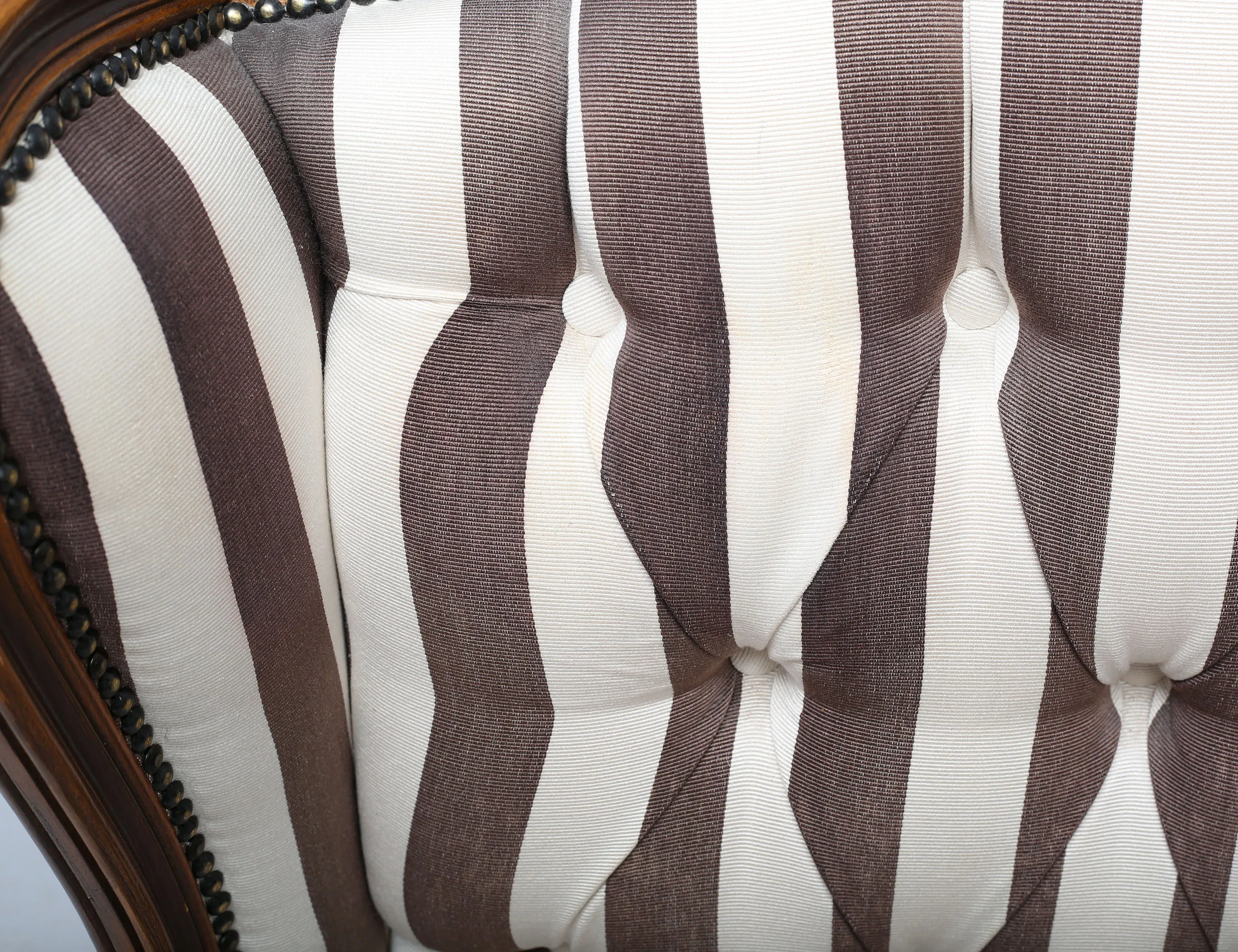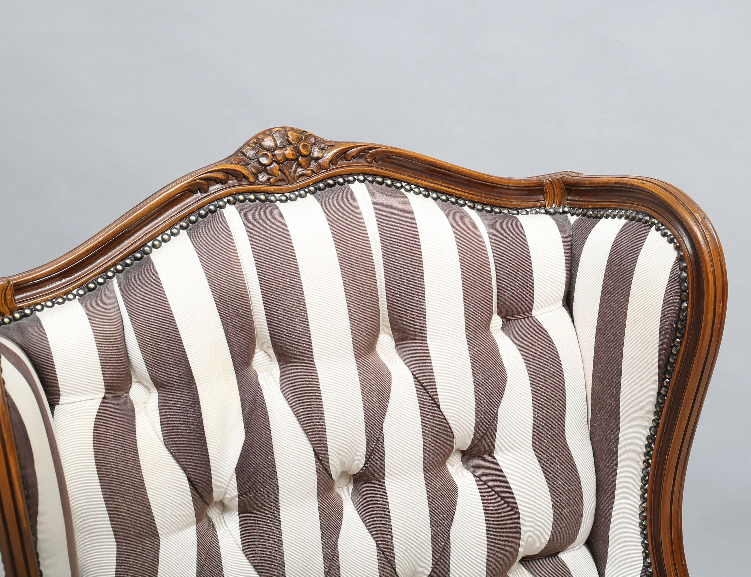 träskuren dekor, djuphäftad rygg, lös stoppad sits, höjd 107, bredd 6 (något blekt klädsel, smärre fläckar)