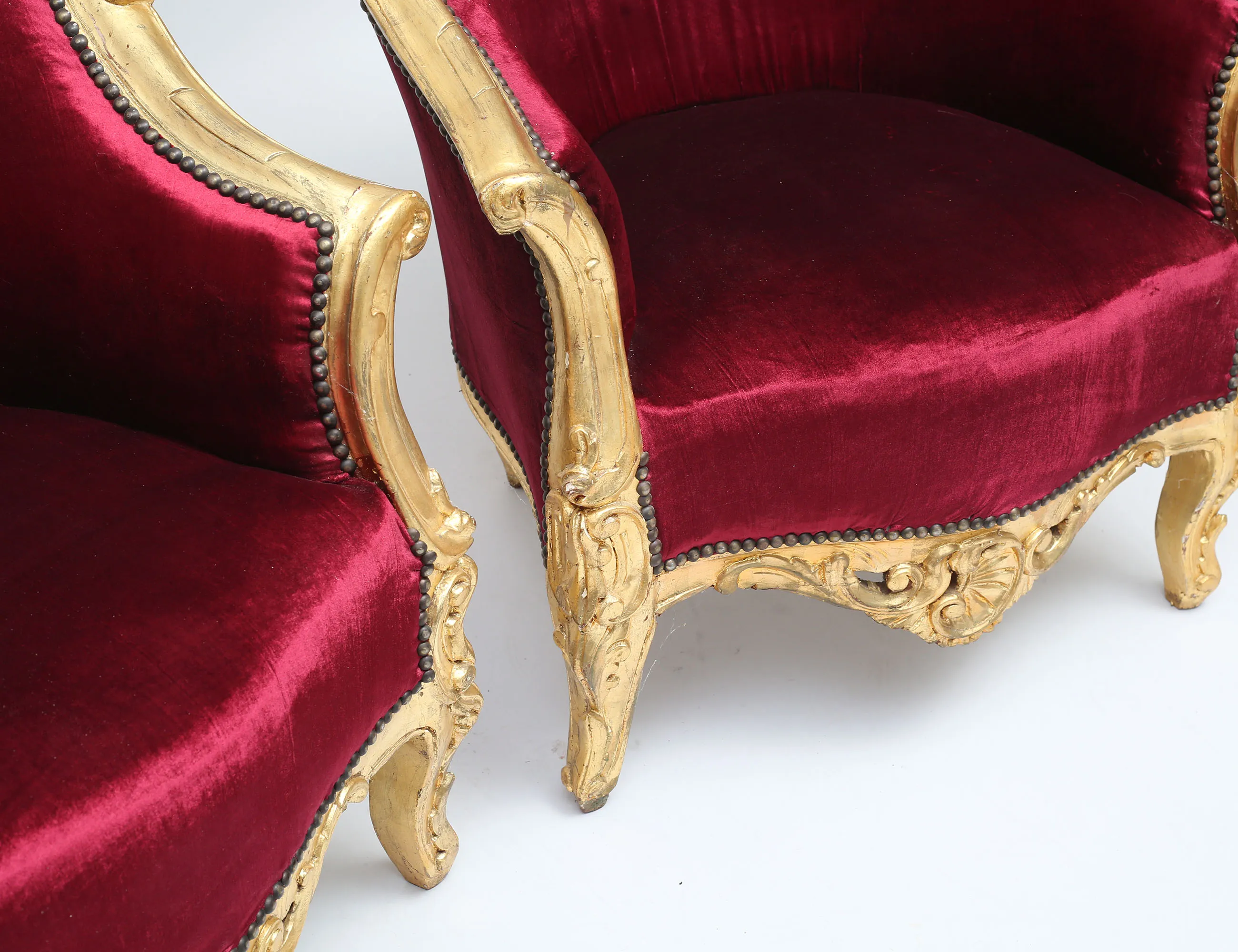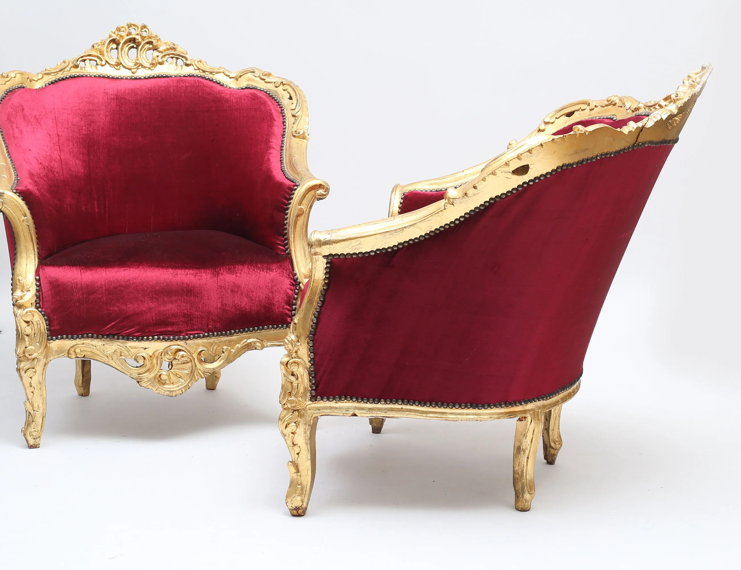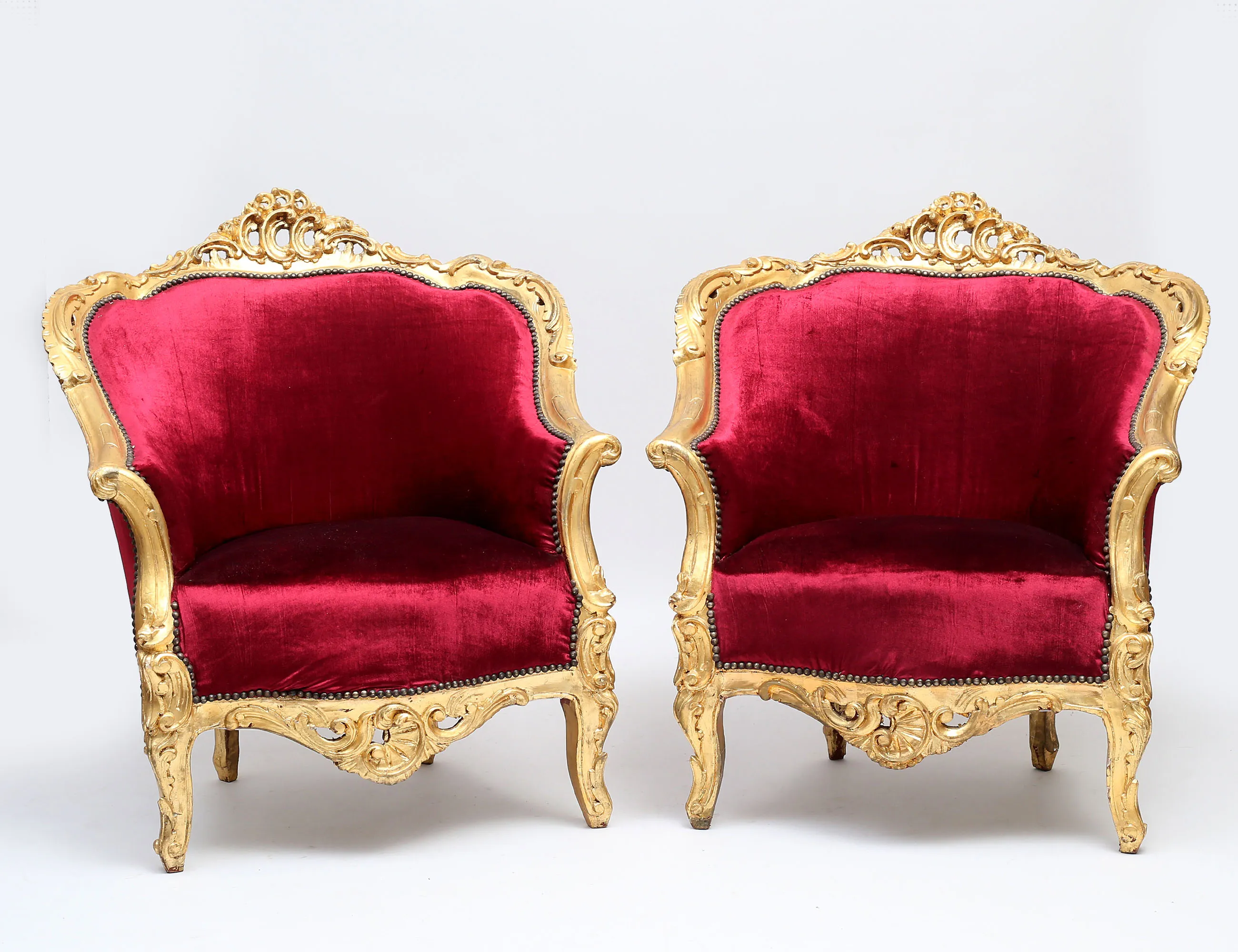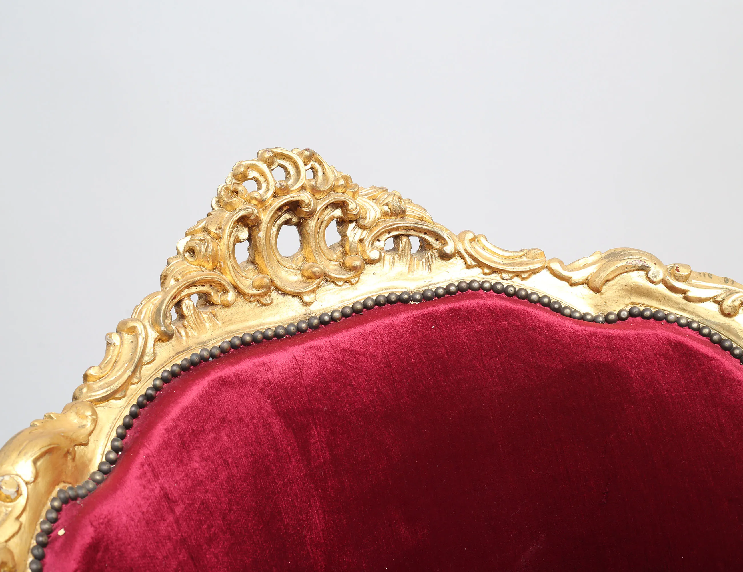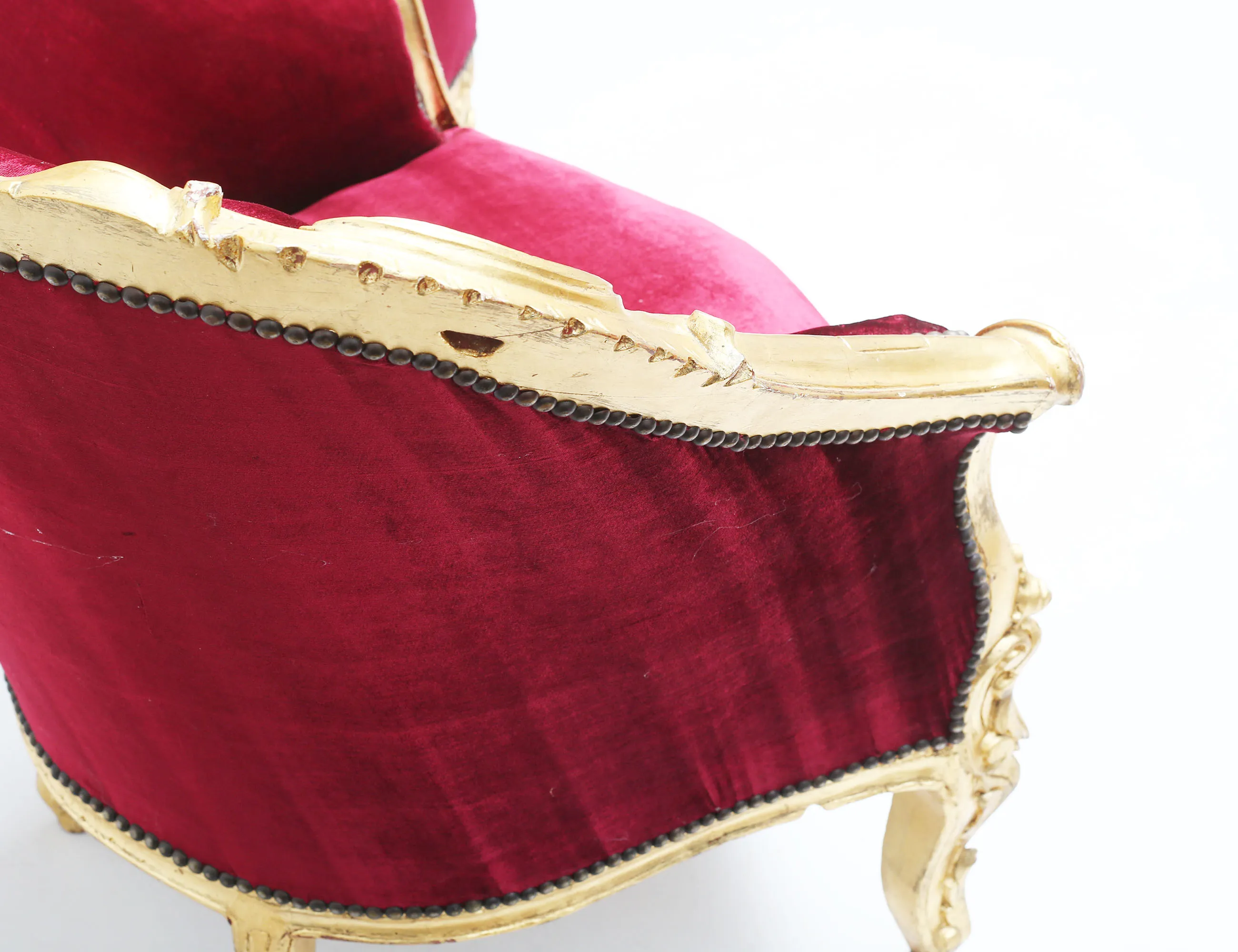 Italiensk rokokostil, stomme i trä, förgyllda, rikt träskuren dekor, klädsel i vinröd sammet med pärlspik, sitthöjd 50, höjd 105, bredd 90 (smärre dekorbortfall)