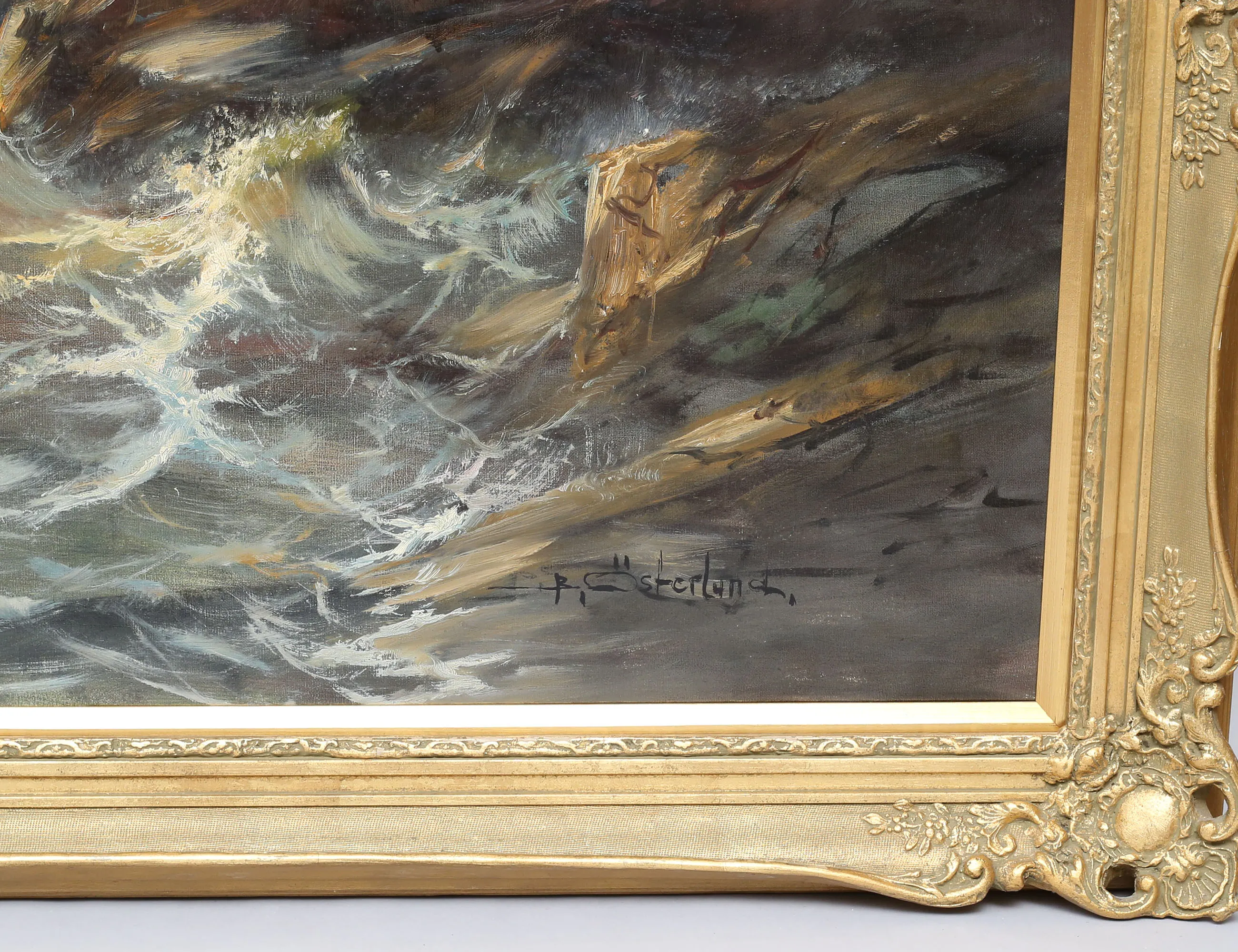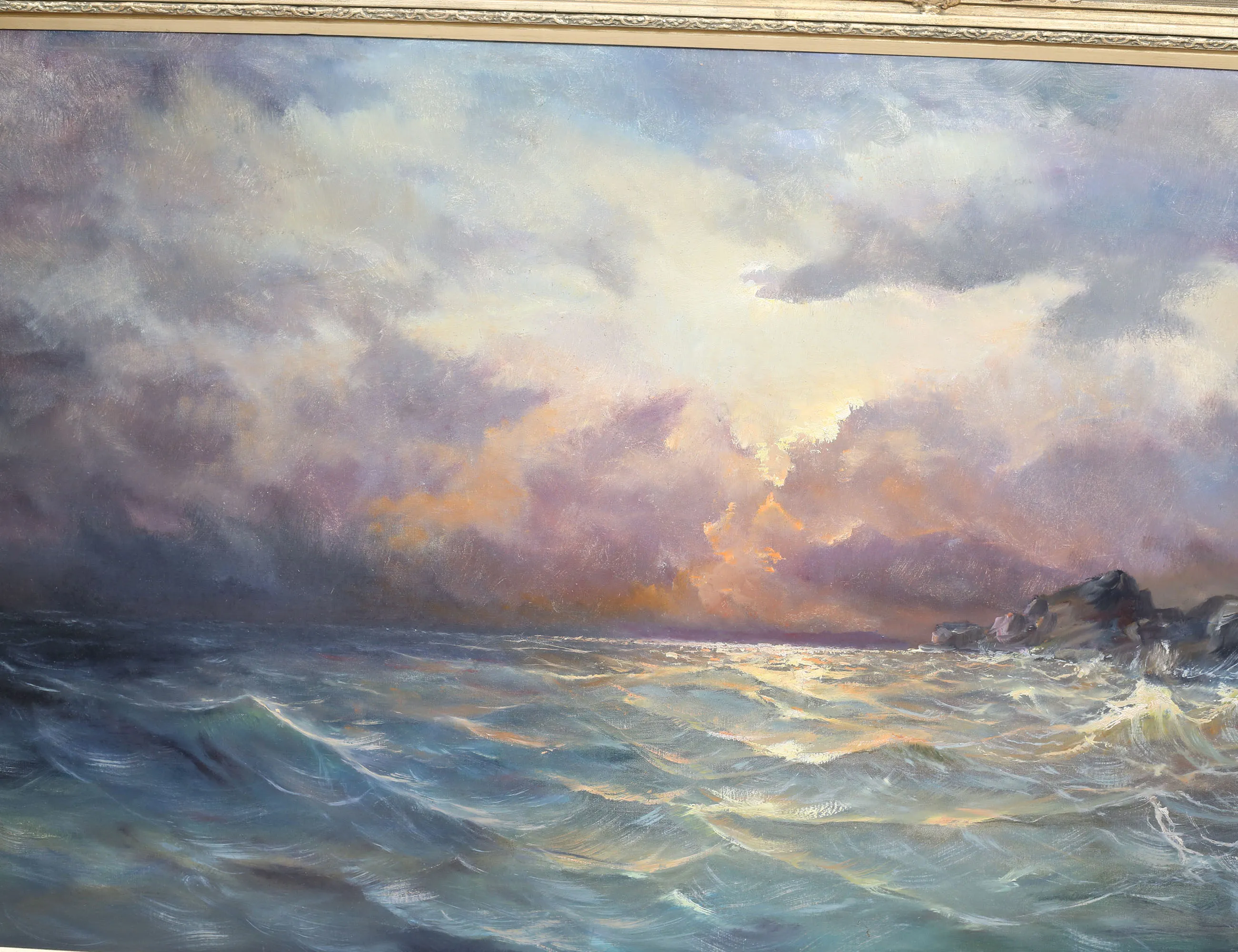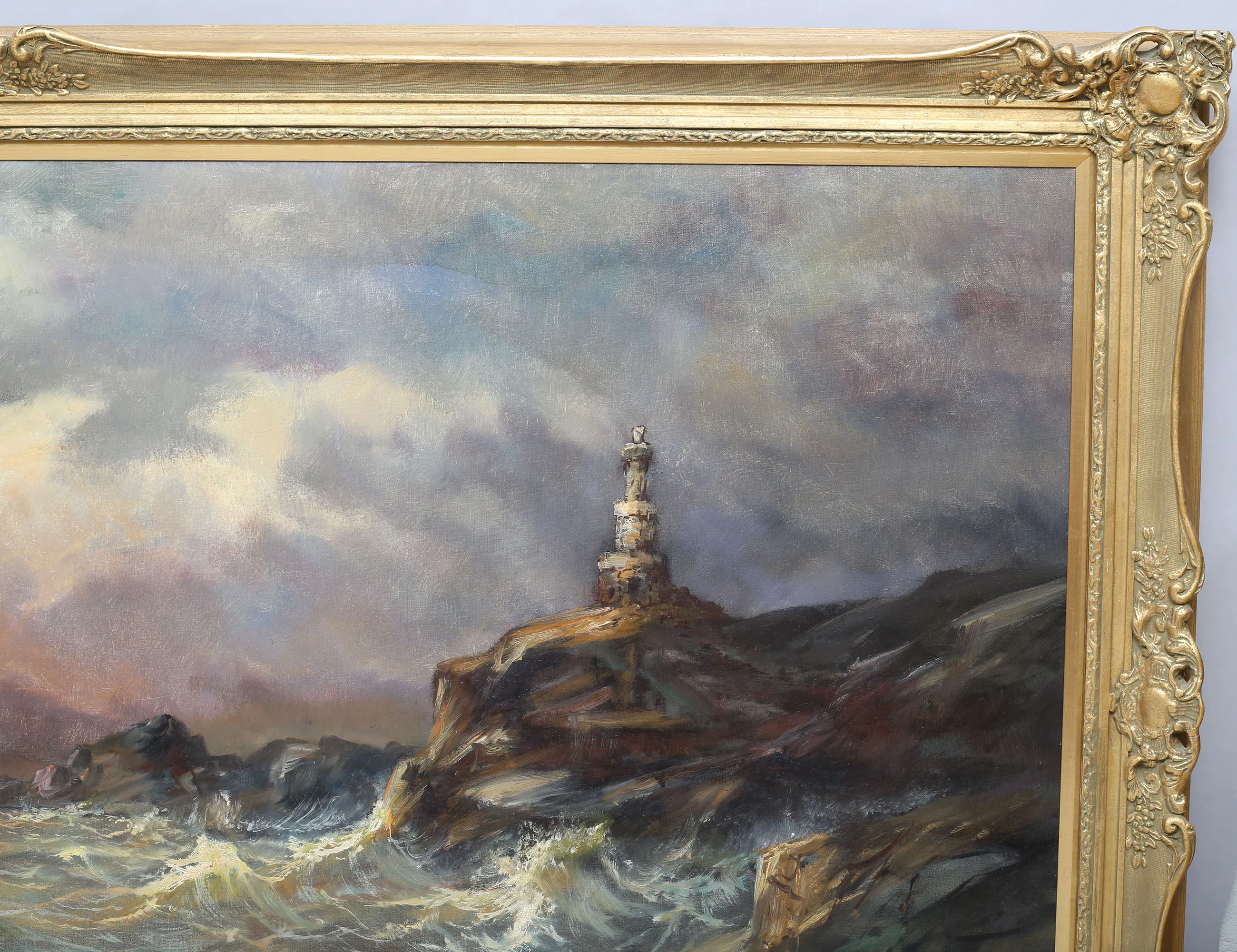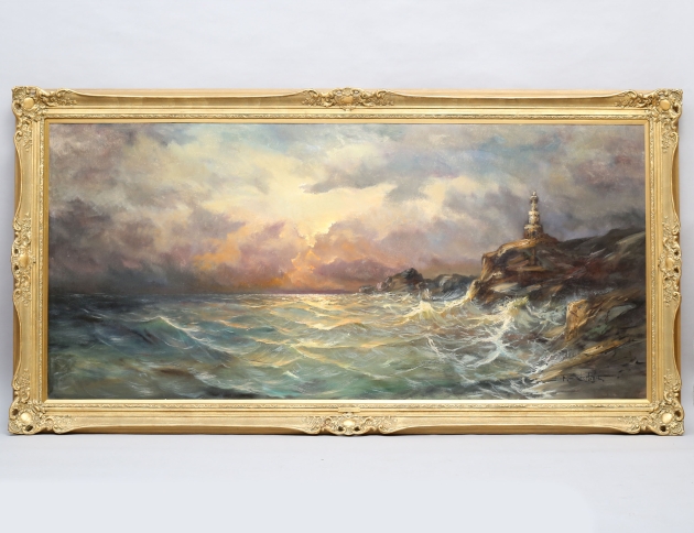 oljemålning på duk, upproriskt hav med fyr och klippor, signerad, 93x198, rammått 113x225
