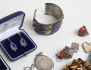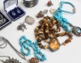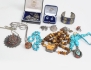 halscollier med turkoser 2 stycken, örhängen Art deco med blåa stenar, äldre smycken med markasiter, halscollier bärnsten, ringar 2 stycken med korall med mera
