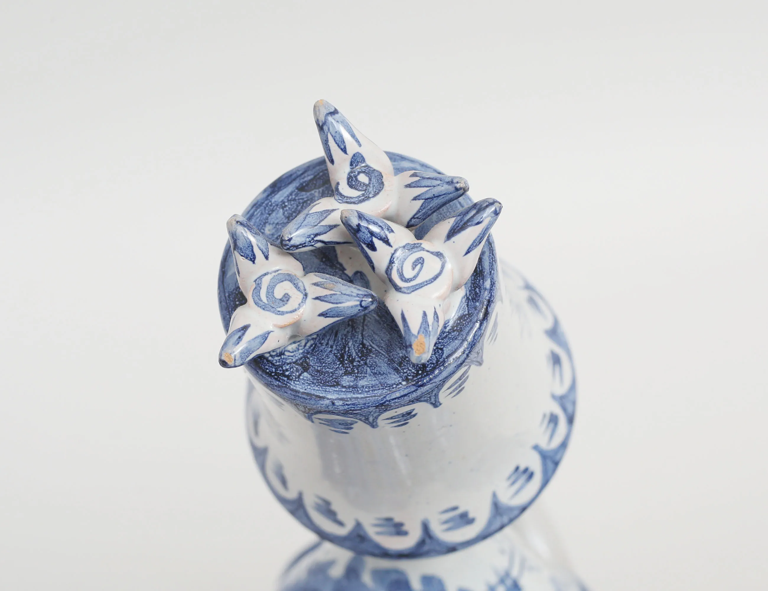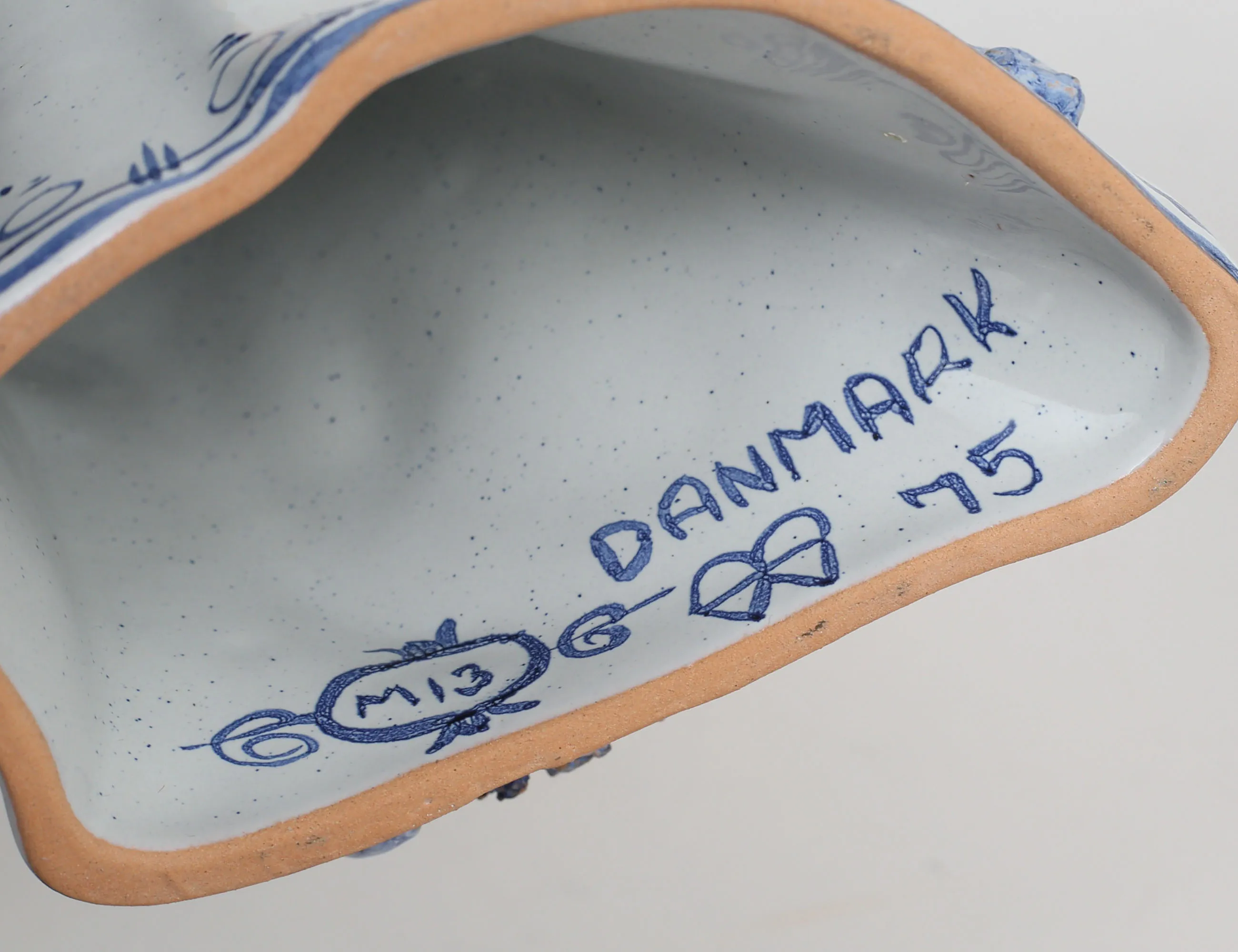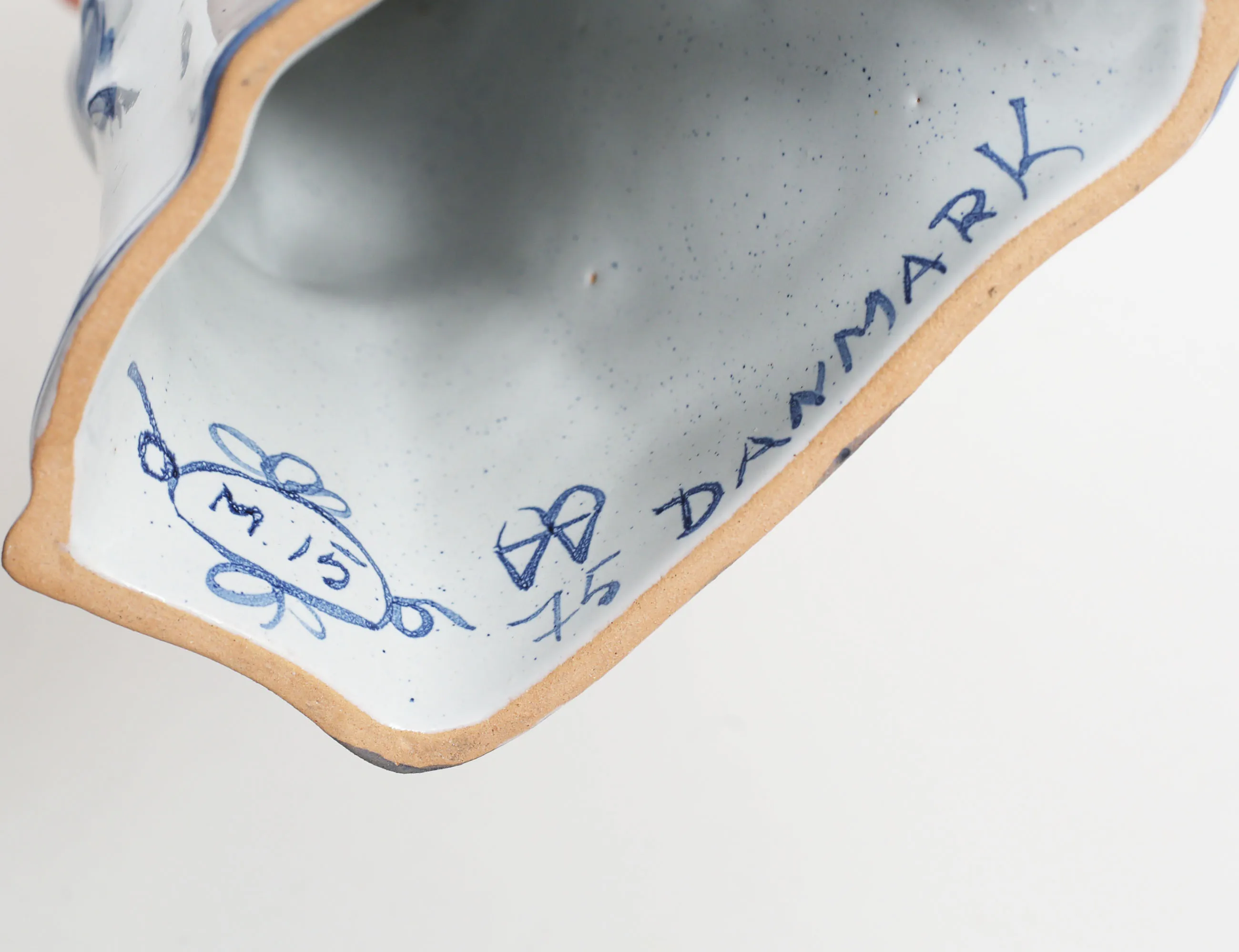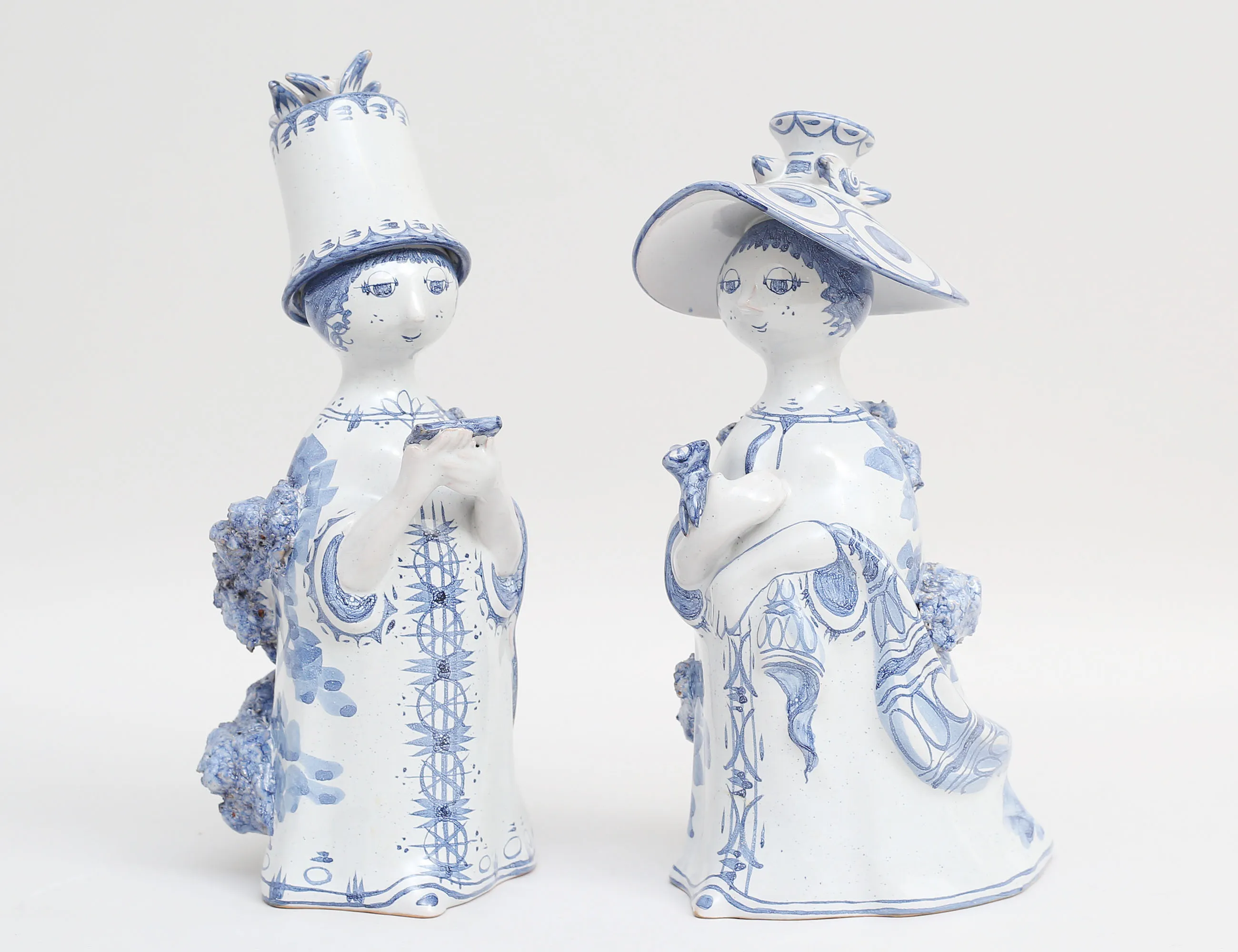 2 stycken figuriner, kvinnofigurer med katt respektive bok, blåvit underglasyrdekor, monogramsignerade, M13 respektive M15, höjd 24/25 (microglasyrmistor)