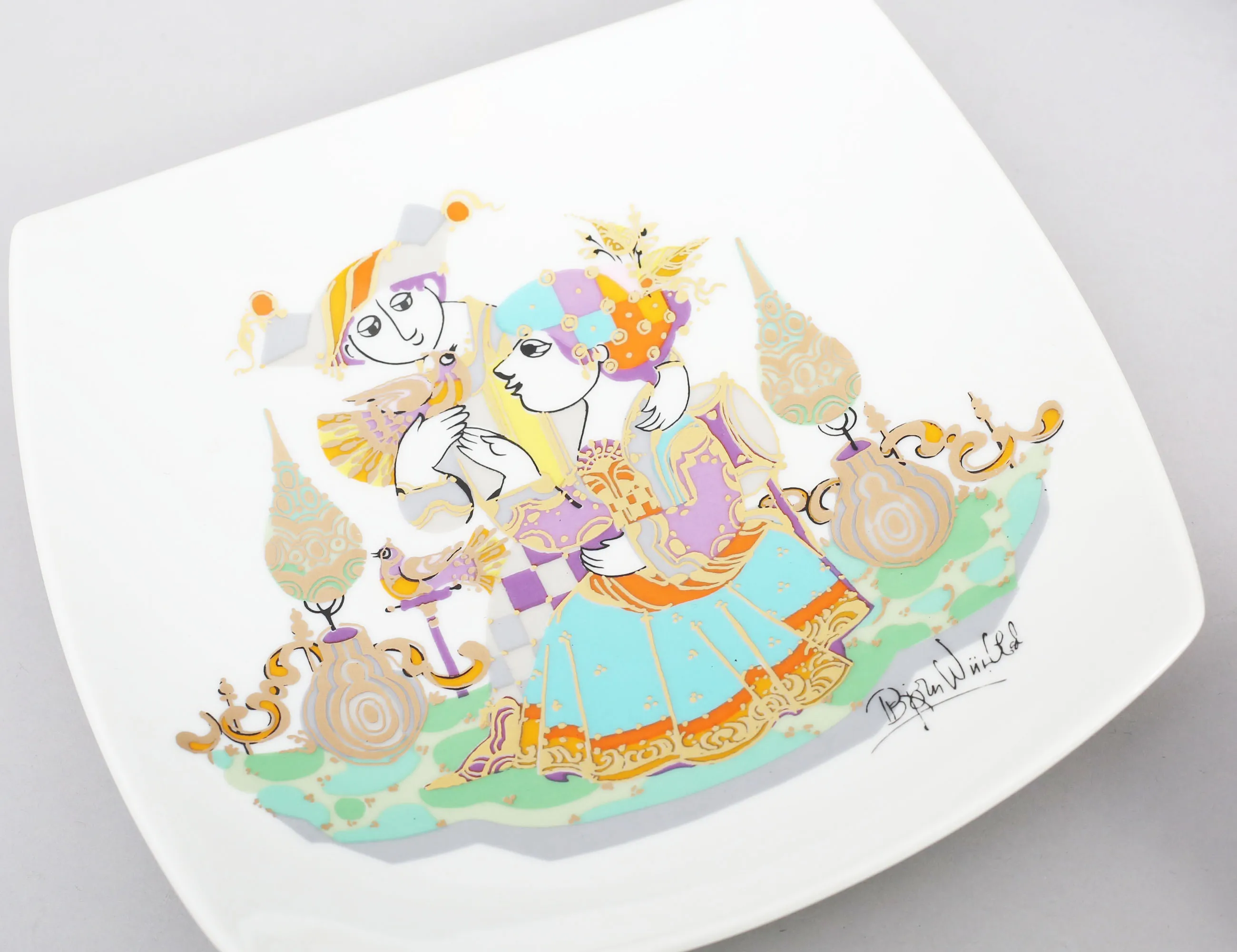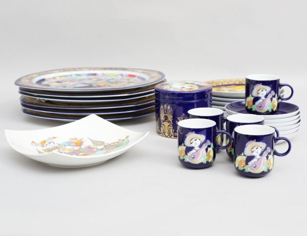 6 jultallrikar "Julsånger på porslin", diameter 28, 5 assietter "Aladin und die Wunderlampe", diameter 16,5, 5 espressokoppar med fat, höjd 6, dosa med lock, höjd 8, fat 18x18