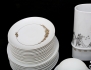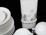 10 mattallrikar, 2 uppläggningsfat samt 6 buljongkoppar med fat, vitt porslin med reliefdekor, diameter 11,5-25, 12 tallrikar med förgylld dekor, diameter 21, vas märkt Peynet, förgylld och svart dekor, höjd 29