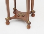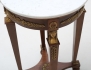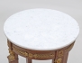 mahogny, raka nedåt avsmalnande ben, mässingsbeslag i form av karyatider, palmetter, fleuroner och rosettgirlanger, skiva i vit marmor, höjd 79, diameter 46