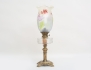 genombruten fot i bronserat gjutgods, fotplatta och stam i alabaster, oljehus i glas med slipad dekor, ursprunglig glaskupa med målad polykrom växtdekor, höjd 57