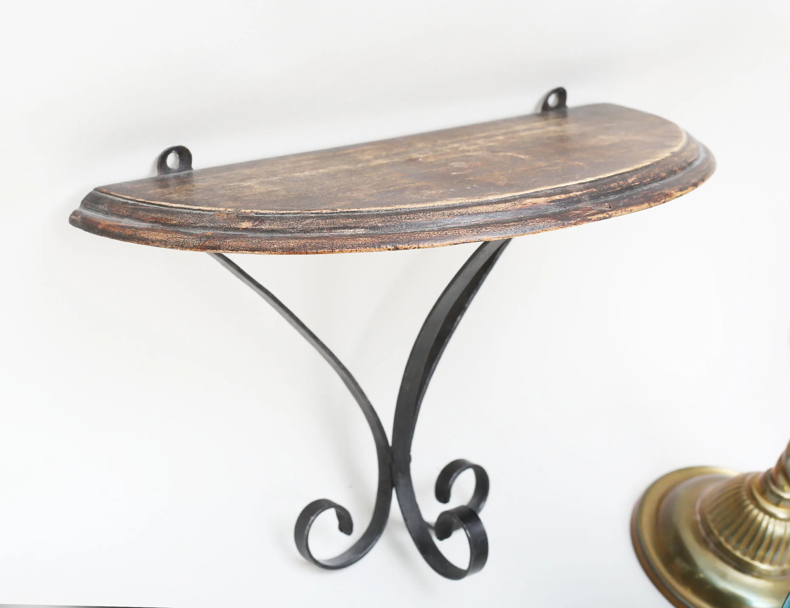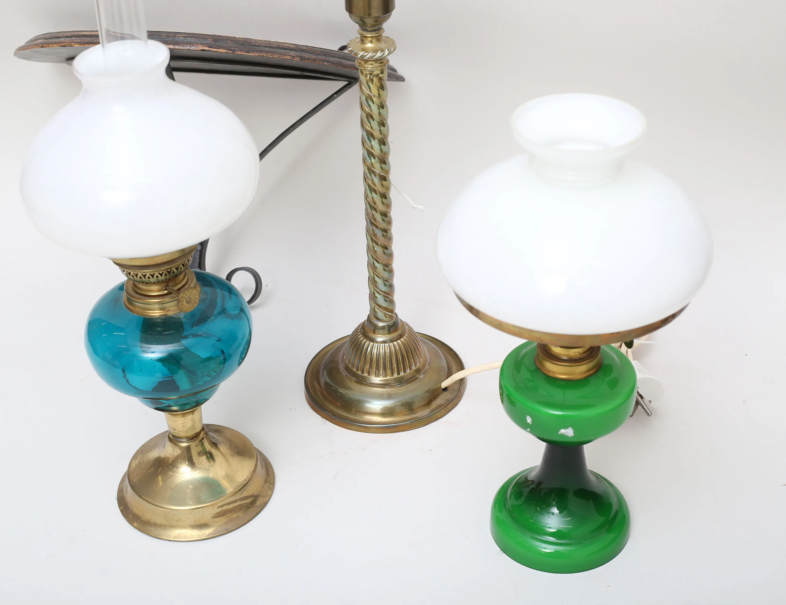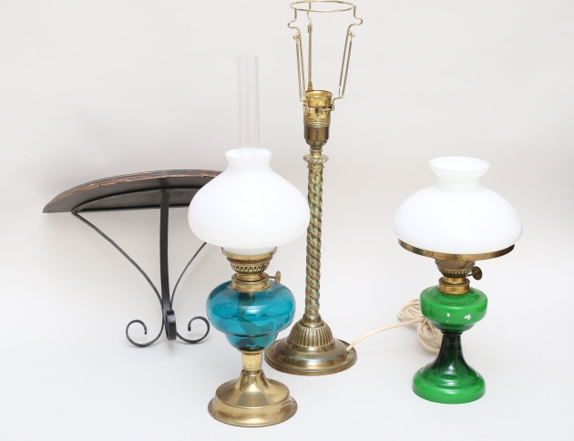 färgat glas, mässing, vita glaskupor, höjd 38/47, bordslampa mässing, 1900-talets första hälft, höjd 40 (defekt kontakt), väggkonsol smida, skiva i betsat trä, höjd 23, bredd 36 (4)