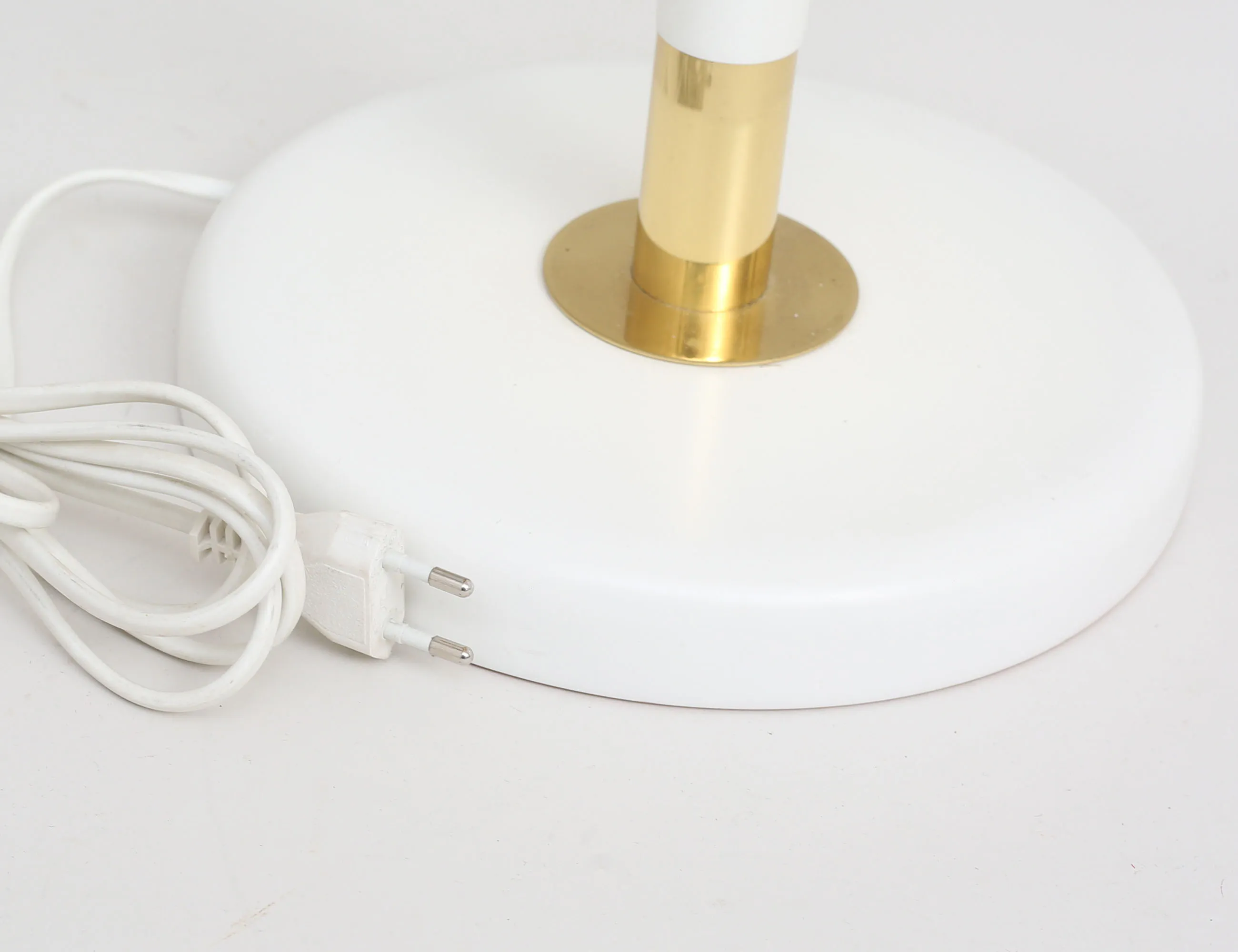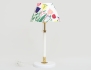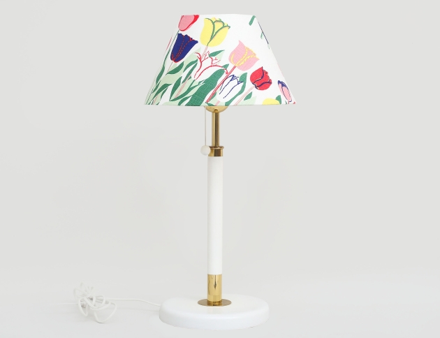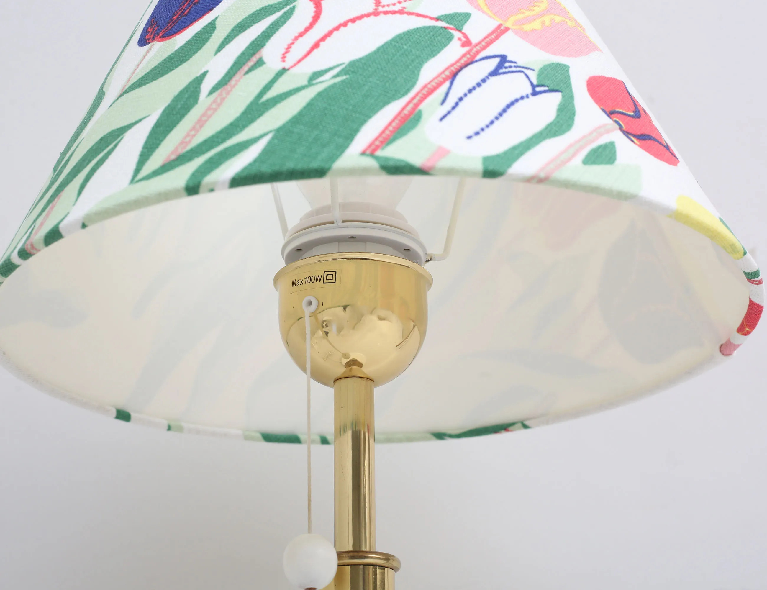 Karin Mobring IKEA sent 1900-tal, vitlackerat trä, mässing, skärm i "Tulpaner" design Josef Frank, Firma Svenskt Tenn, höjd 50 (63)