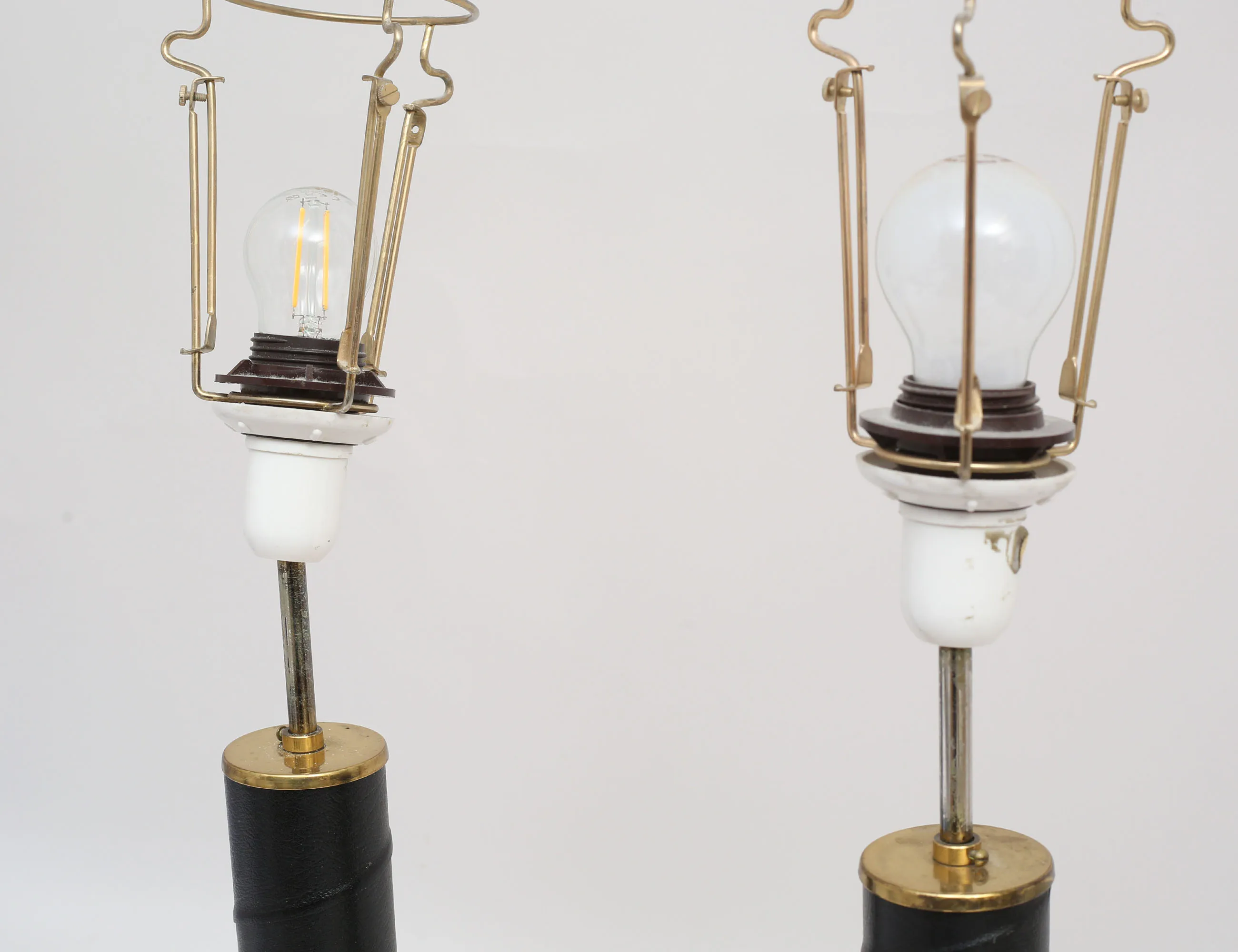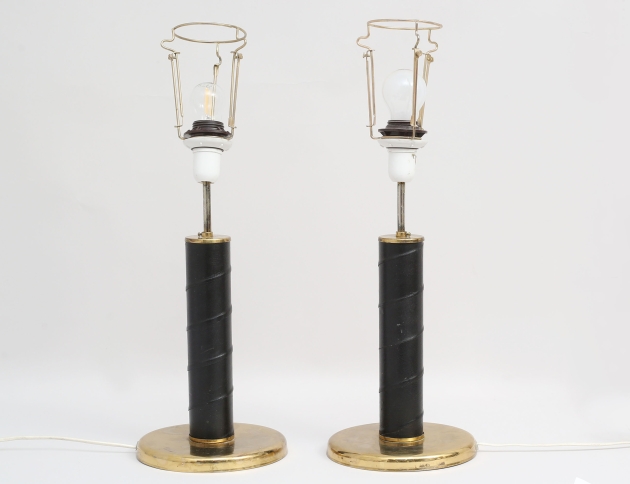 modell GMA 700, Gnosjö metall och armatur (?), mässing samt stam av lindat läder, ej funktionstestade, total höjd 42 (bruksslitage, fläckar på mässing, lamphållarna något lösa)