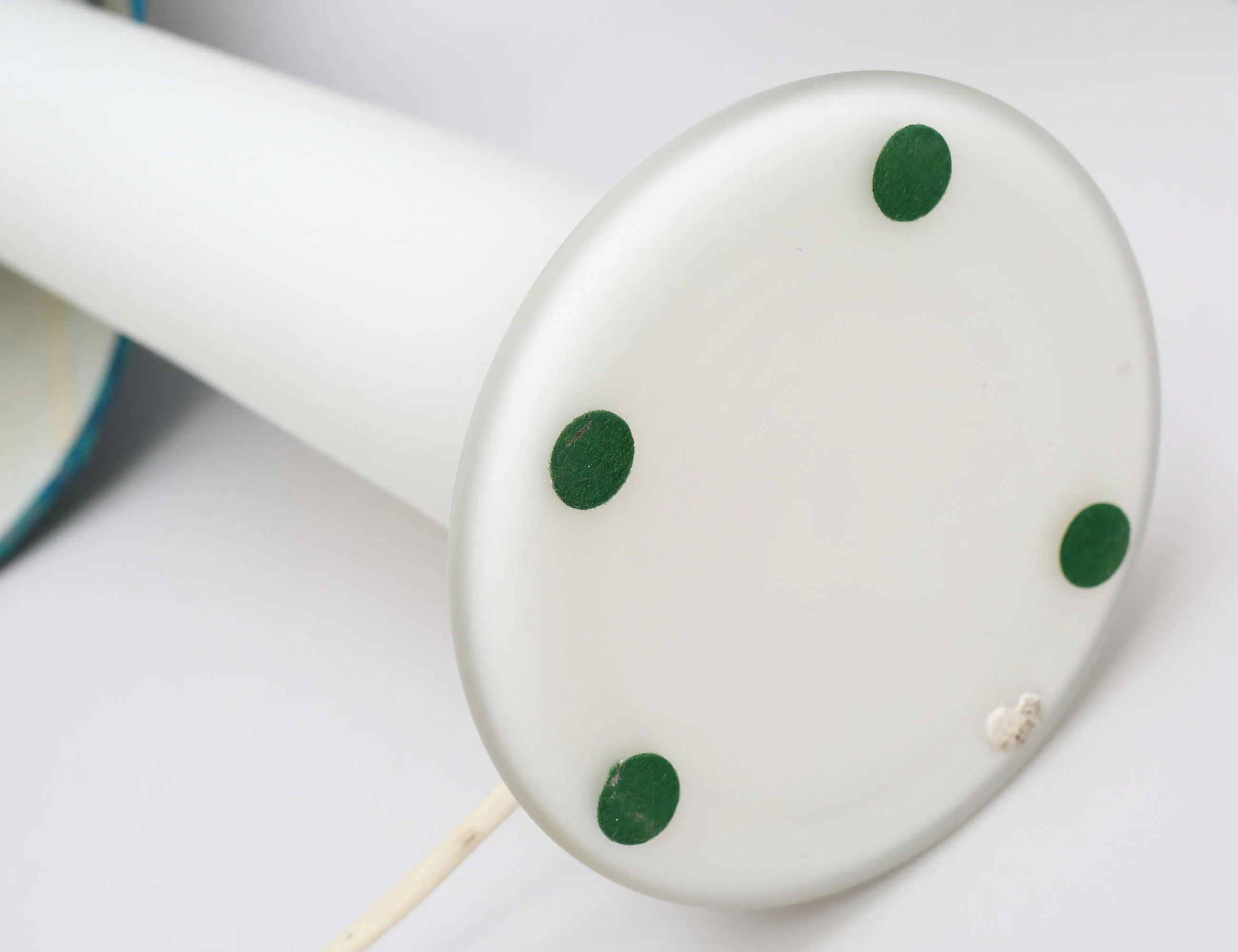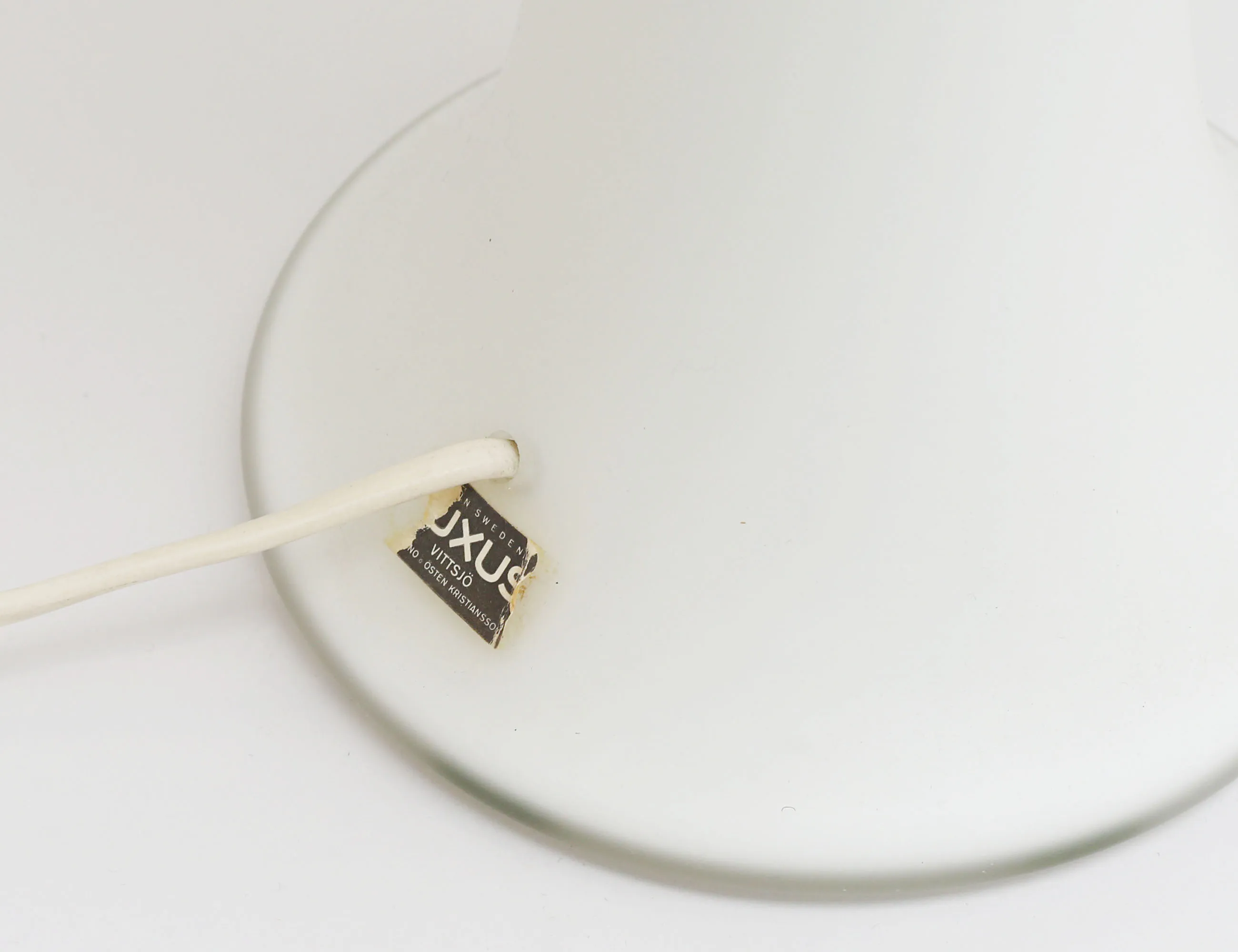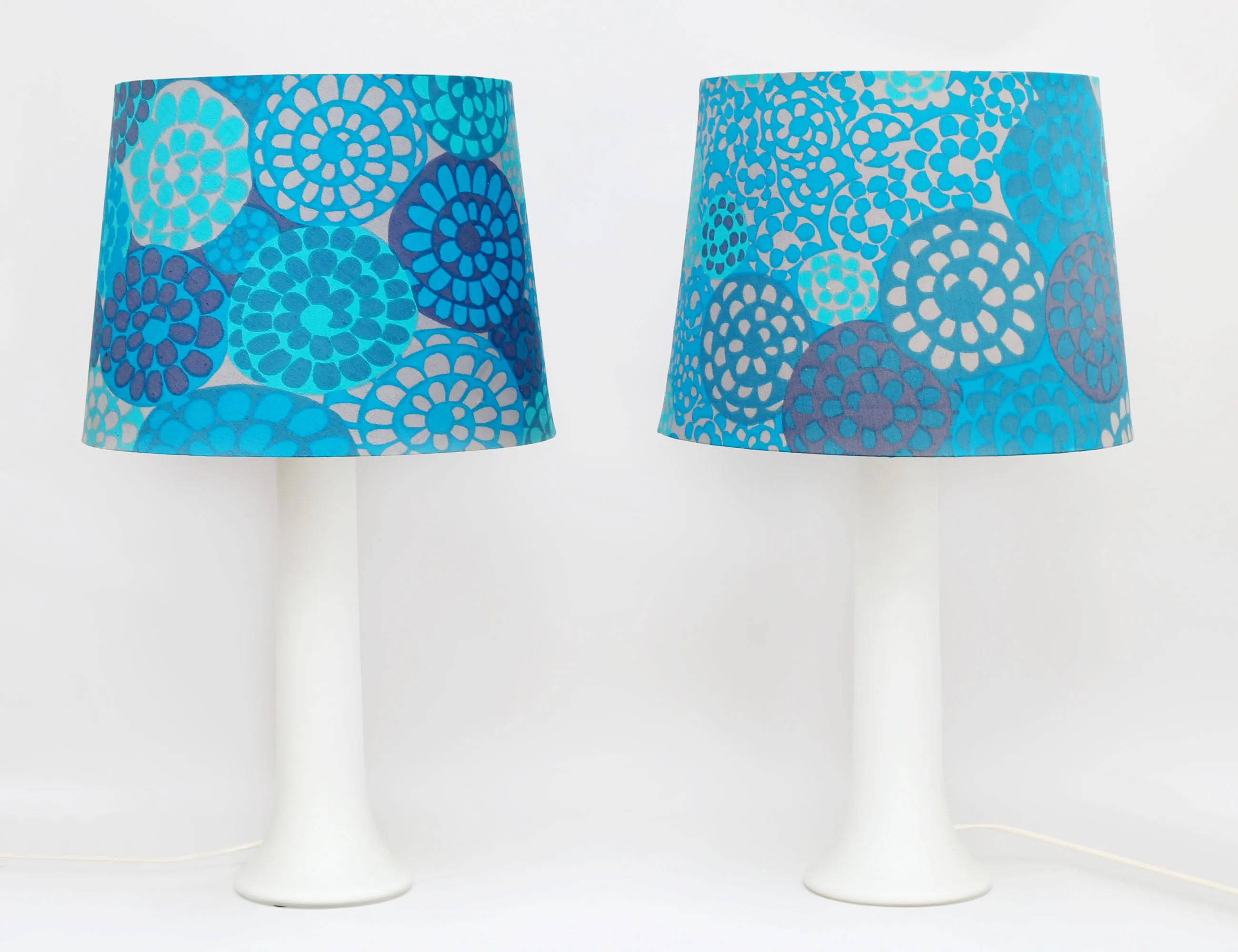 Uno & Östen Kristiansson Luxus 1960-tal, fot i opalglas, innerskärm i vit plast, tygskärm i mönster "Kukka" av Marjatta Metsovaara, etikettmärkta, höjd 66