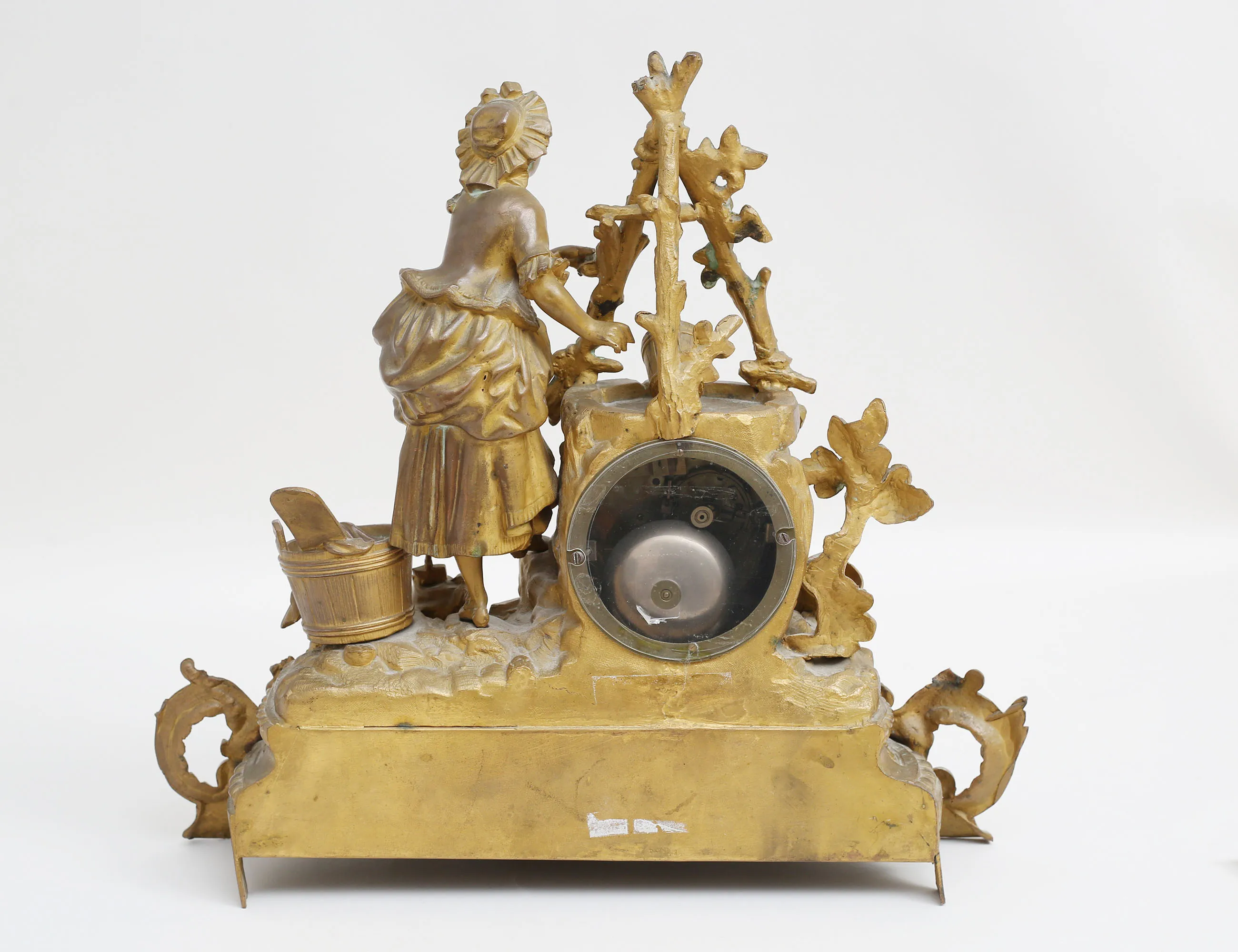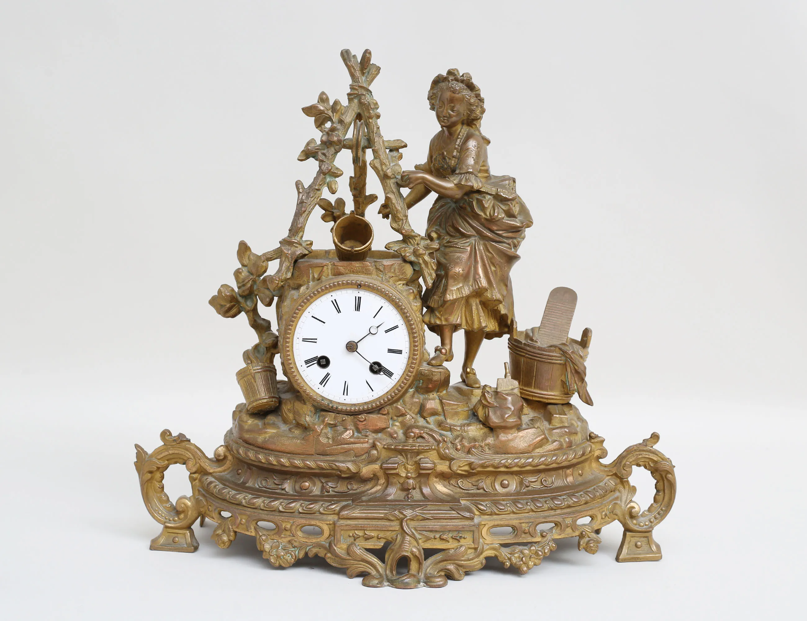 patinerad och skulpterad brons, krön av kvinna som tvättar, urtavla i emalj med romerska siffror, höjd 36, bredd 38