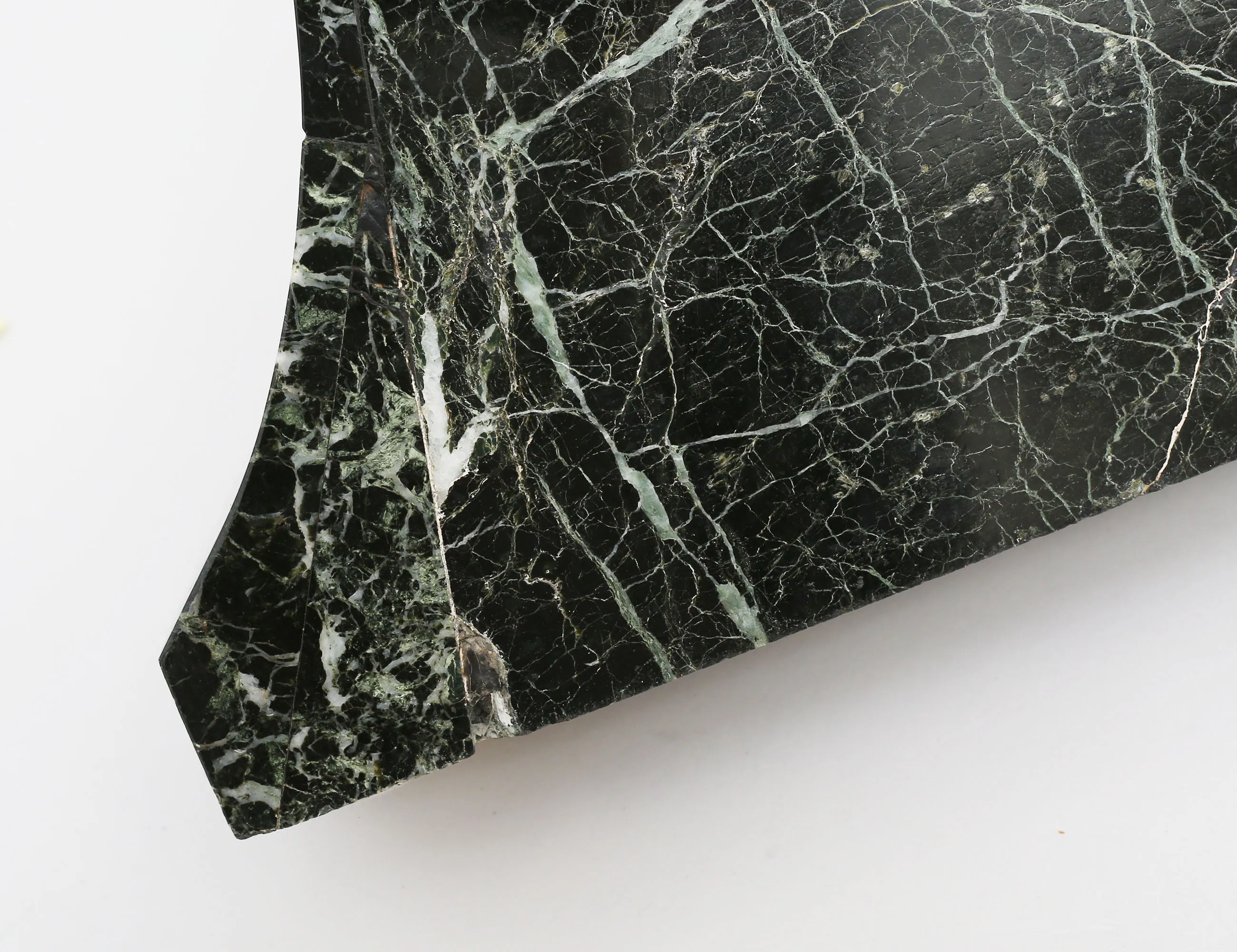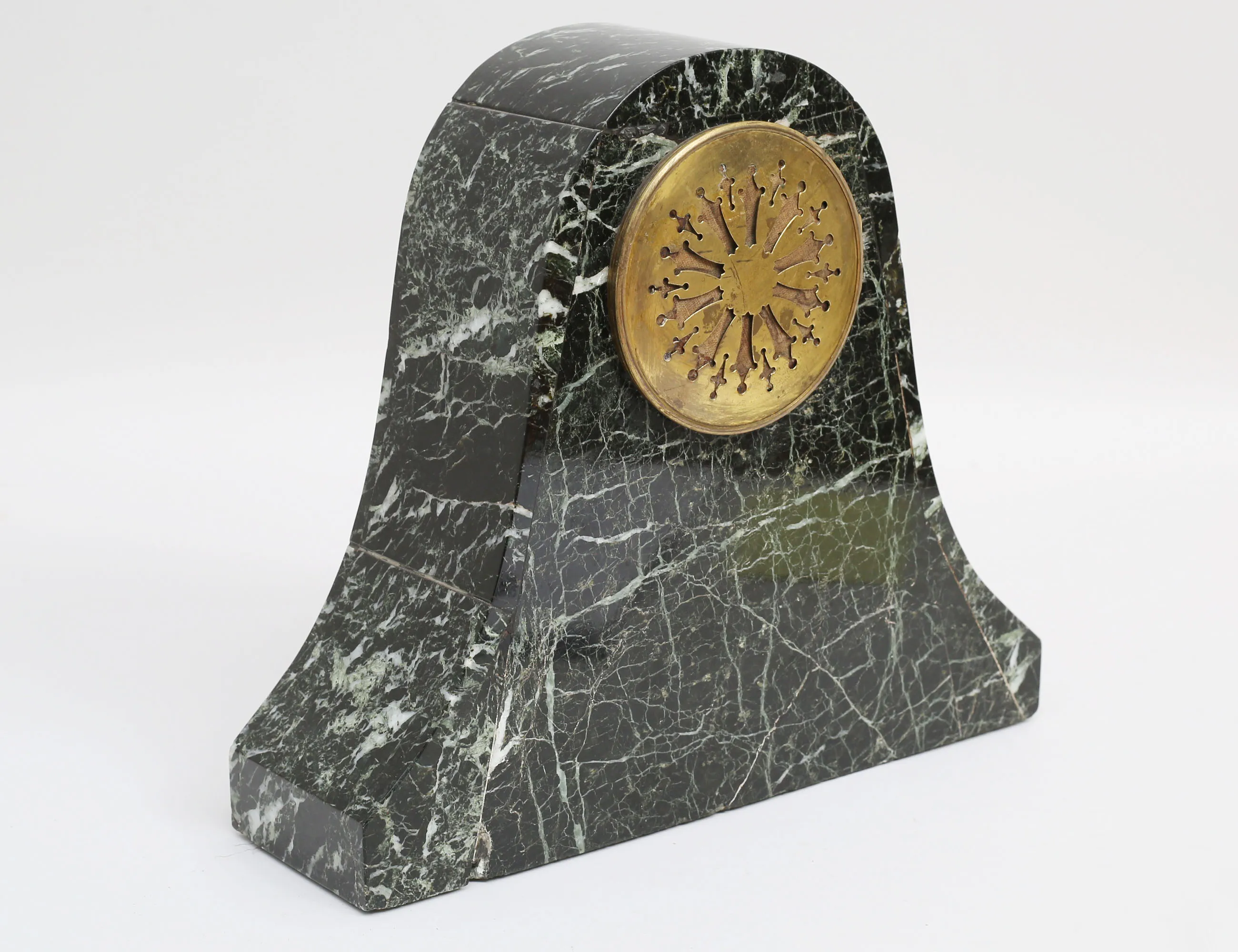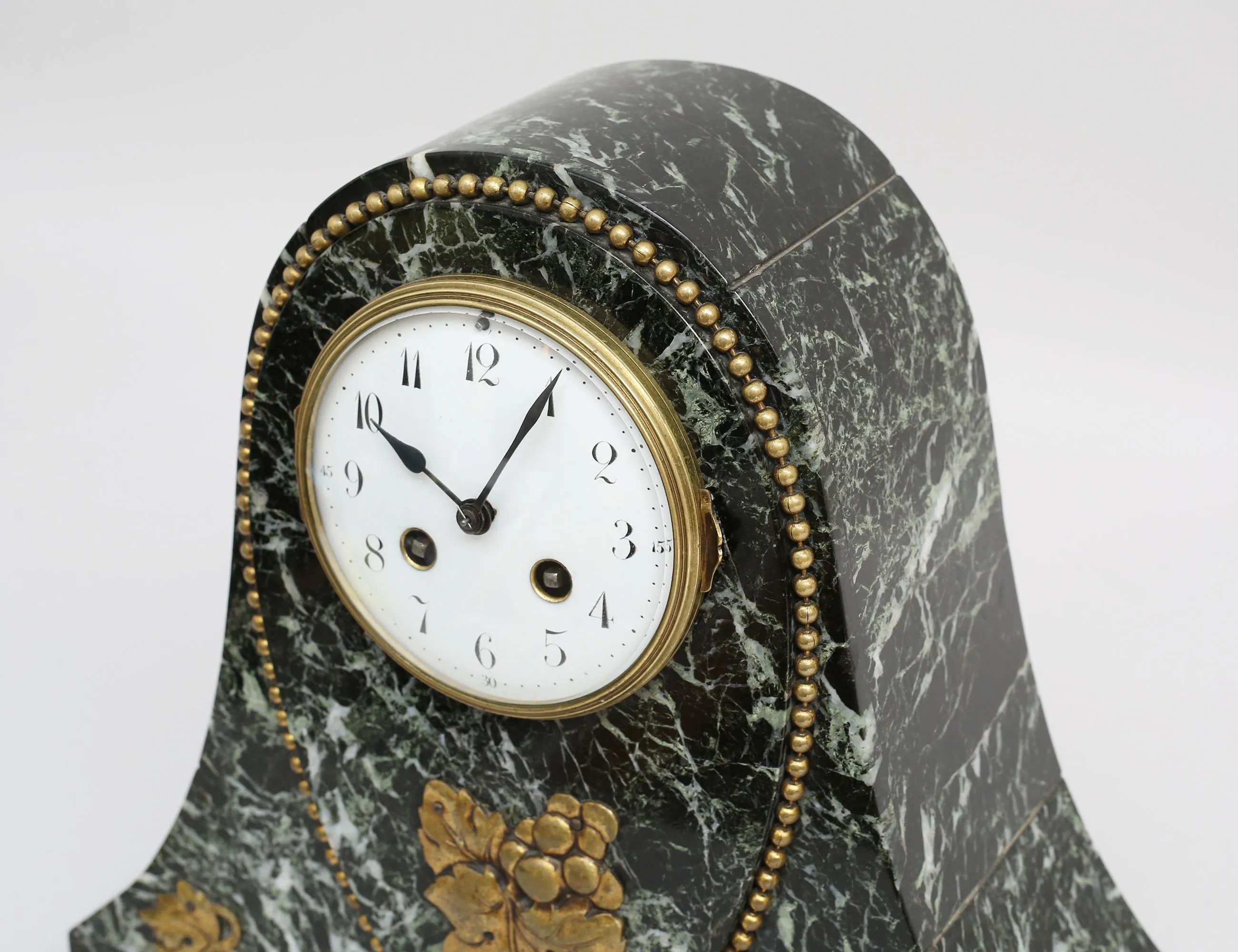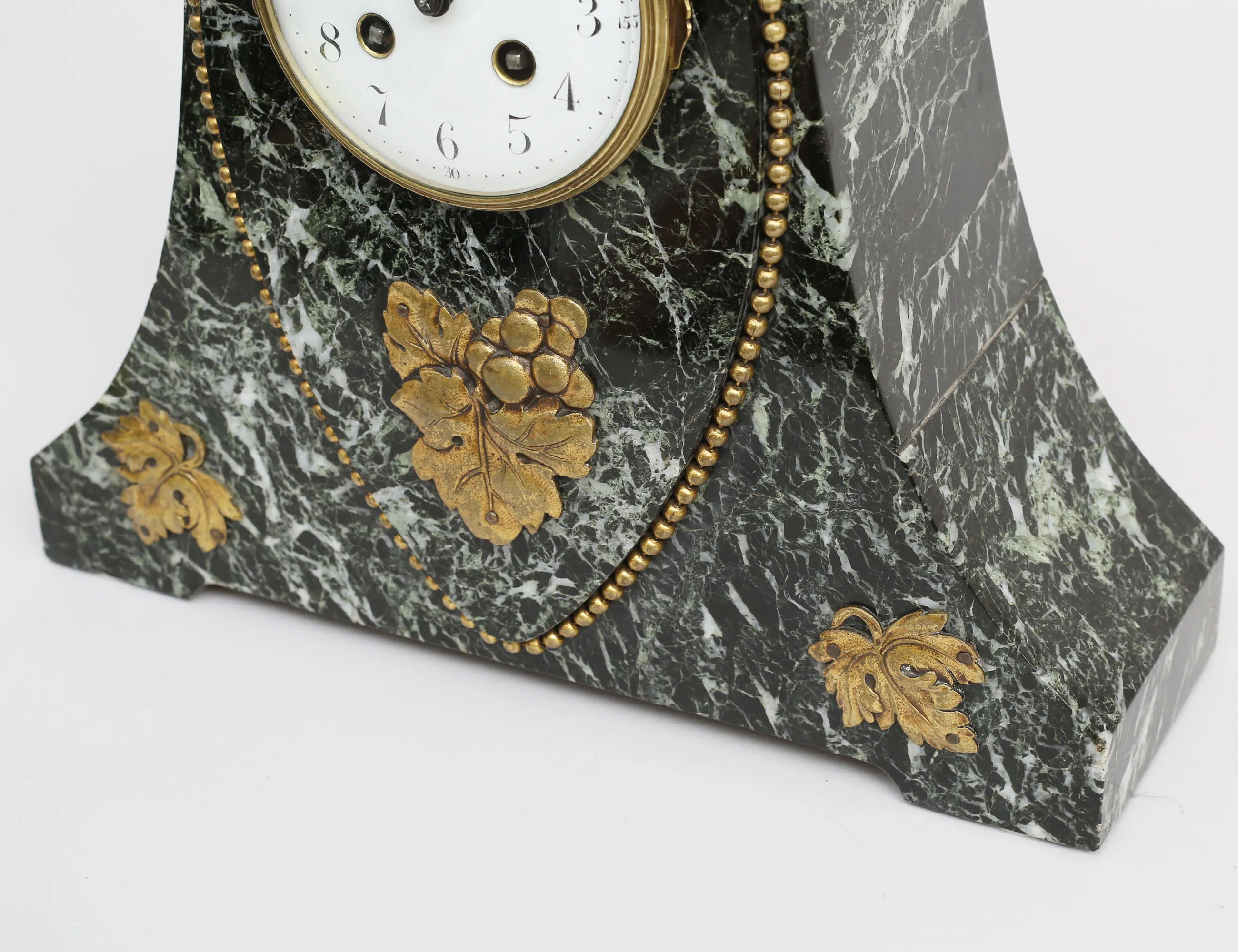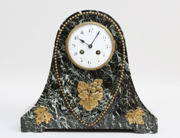 svart/grönmelerad marmor, detaljer av pärlstav och gjutna löv i mässing, nyckel finns, höjd 30, bredd 33
