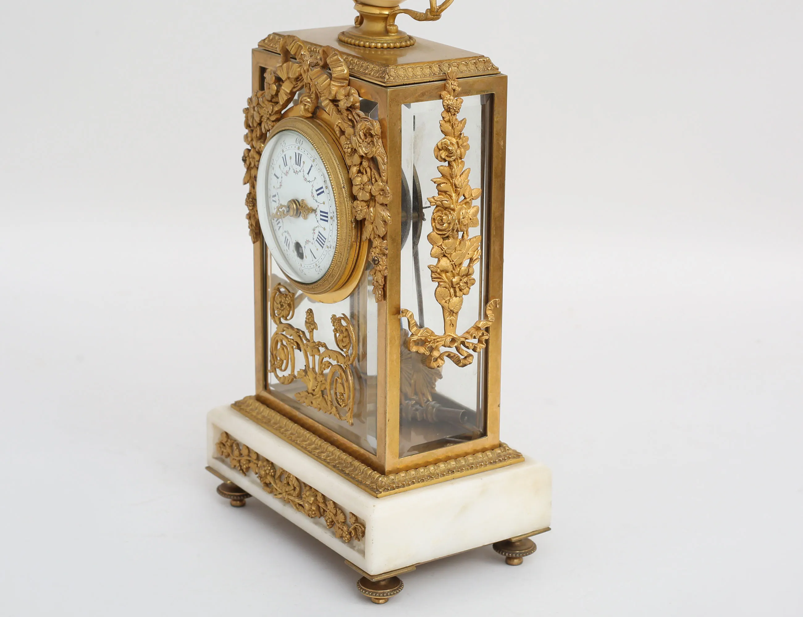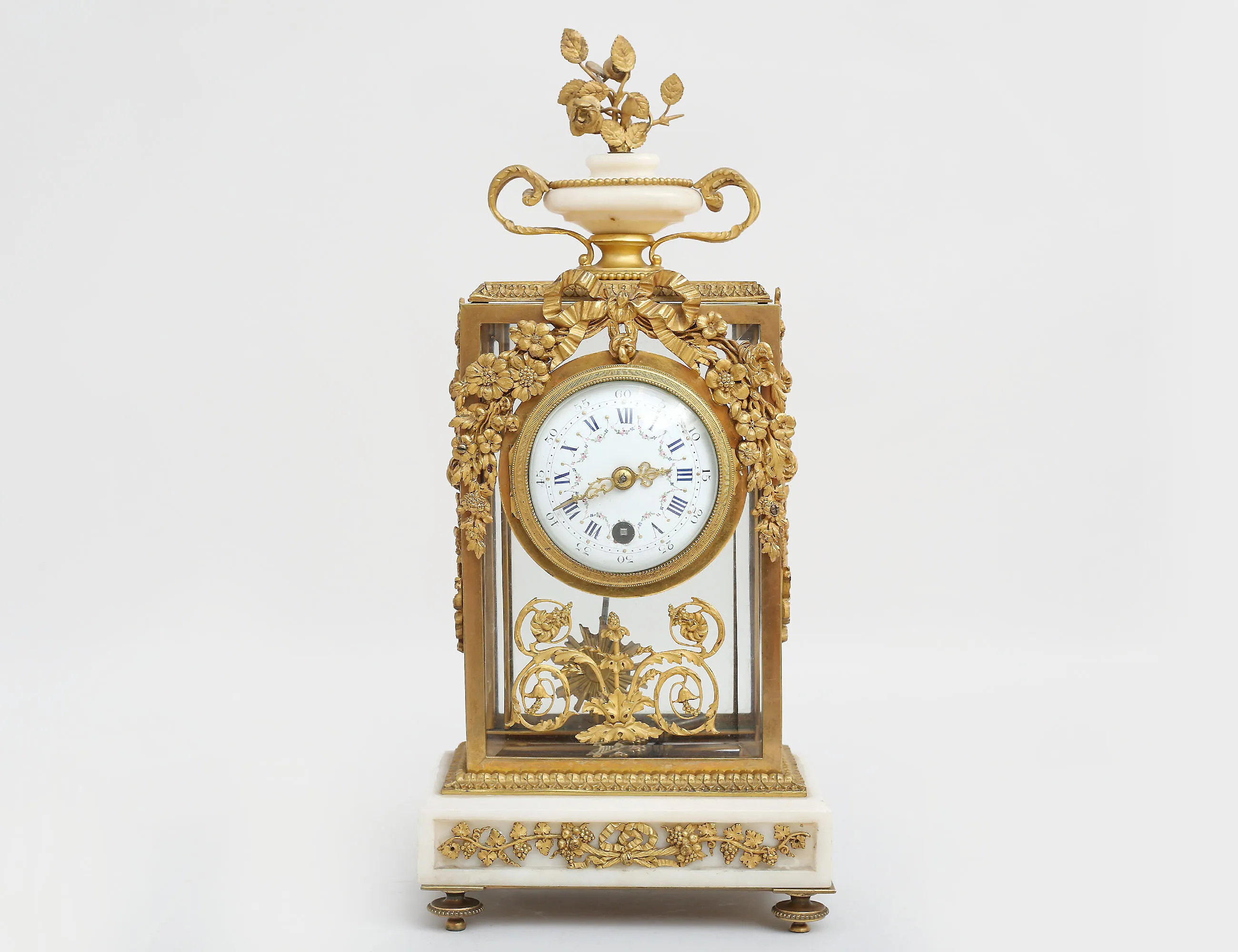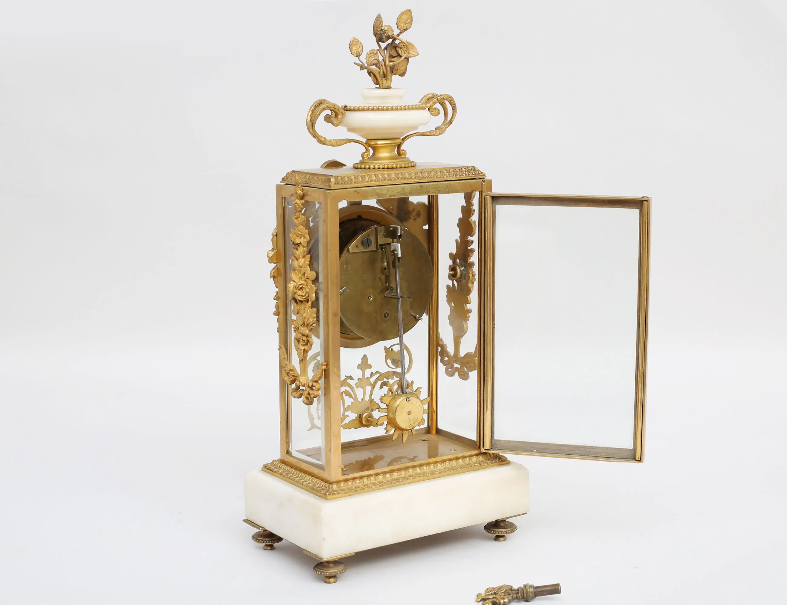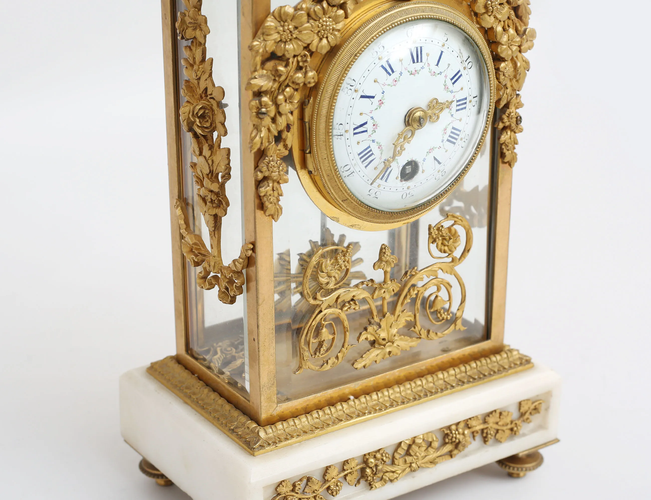 1800-talets mitt, brännförgylld brons och carrarramarmor, fasettslipat glas, krönande blomsterurna, rosetter och blomstergirlander, pendel i form av nordstjärnan, originalnyckel, emaljerad urtavla med polykrom blomsterdekor, guld och romerska siffror i blått , höjd 32, bredd 15 (emaljen med obetydliga nagg runt nyckelhålet, sidoornamenten monterade upp och ner)