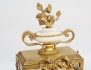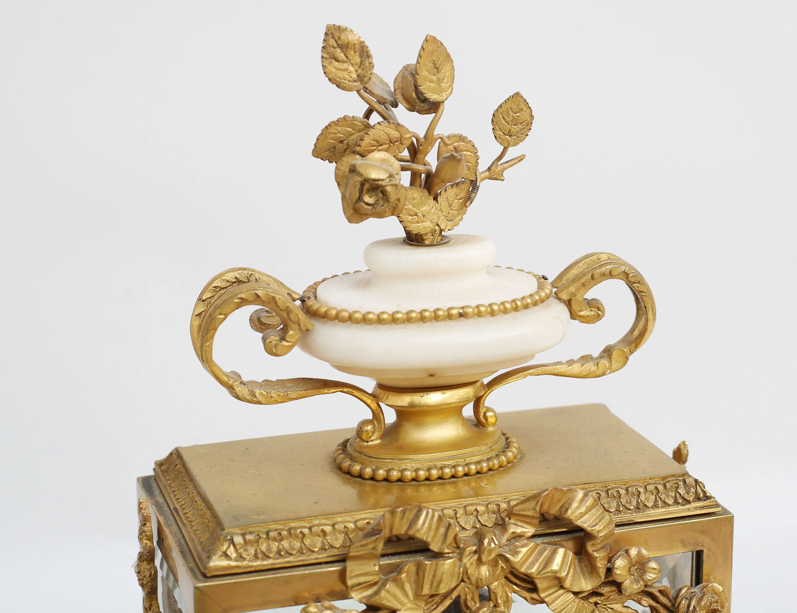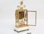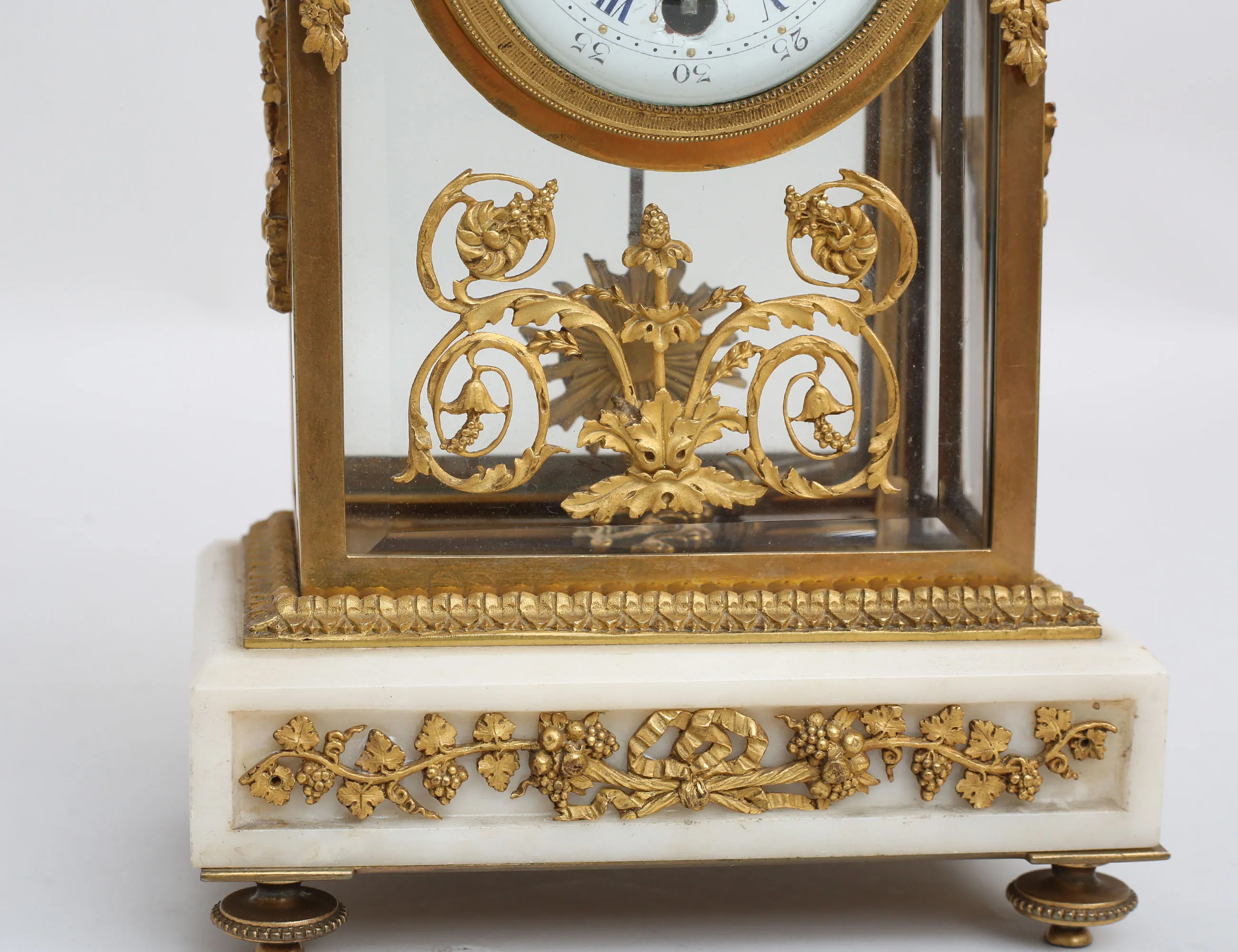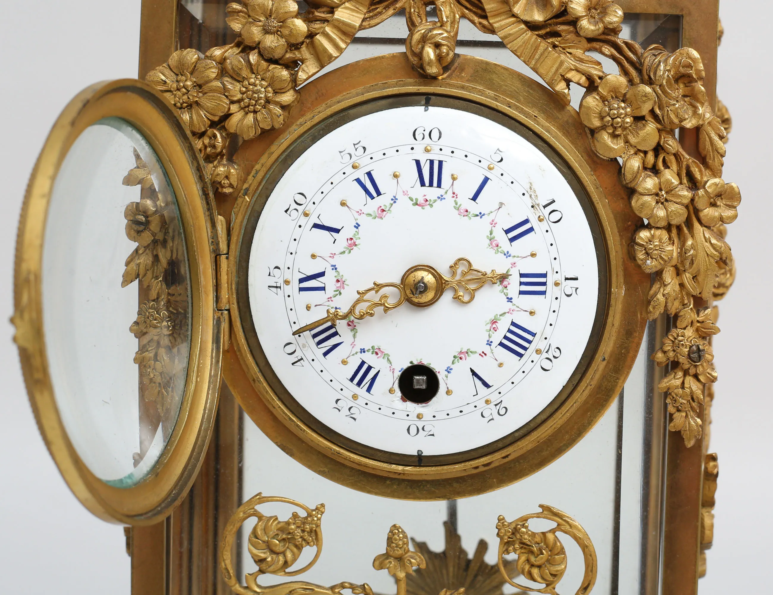 1800-talets mitt, brännförgylld brons och carrarramarmor, fasettslipat glas, krönande blomsterurna, rosetter och blomstergirlander, pendel i form av nordstjärnan, originalnyckel, emaljerad urtavla med polykrom blomsterdekor, guld och romerska siffror i blått , höjd 32, bredd 15 (emaljen med obetydliga nagg runt nyckelhålet, sidoornamenten monterade upp och ner)
