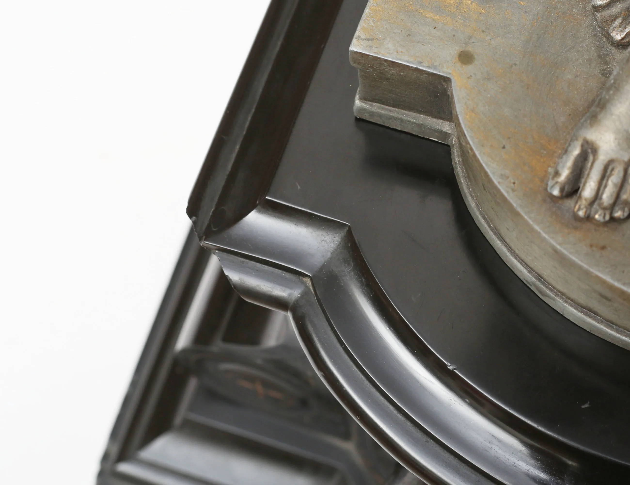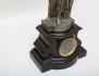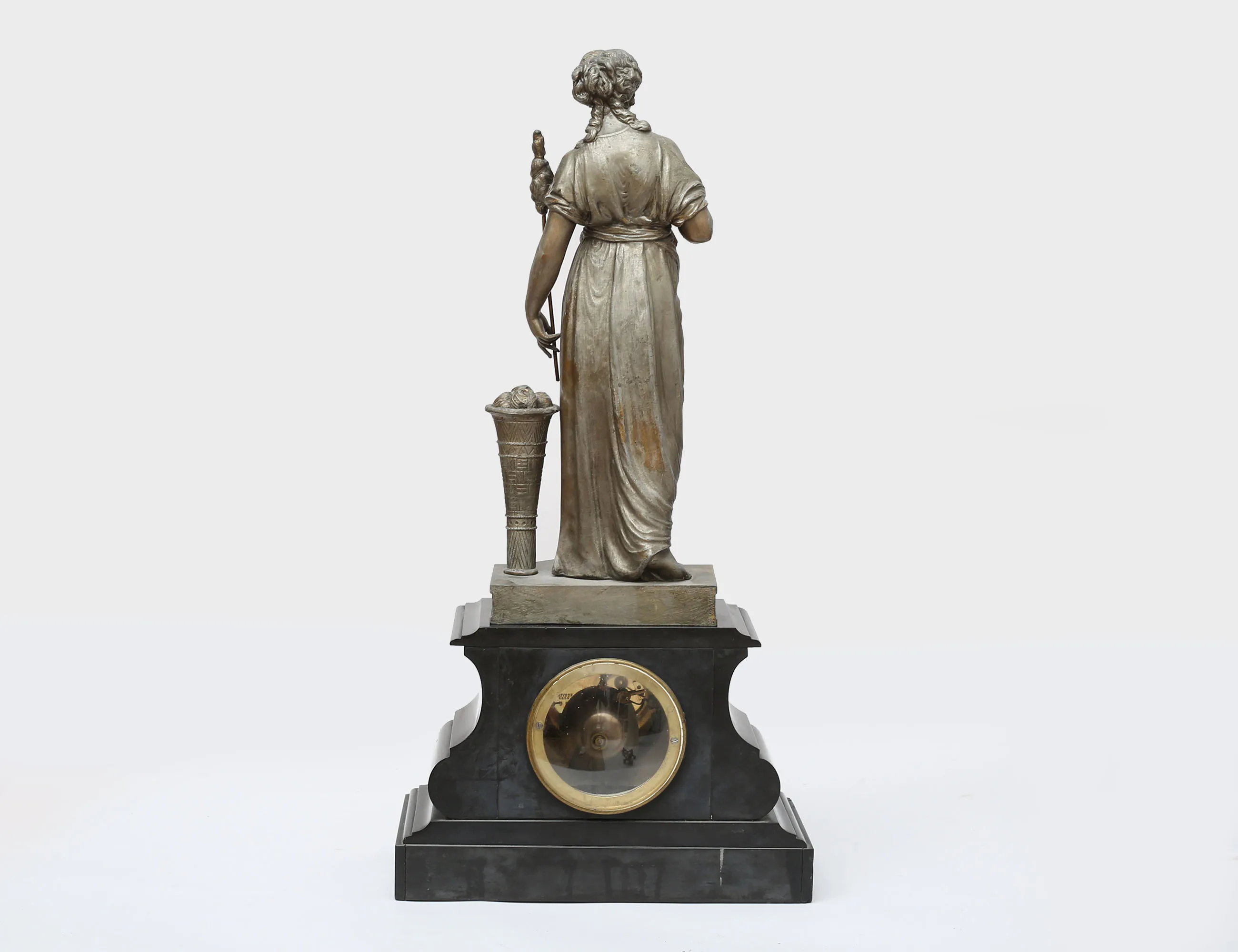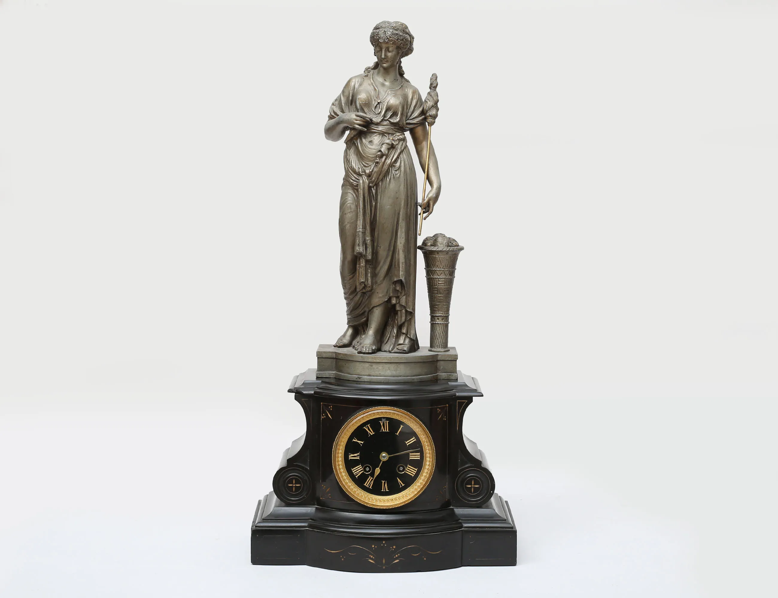 svart sten med graverad förgylld dekor, urtavla i förgylld mässing och romerska siffror, skulptur i form av spinnerska, gjuten metall, höjd 60, bredd 30 (avslag, smärre nagg)