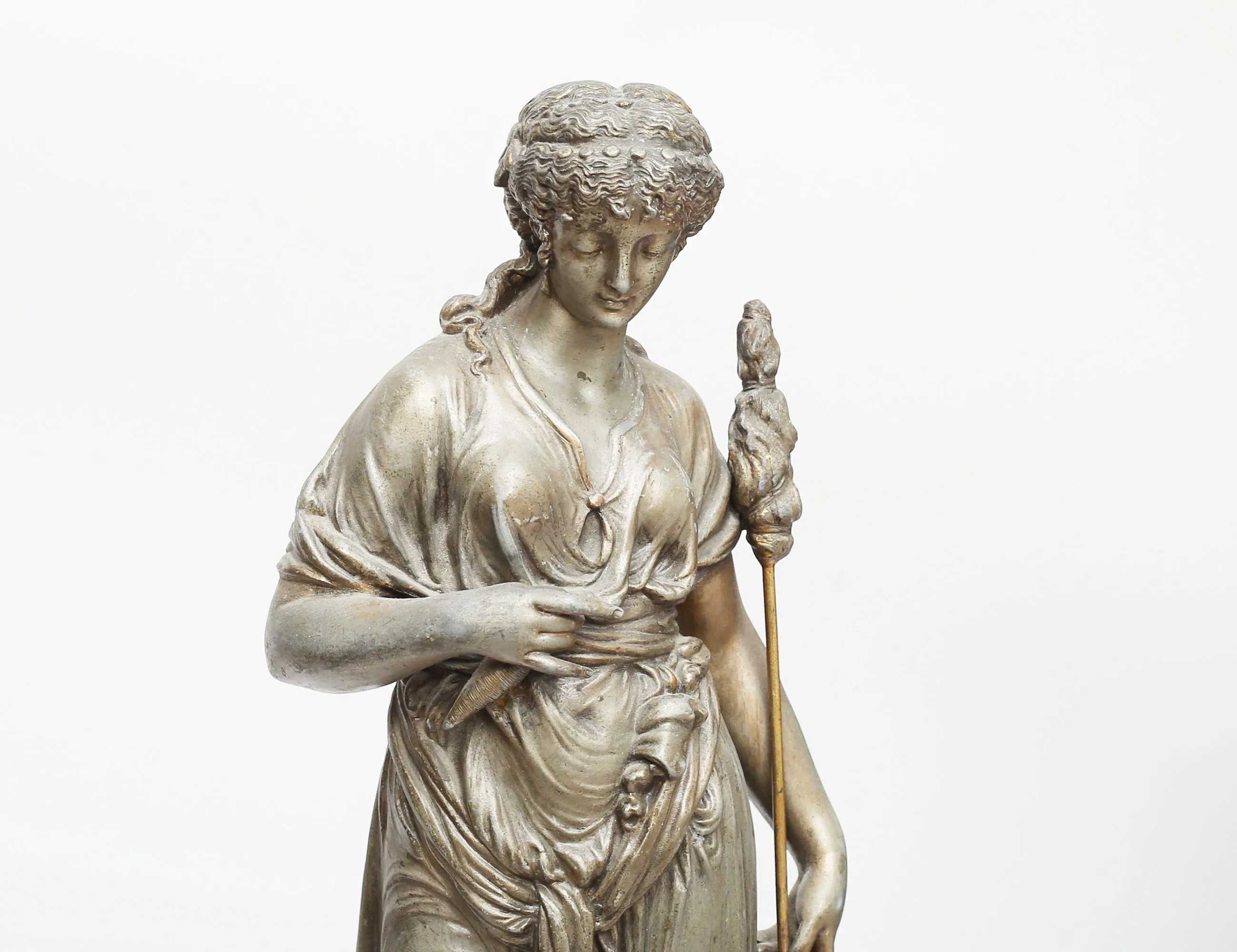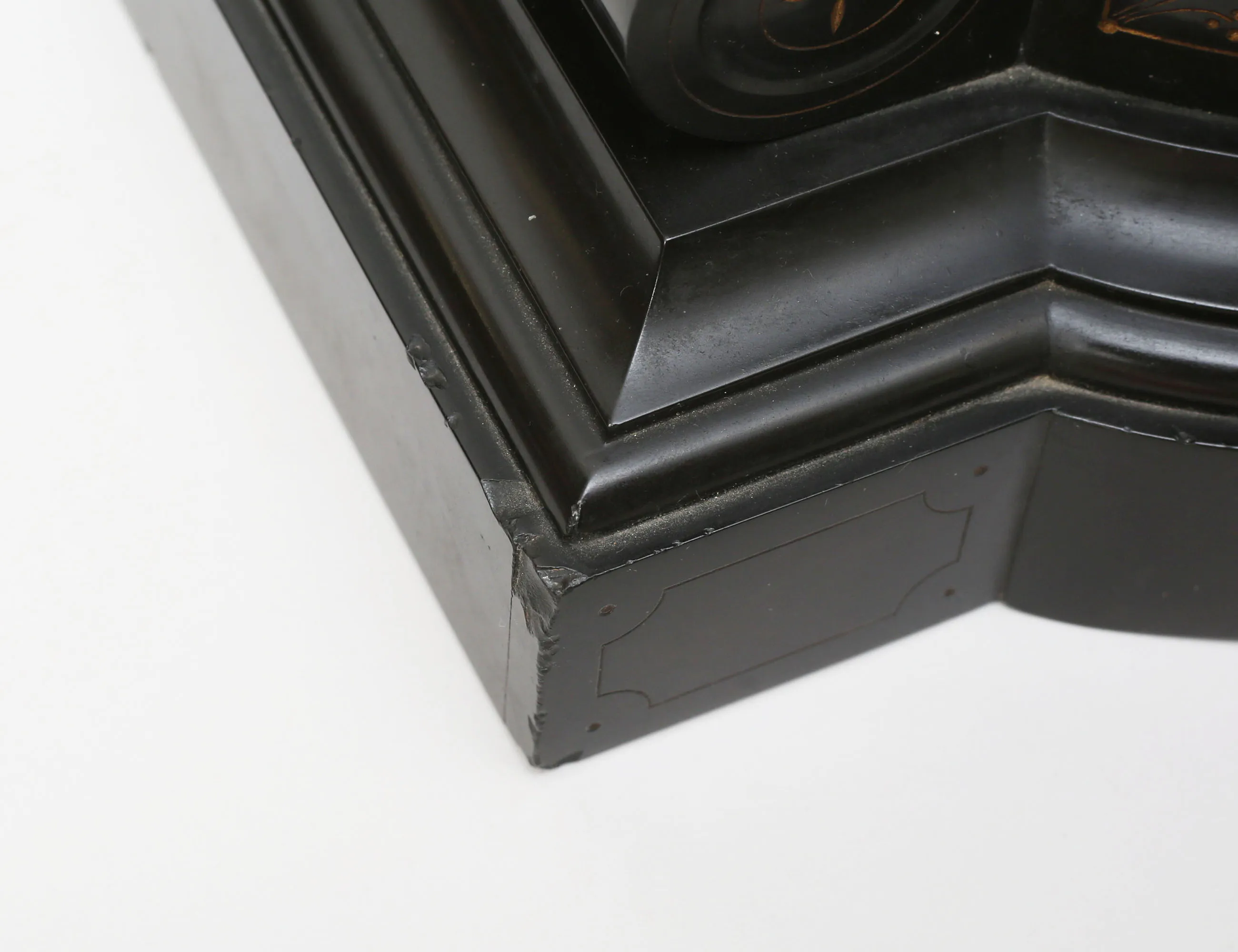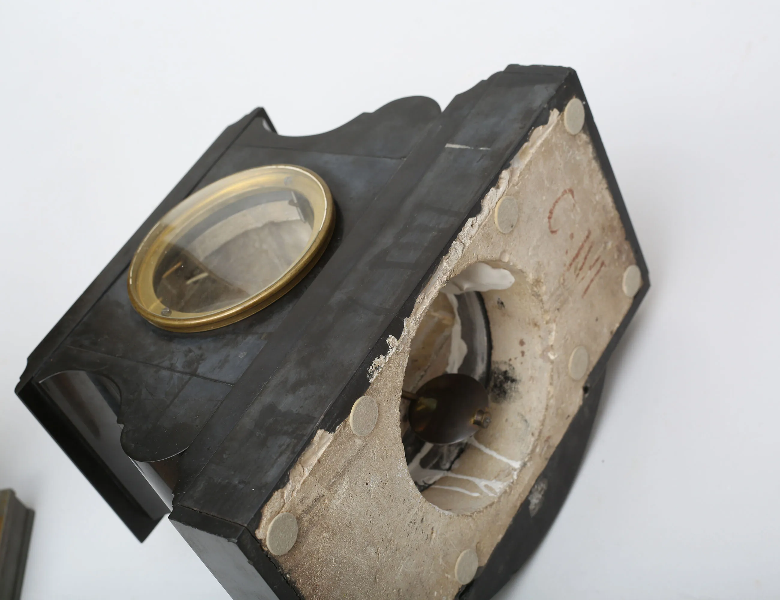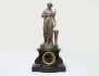 svart sten med graverad förgylld dekor, urtavla i förgylld mässing och romerska siffror, skulptur i form av spinnerska, gjuten metall, höjd 60, bredd 30 (avslag, smärre nagg)