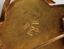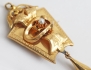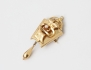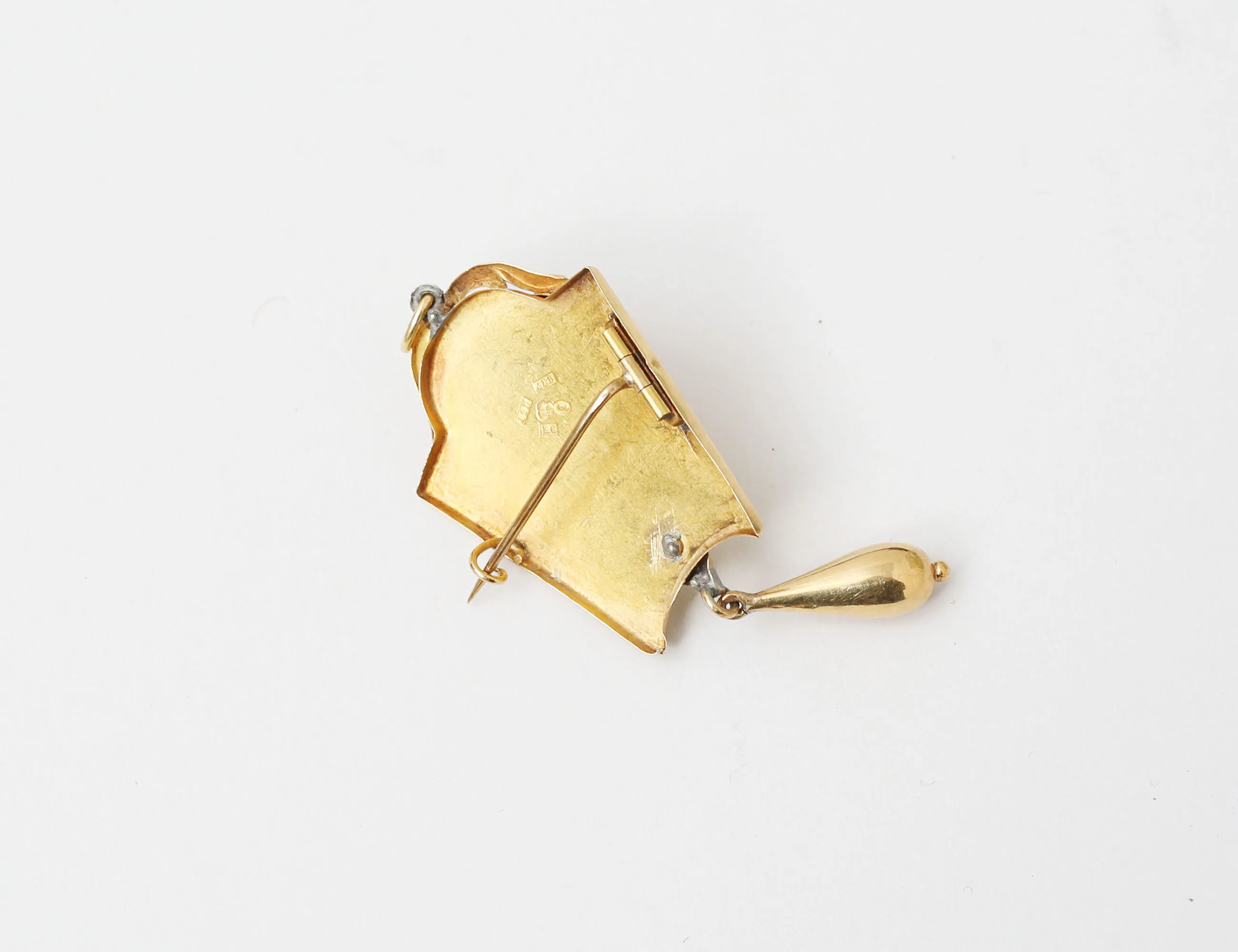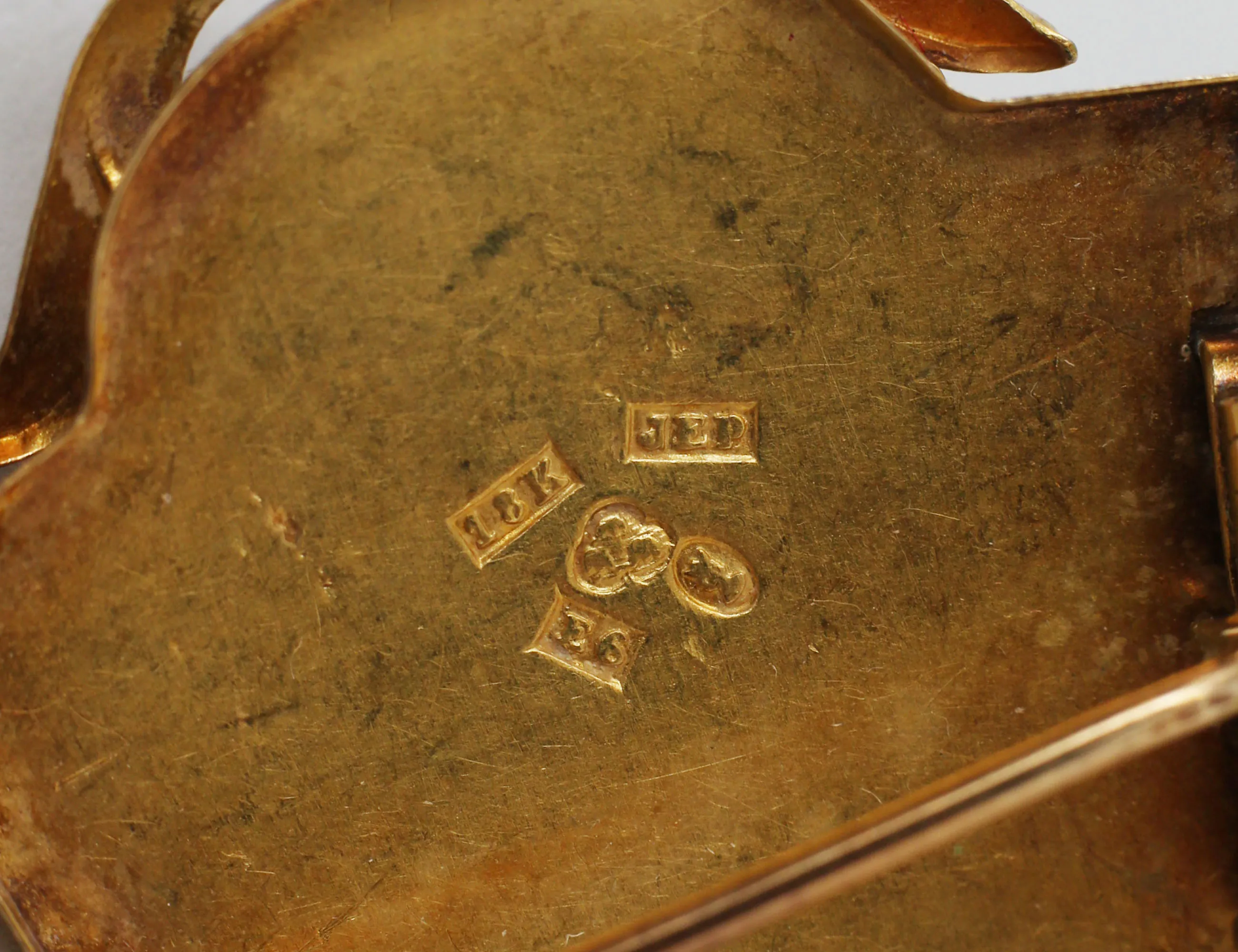 JEP Stockholm 1883, rikt graverad dekor, innefattad orientalisk pärla samt droppformad kläpp, stämplad JEP Stockholm 1883, vikt 5,67 gram, 5,5x3 cm (obetydlig tennlagning vid kläppen)