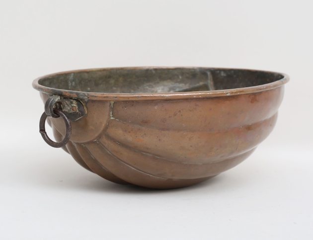 aladåbform, koppar, hamrat brudgåvomonogram BPD i releif, ringfäste av järnssmide, invändigt förtennt, fint patina, ursprungligt skick, längd 30, bredd 24