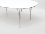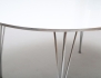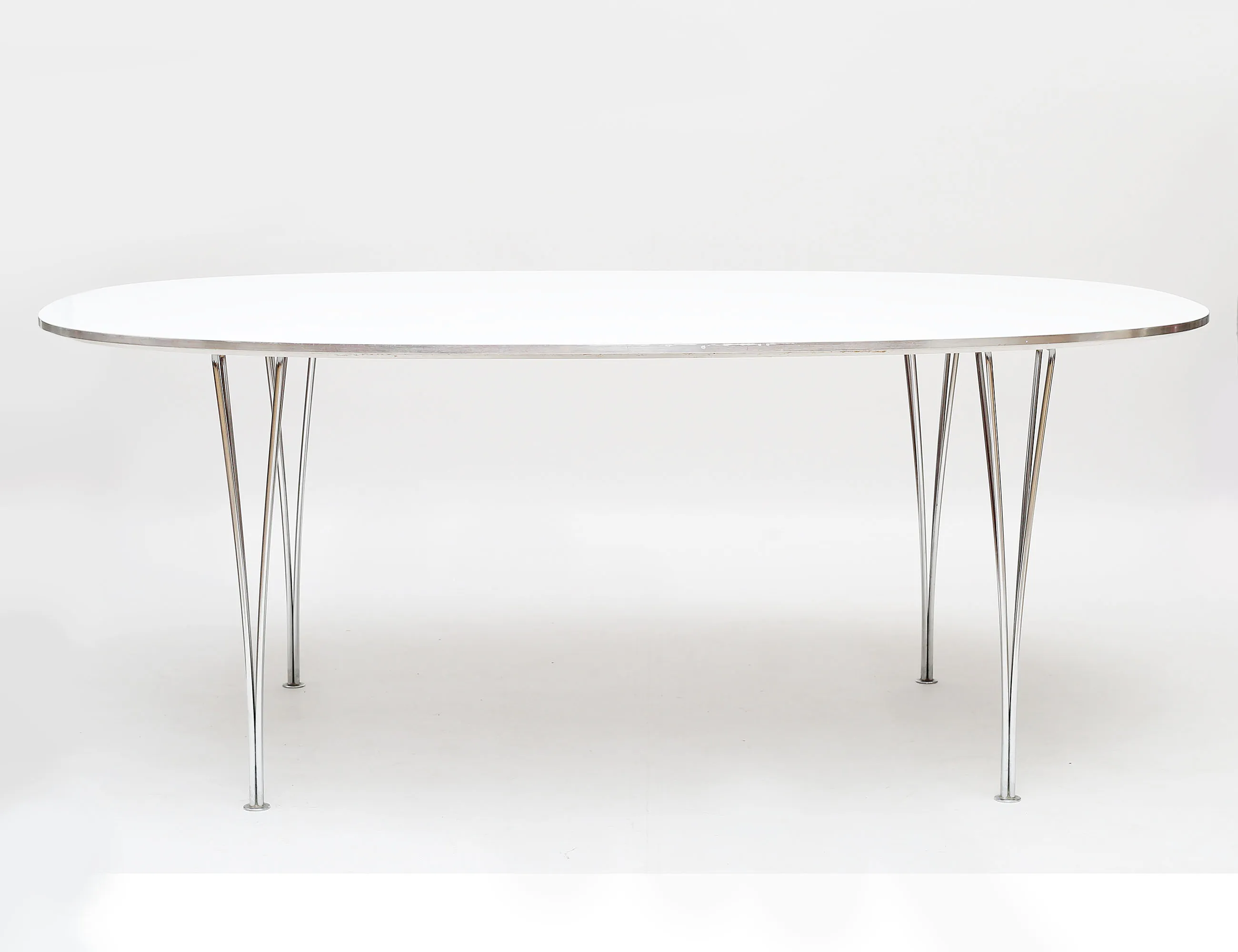 matbord "Superellips", Fritz Hansen Danmark, vit laminatskiva med kant i aluminium, kromade spännben, stämpelmärkt, höjd 70, bredd 180x120 (smärre bruksslitage)