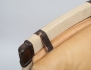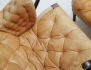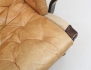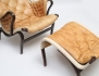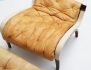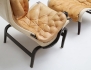 fåtölj med fotpall "Pernilla", 1900-talets andra hälft, mörkbetsat trä, canvas, djuphäftade dynor i ljust skinn, stämpelmärkt, höjd 98 (bruksslitage, fläckar, en läderrem med skada)