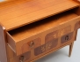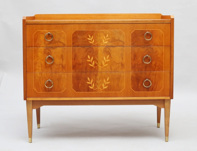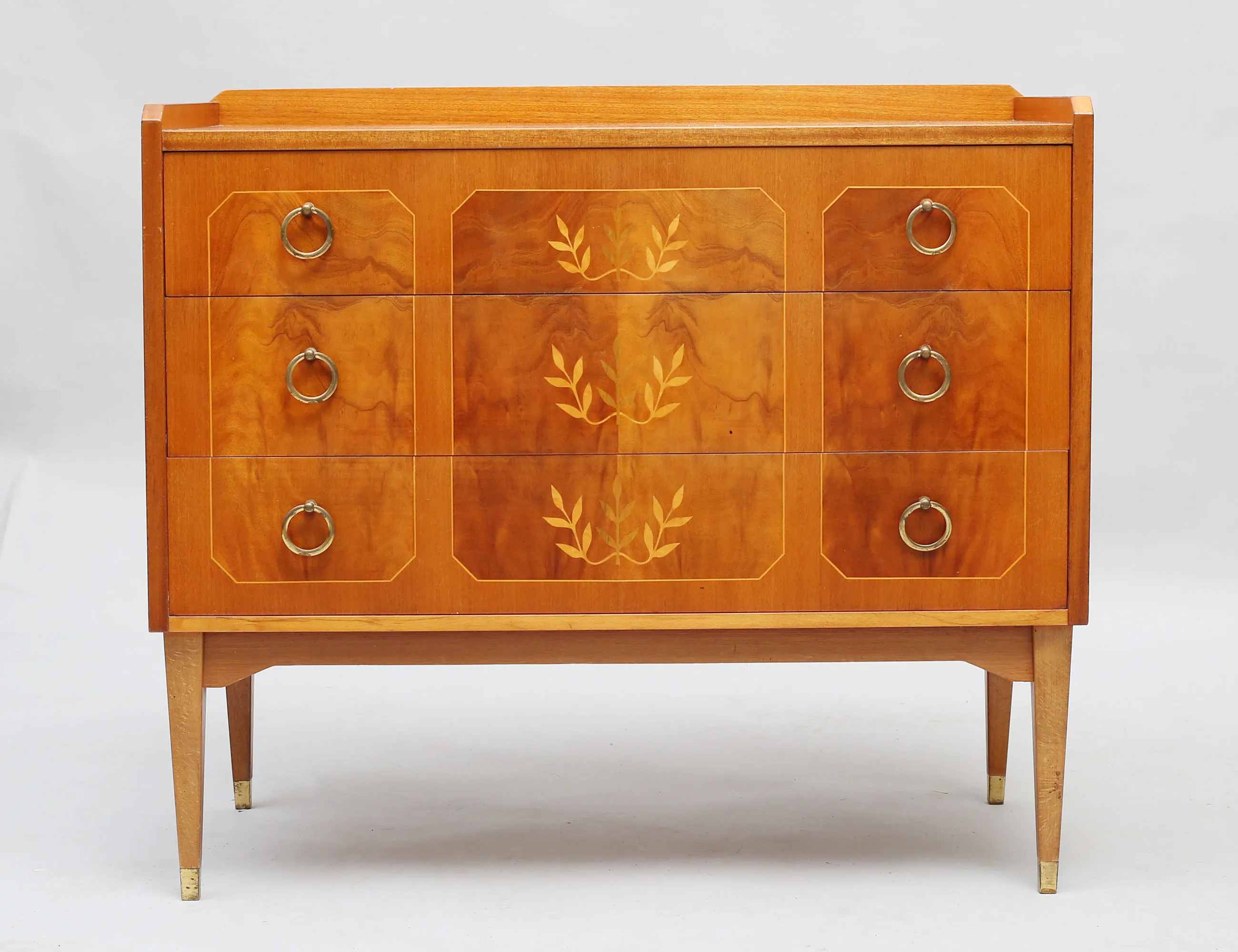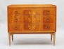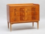 mahogny med stiliserad intarsiadekor, tre lådor, dragringar och fothylsor i mässing, höjd 73, bredd 85, djup 42