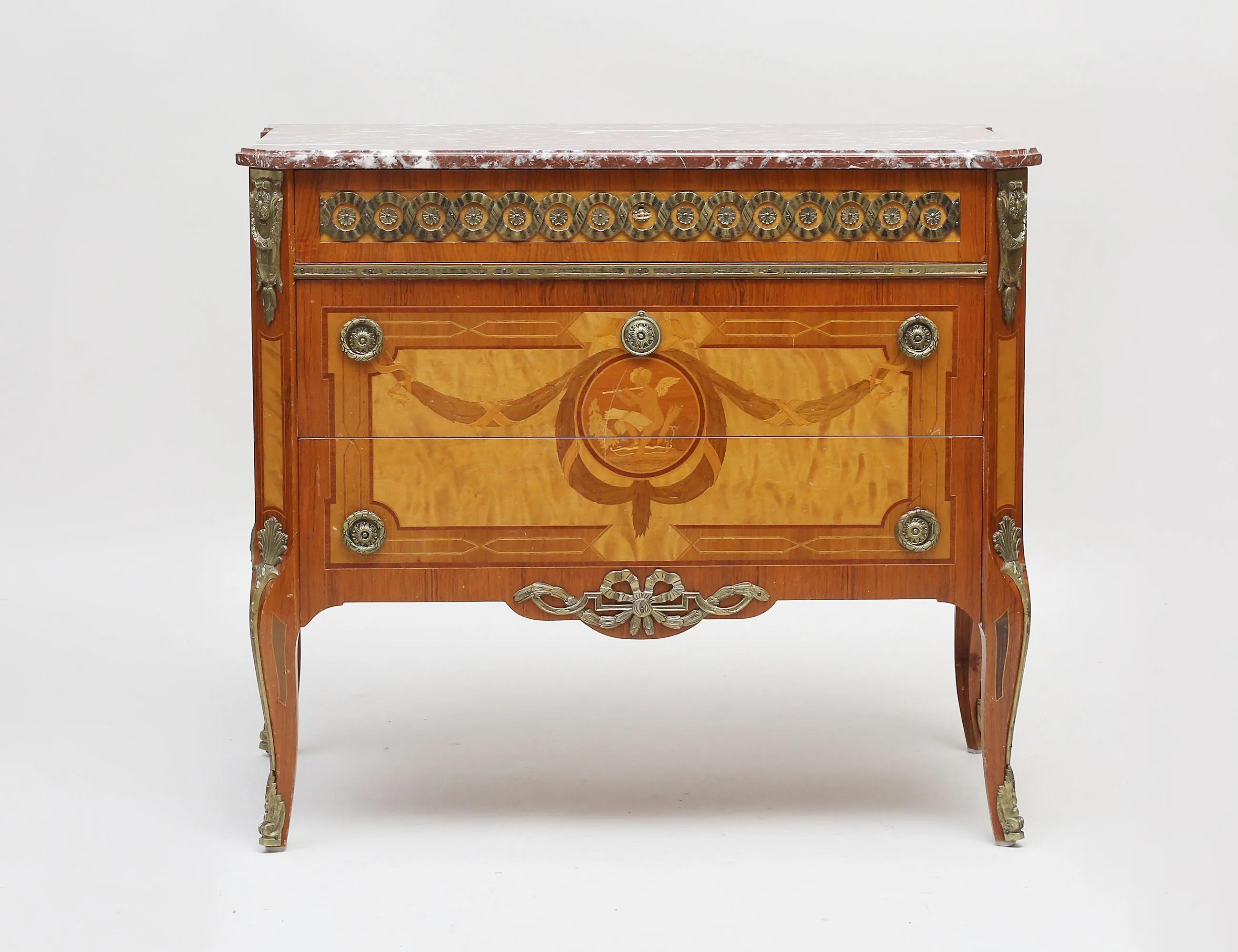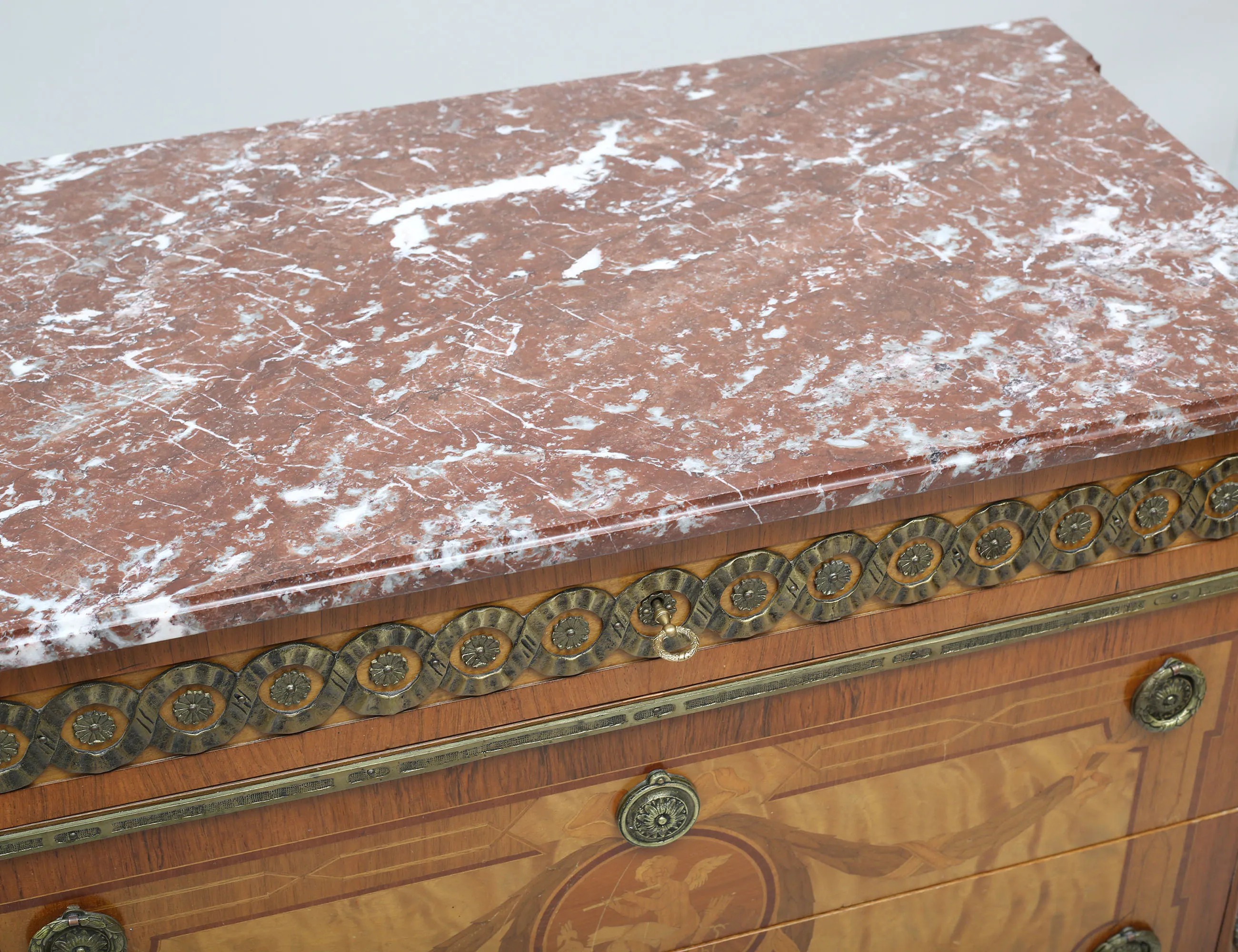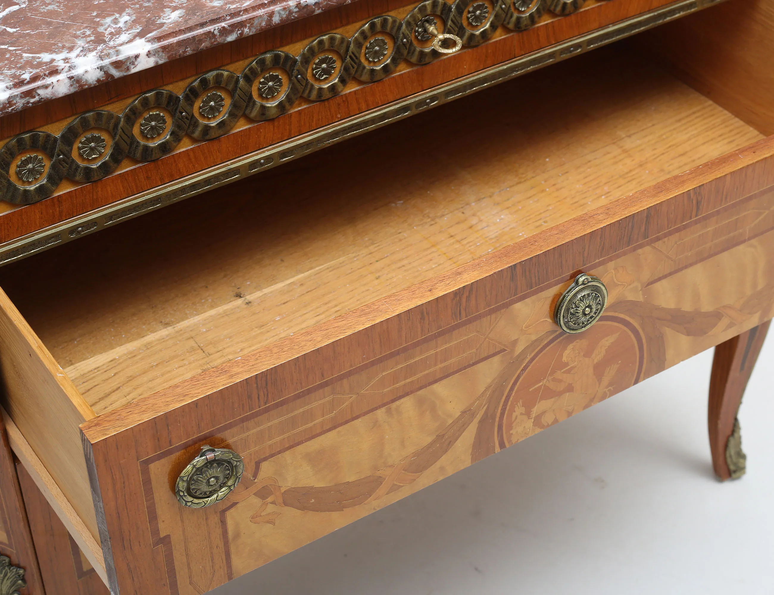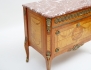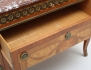 modell efter G. Haupt, fanerad i olika träslag, intarsia, tre lådor, ornament och beslag i mässing, profilerad marmorskiva, höjd 83, bredd 93, djup 51