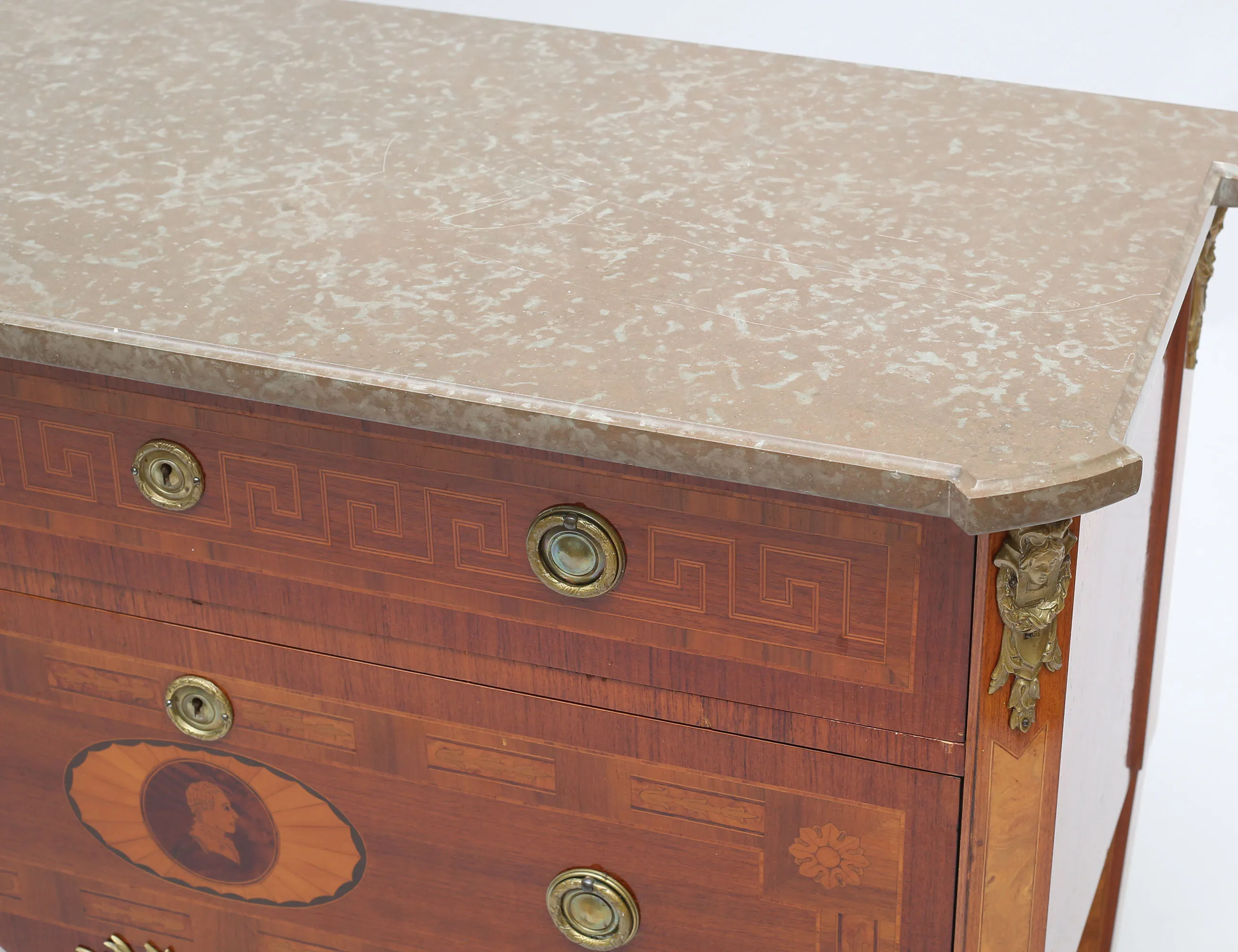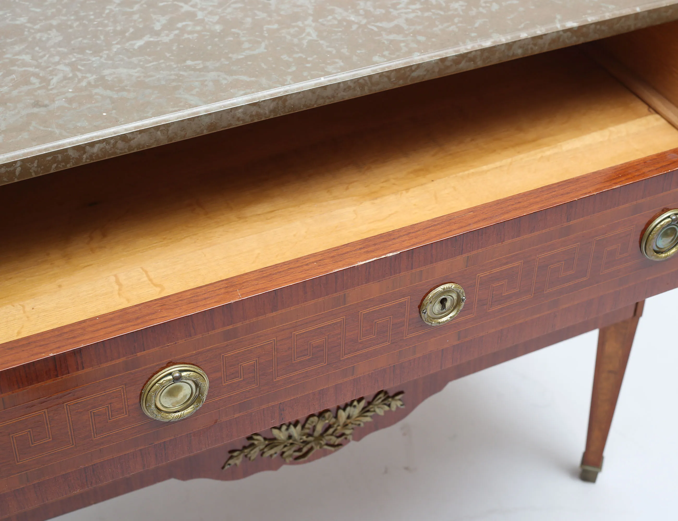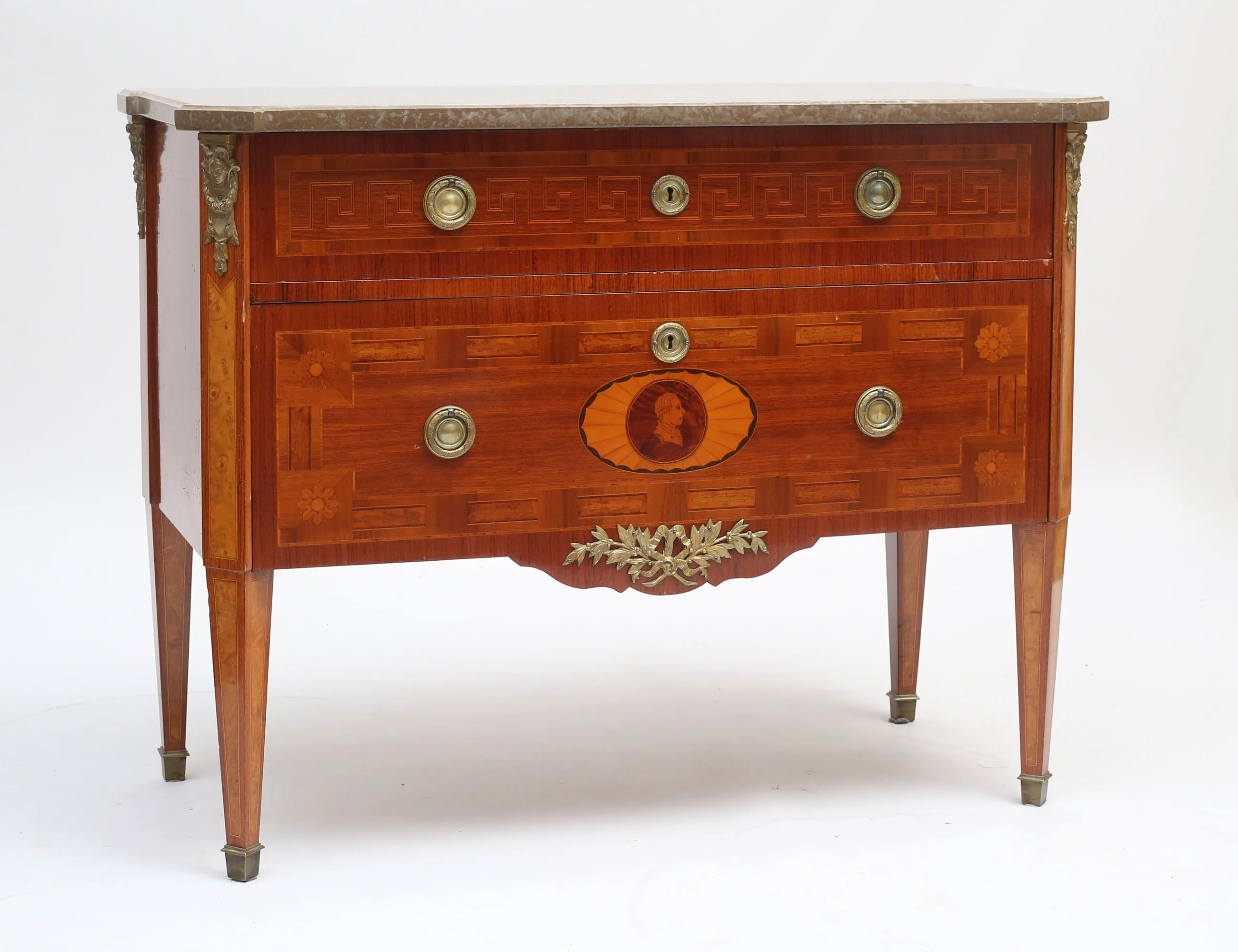 fanerad i olika träslag, intarsia, beslag och ornament i gjuten mässing, två lådor, skiva i profilerad kalksten, höjd 81, bredd 104, djup 49