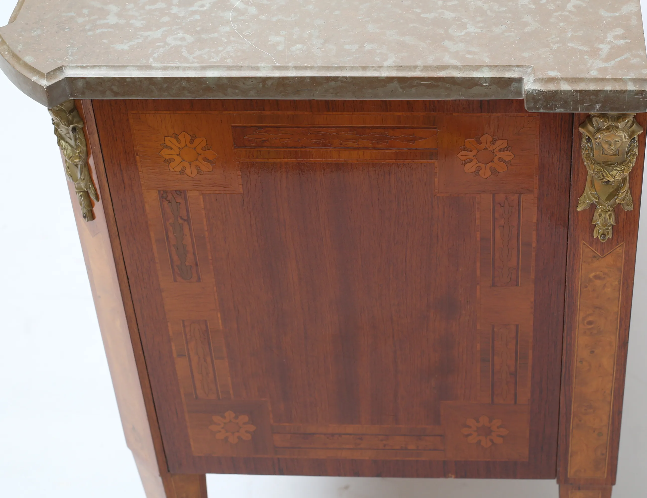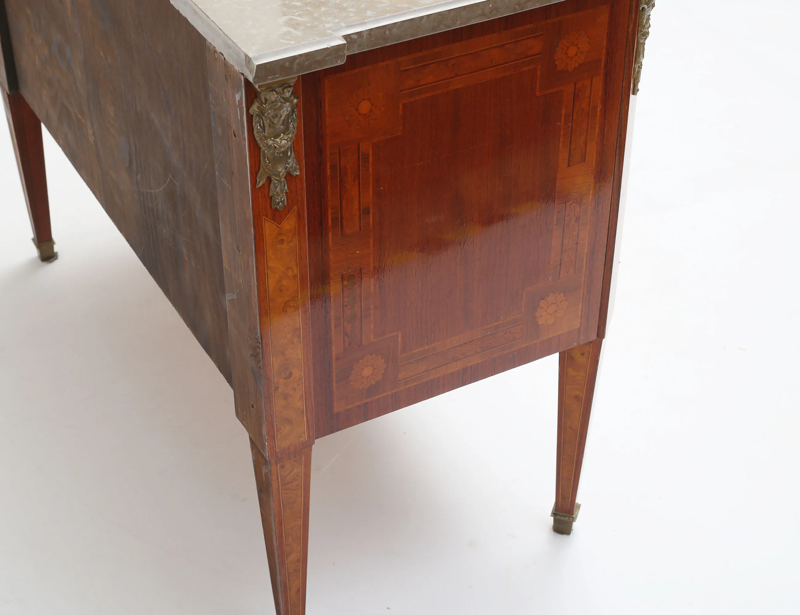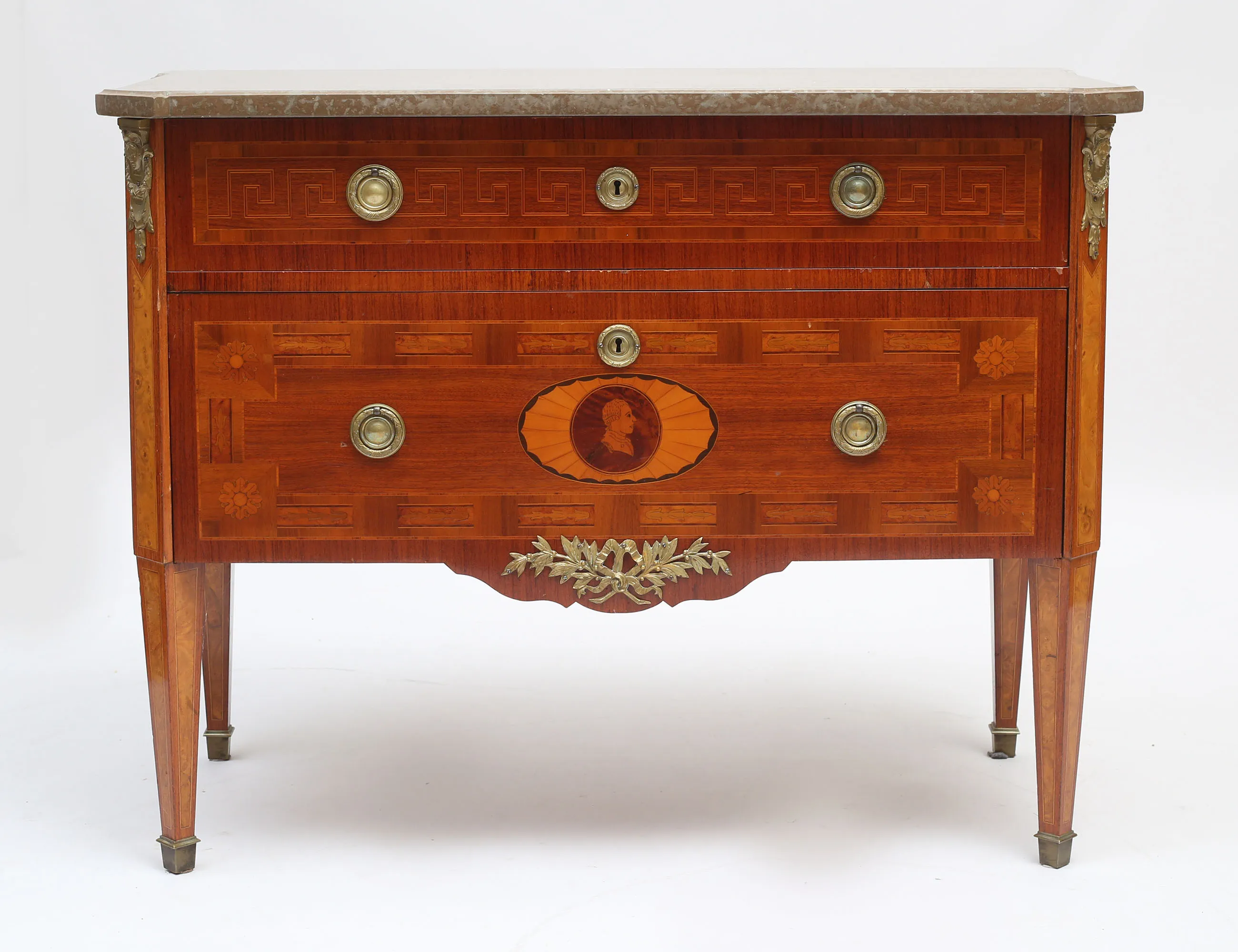 fanerad i olika träslag, intarsia, beslag och ornament i gjuten mässing, två lådor, skiva i profilerad kalksten, höjd 81, bredd 104, djup 49