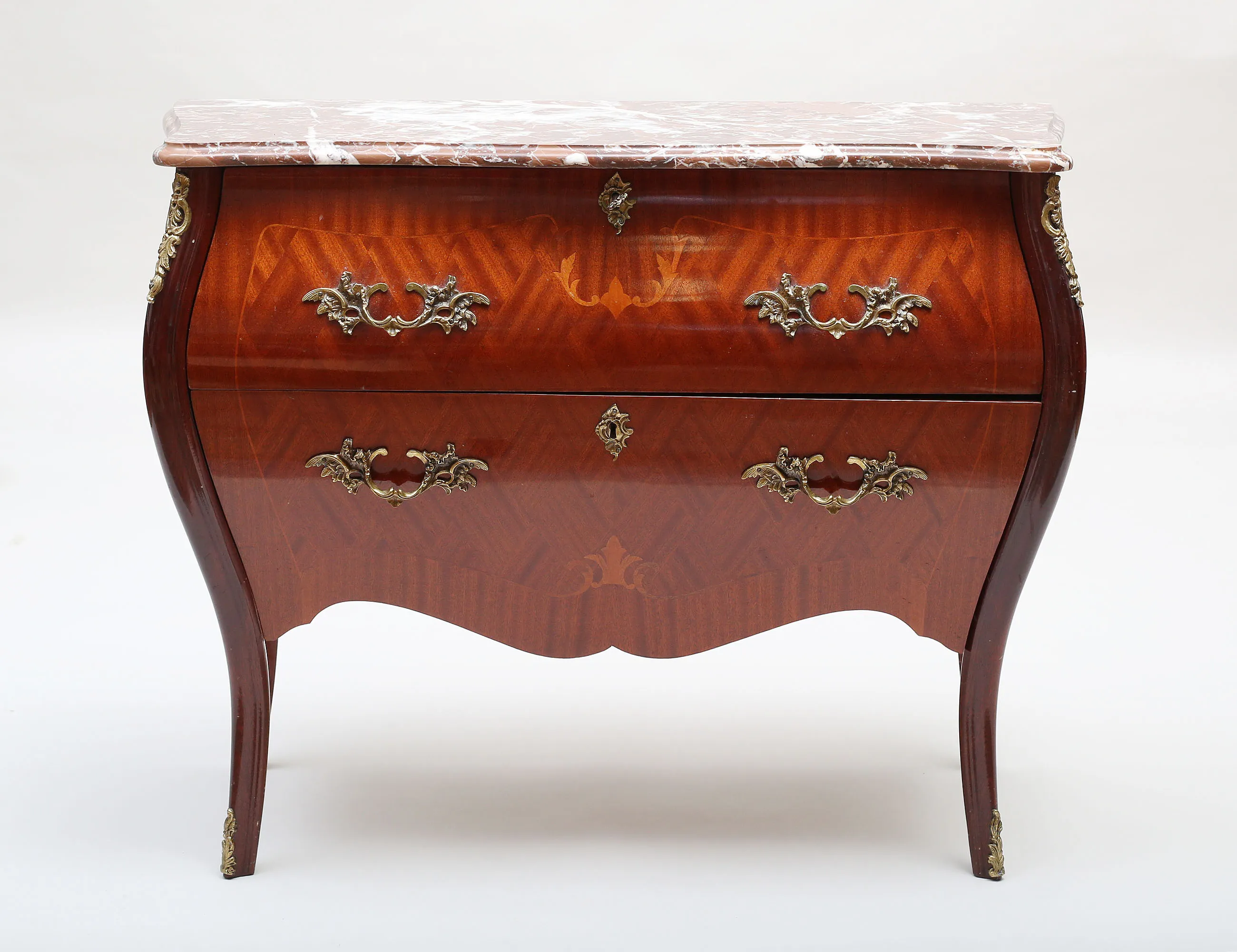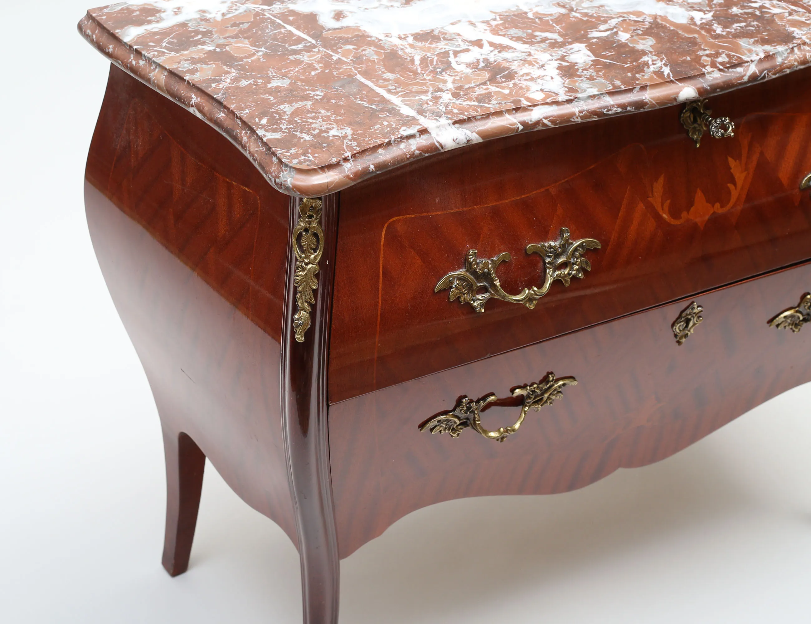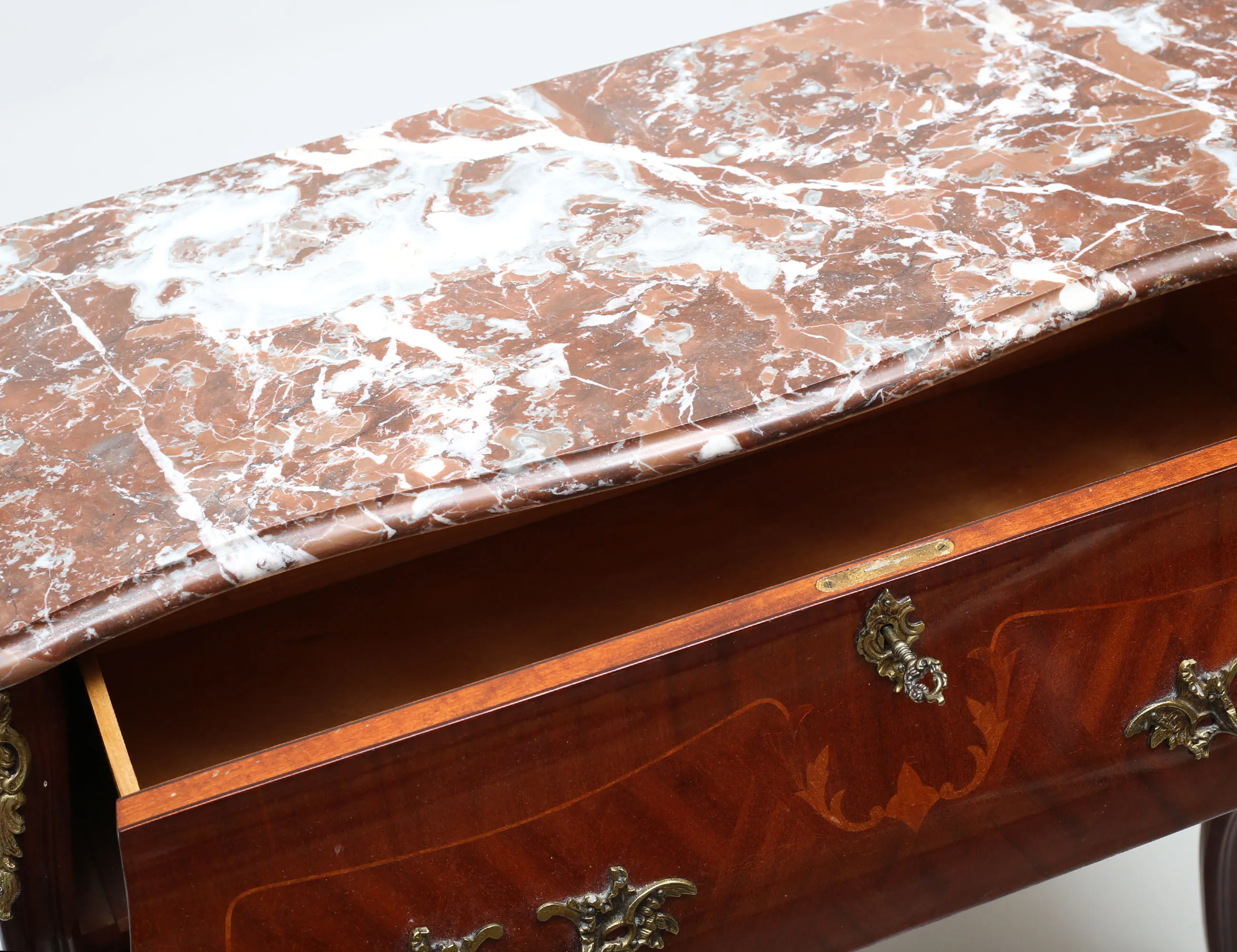 rutfanerad mahogny, två lådor, ornament i gjuten mässing, profilerad marmorskiva, höjd 71, bredd 90, djup 36