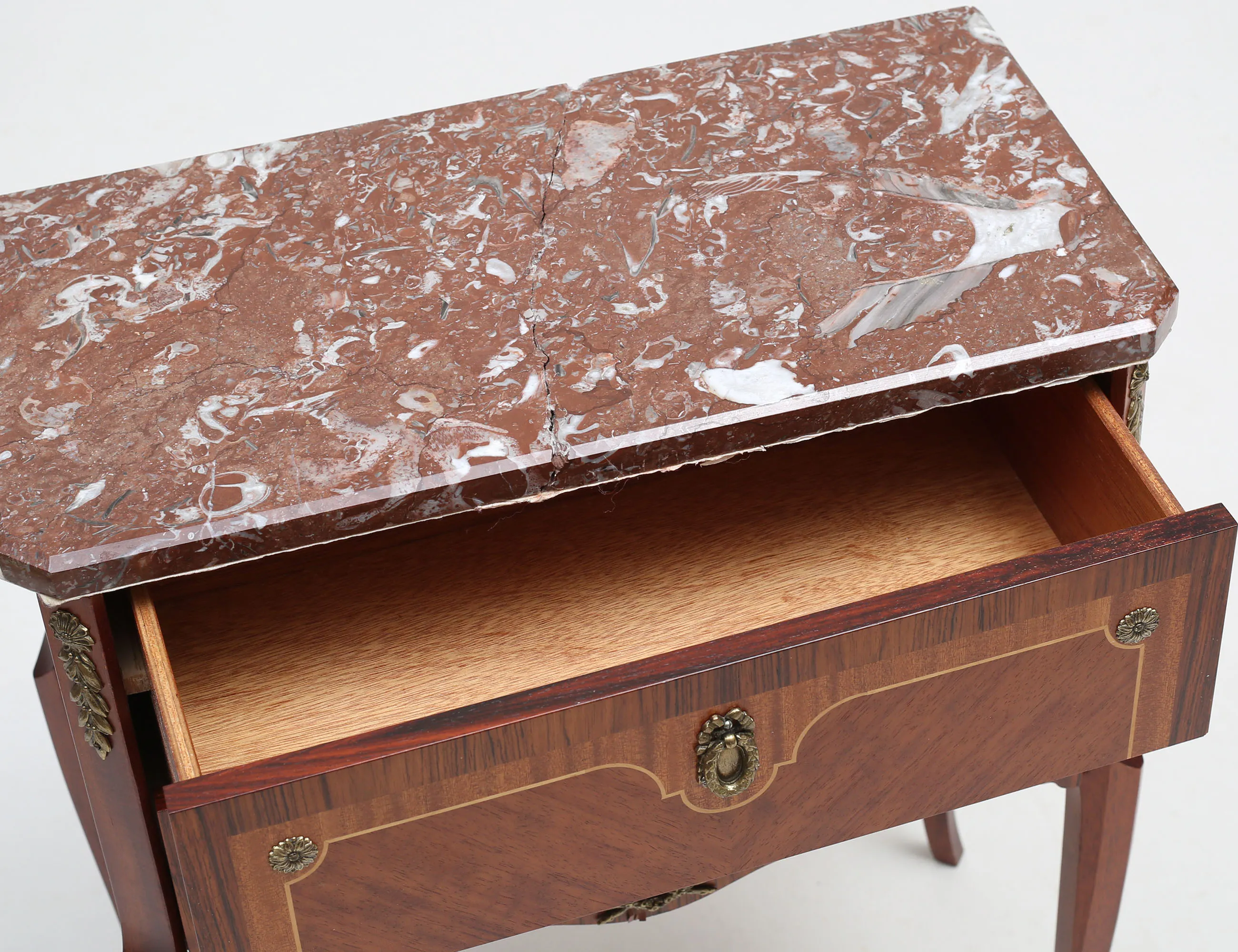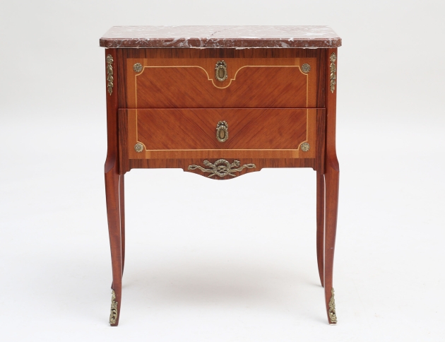 två lådor, beslag och ornament i mässing, marmorskiva, höjd 63, bredd 50 (skivan med lagning)