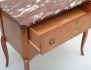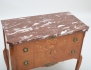 fanerad i olika träslag, intarsia i ljusare träslag, ornament i mässing, marmorskiva, höjd 74, bredd 78, djup 44