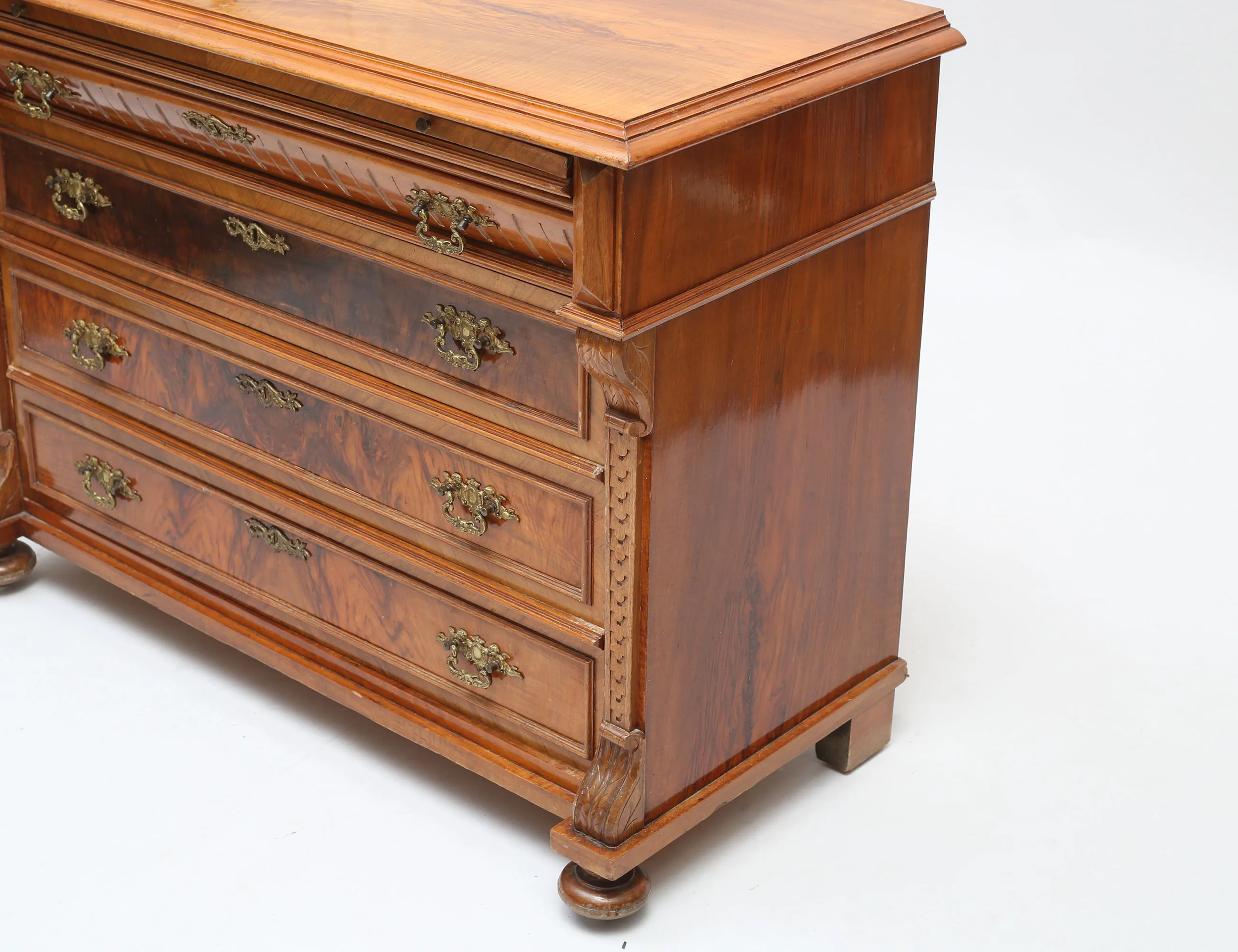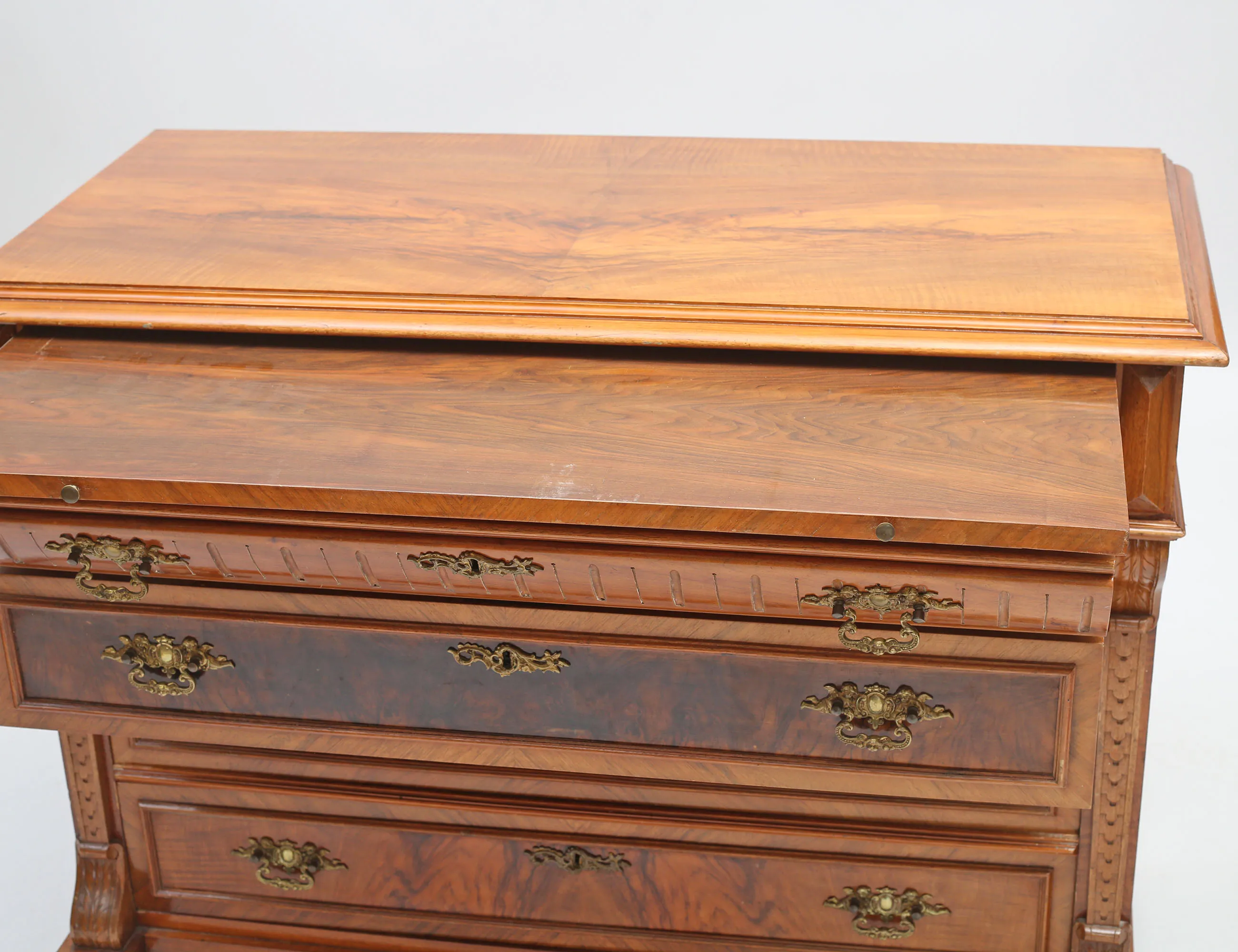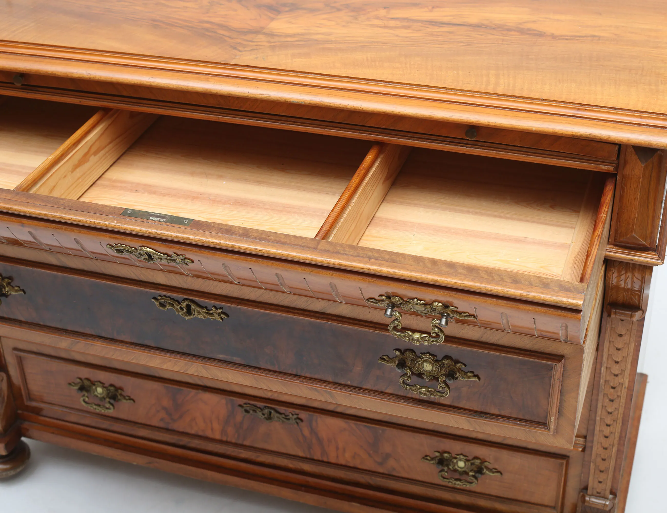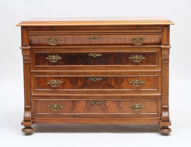 valnöt och valnötsrot, fyra lådor, beslag i mässing, utdragbar skrivskiva, höjd 85, bredd 114, djup 52
