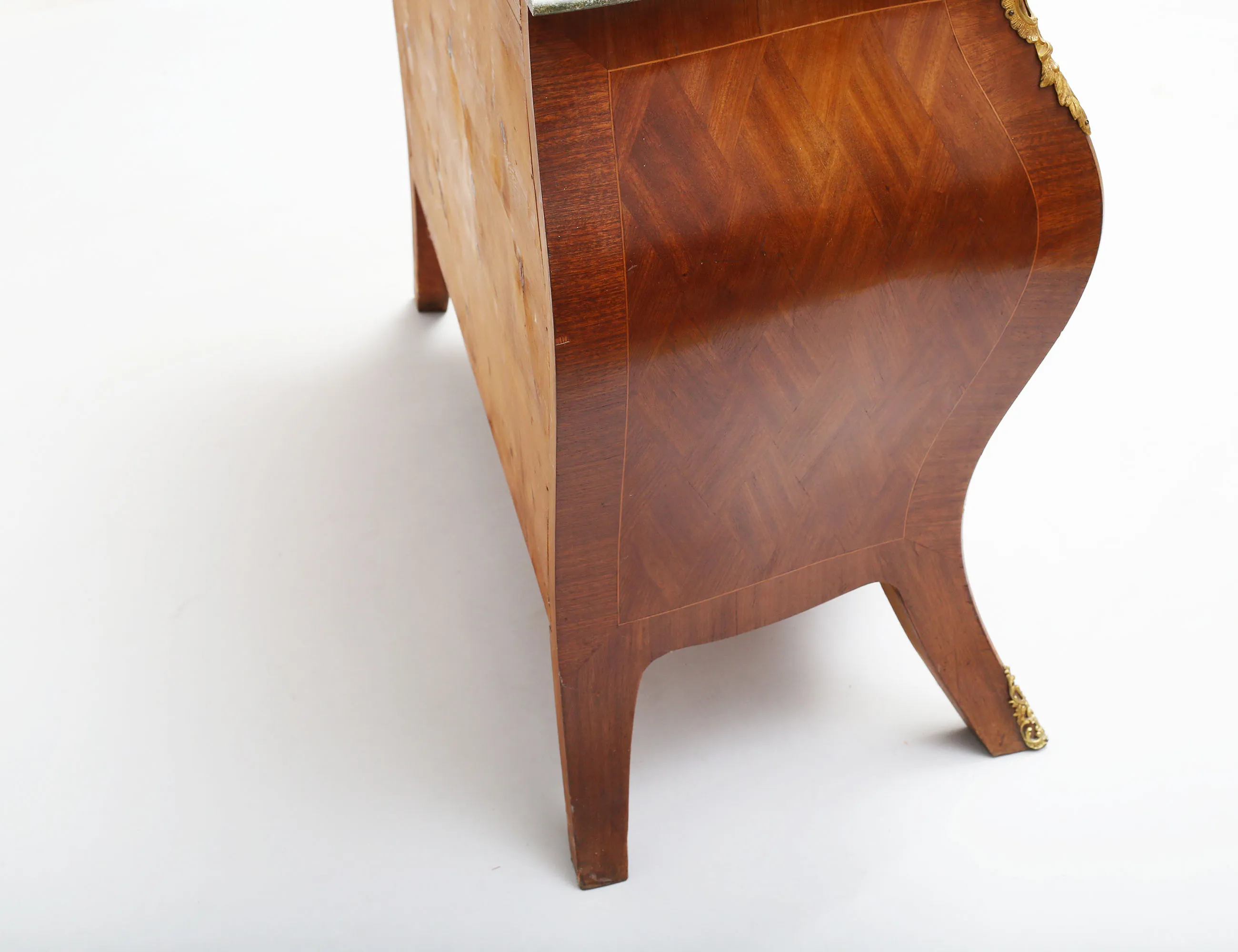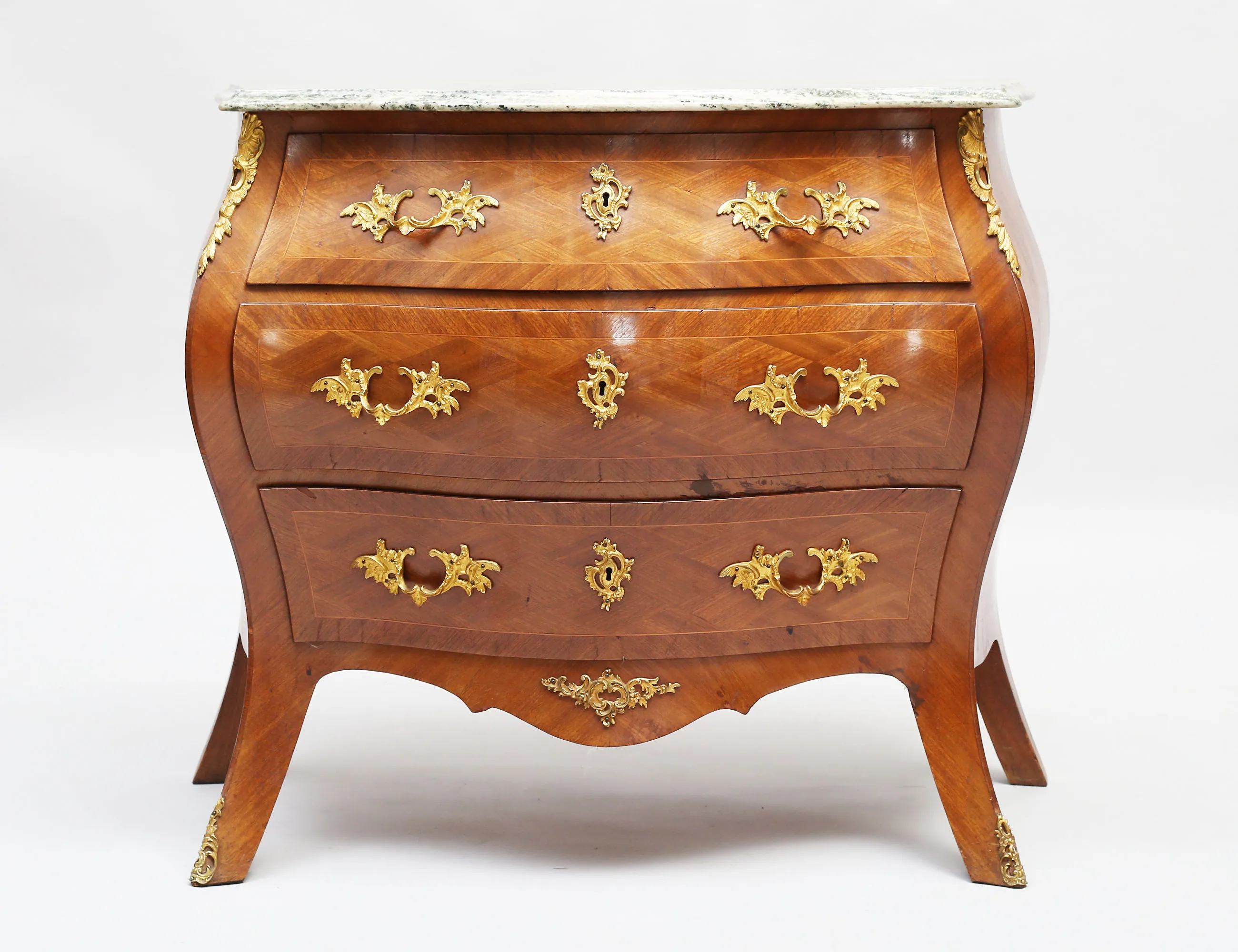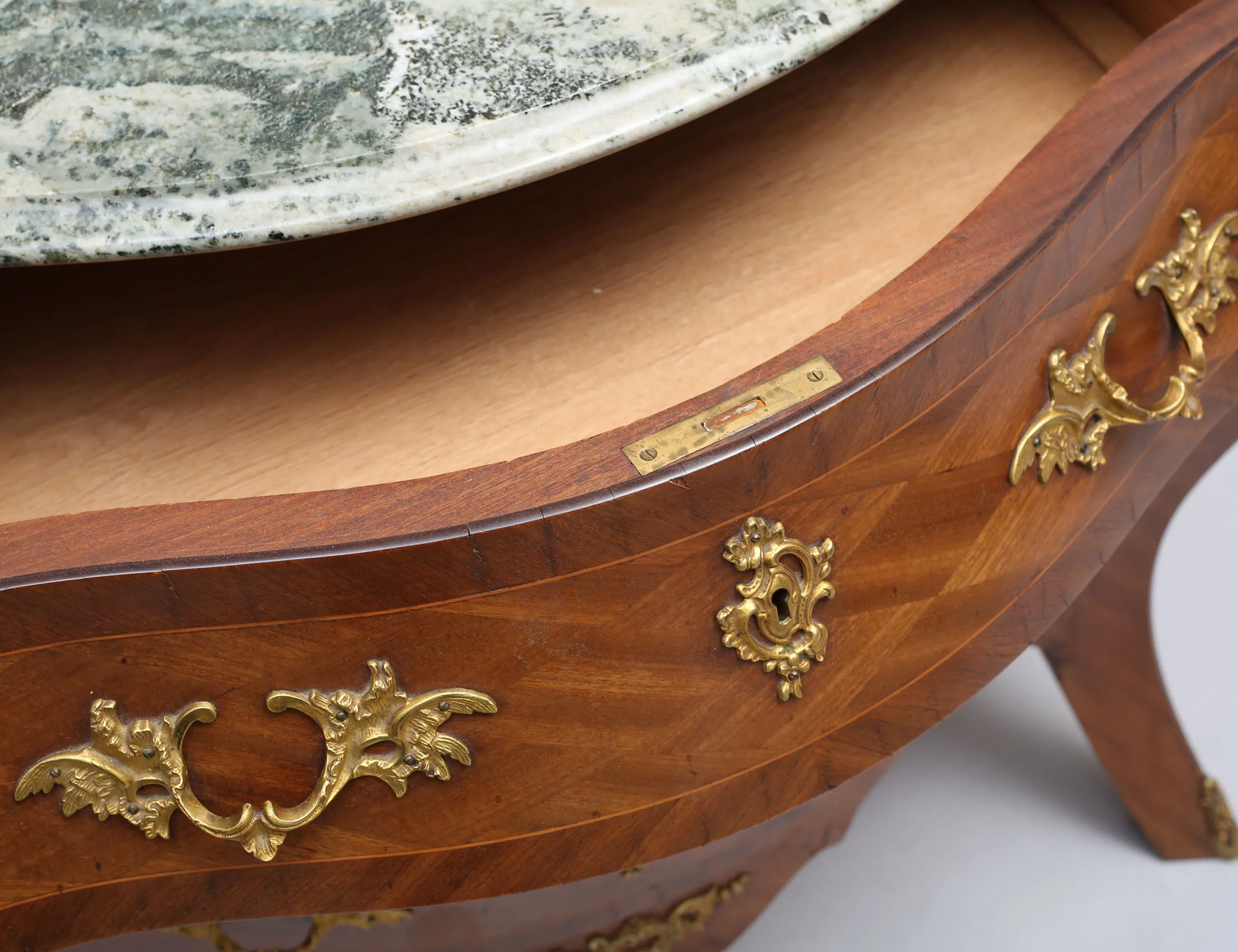 rutfanerad mahogny, beslag och ornament i förgylld mässing, profilerad marmorskiva, höjd 80, bredd 90, djup 47 (smärre fanerskador, nyckel saknas)