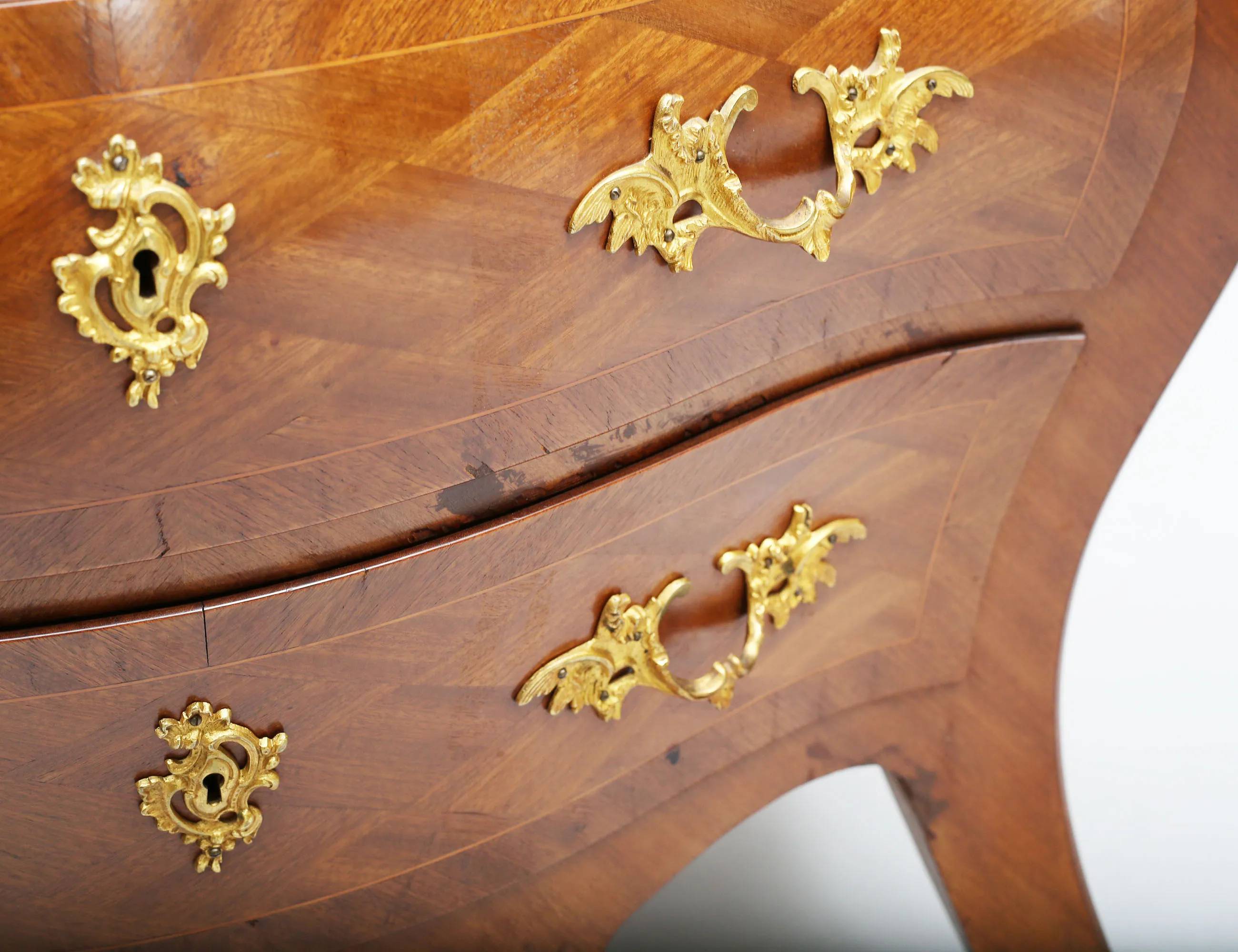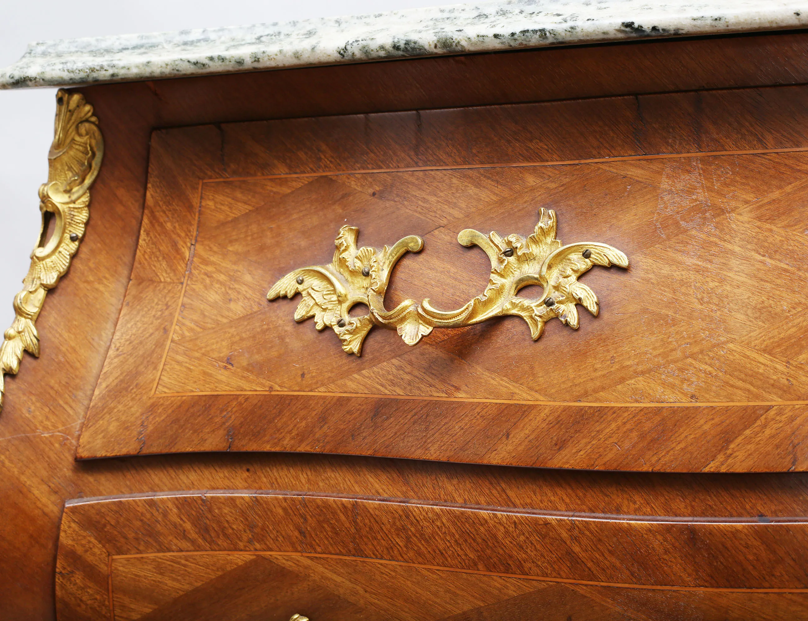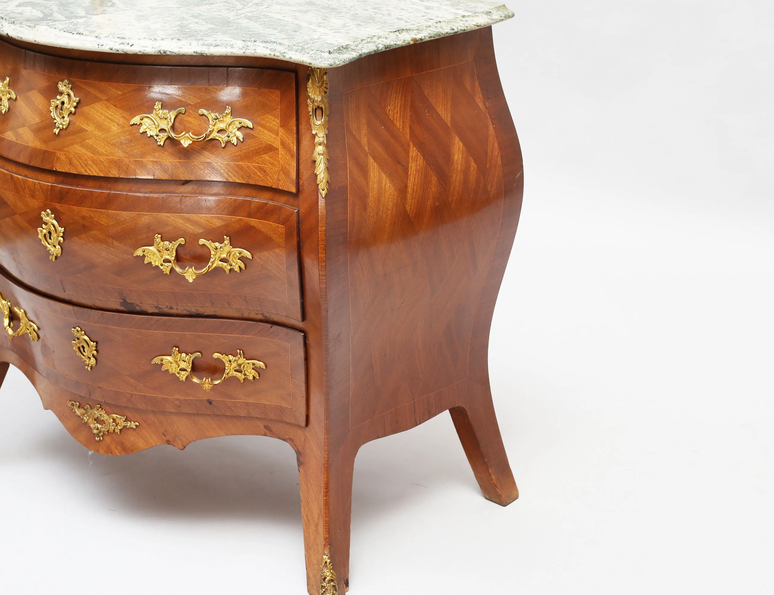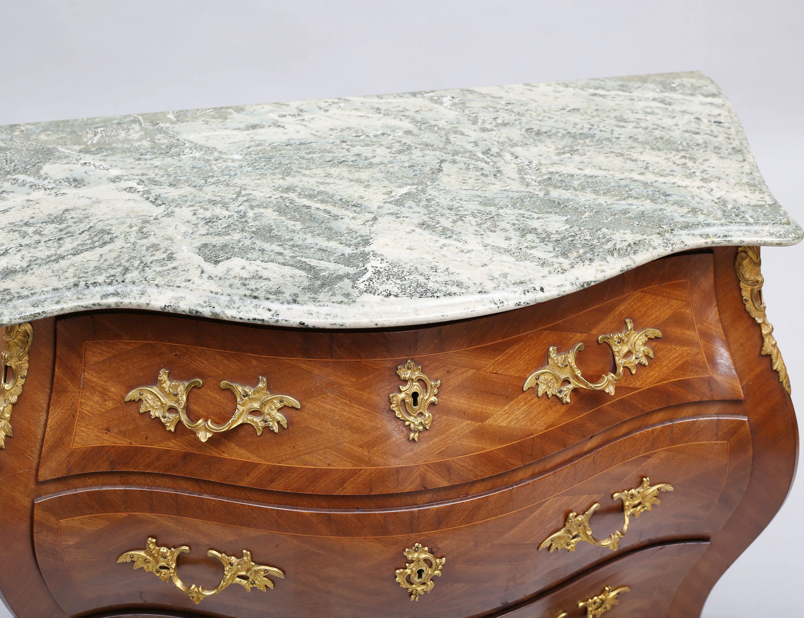 rutfanerad mahogny, beslag och ornament i förgylld mässing, profilerad marmorskiva, höjd 80, bredd 90, djup 47 (smärre fanerskador, nyckel saknas)