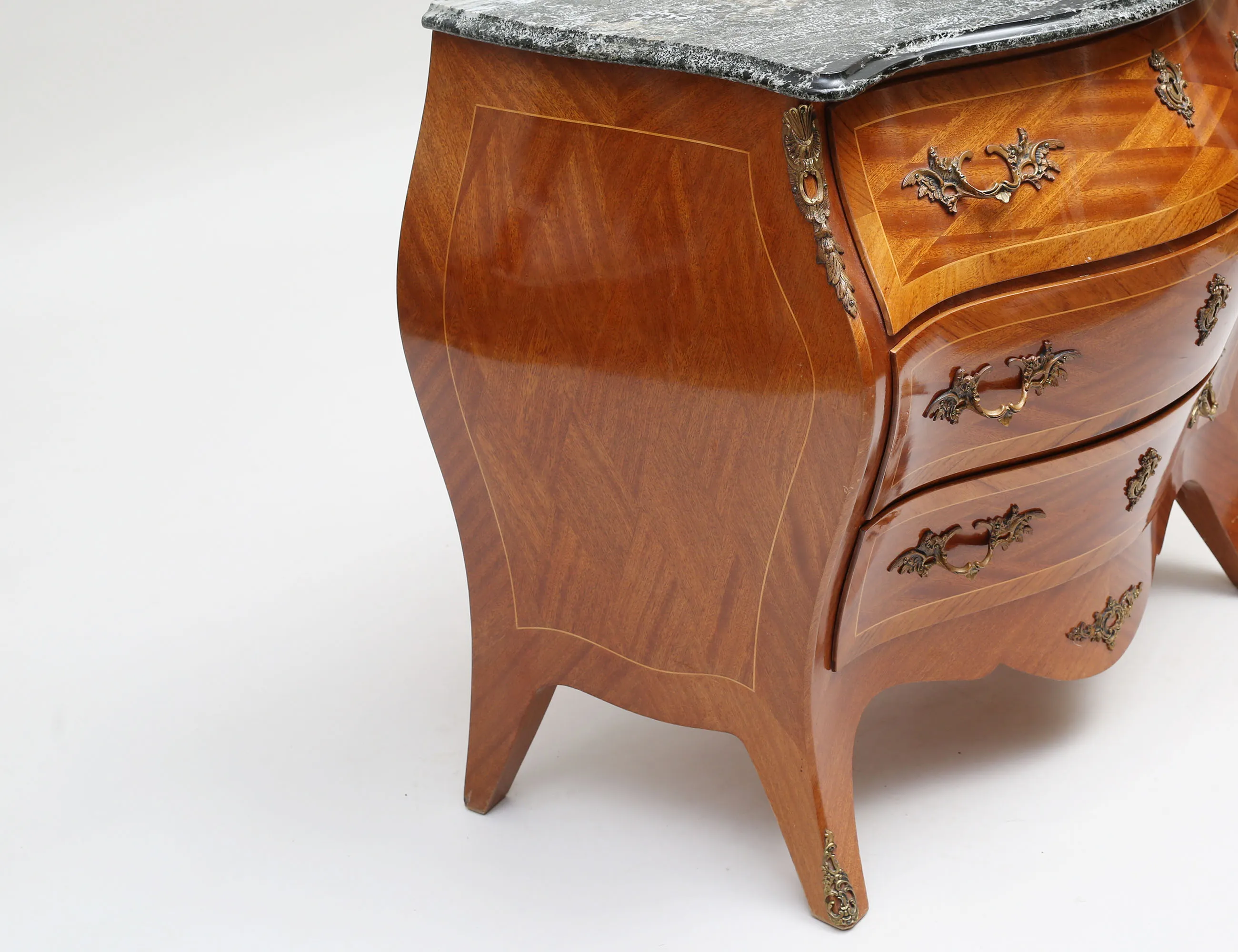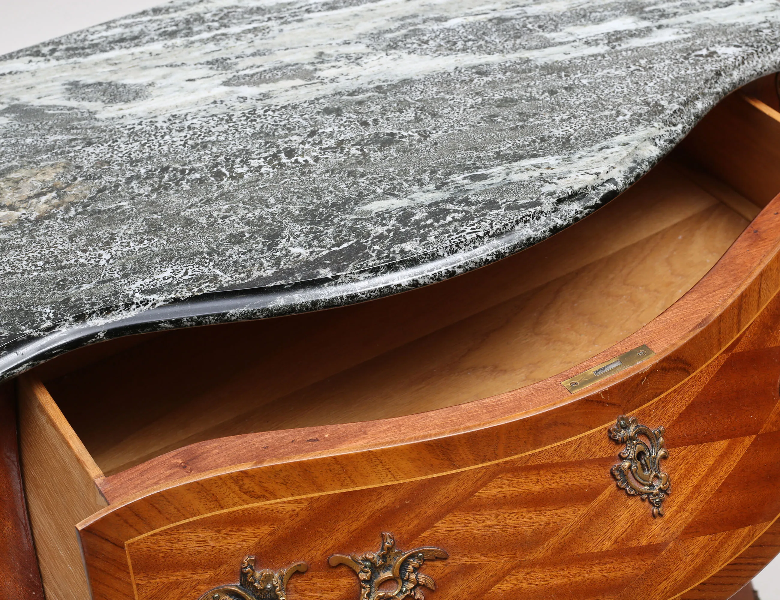 rutfanerad mahogny, tre lådor, svängd front, beslag och ornament i mässing, profilerad stenskiva, höjd 80, bredd 90, djup 54
