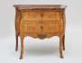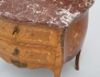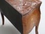 fanerad i olika träslag, blomsterintarsia, två lådor, profilerad marmorskiva, ornament i mässing, höjd 70, bredd 80, djup 42 (smärre nagg marmorskivans bakre kant)