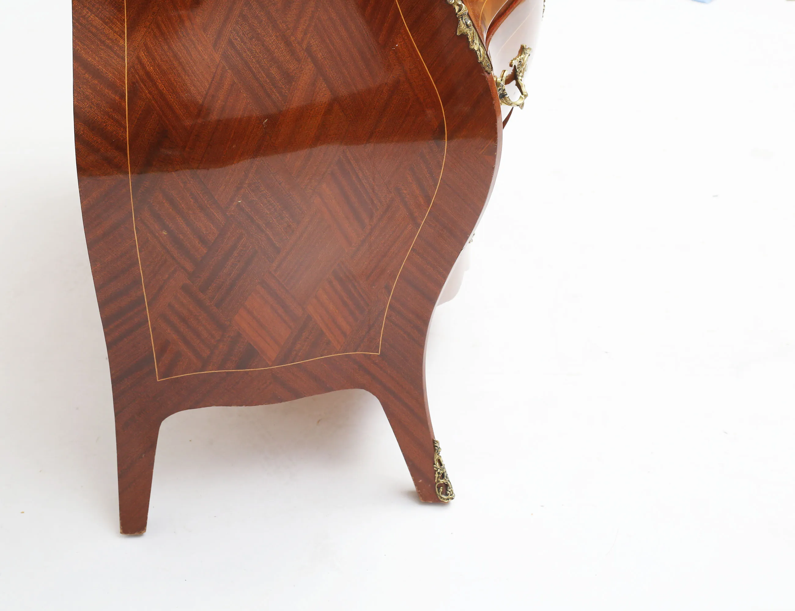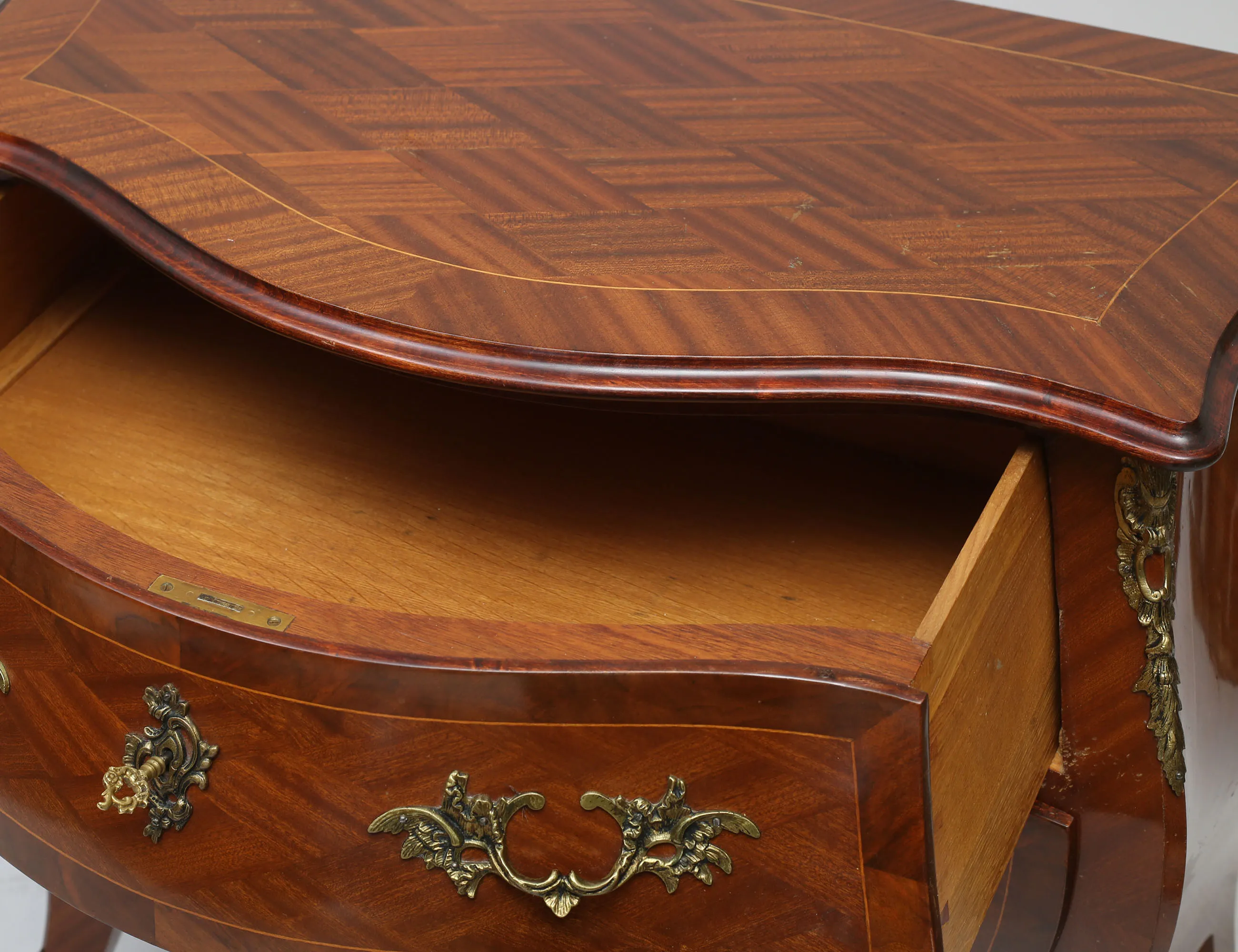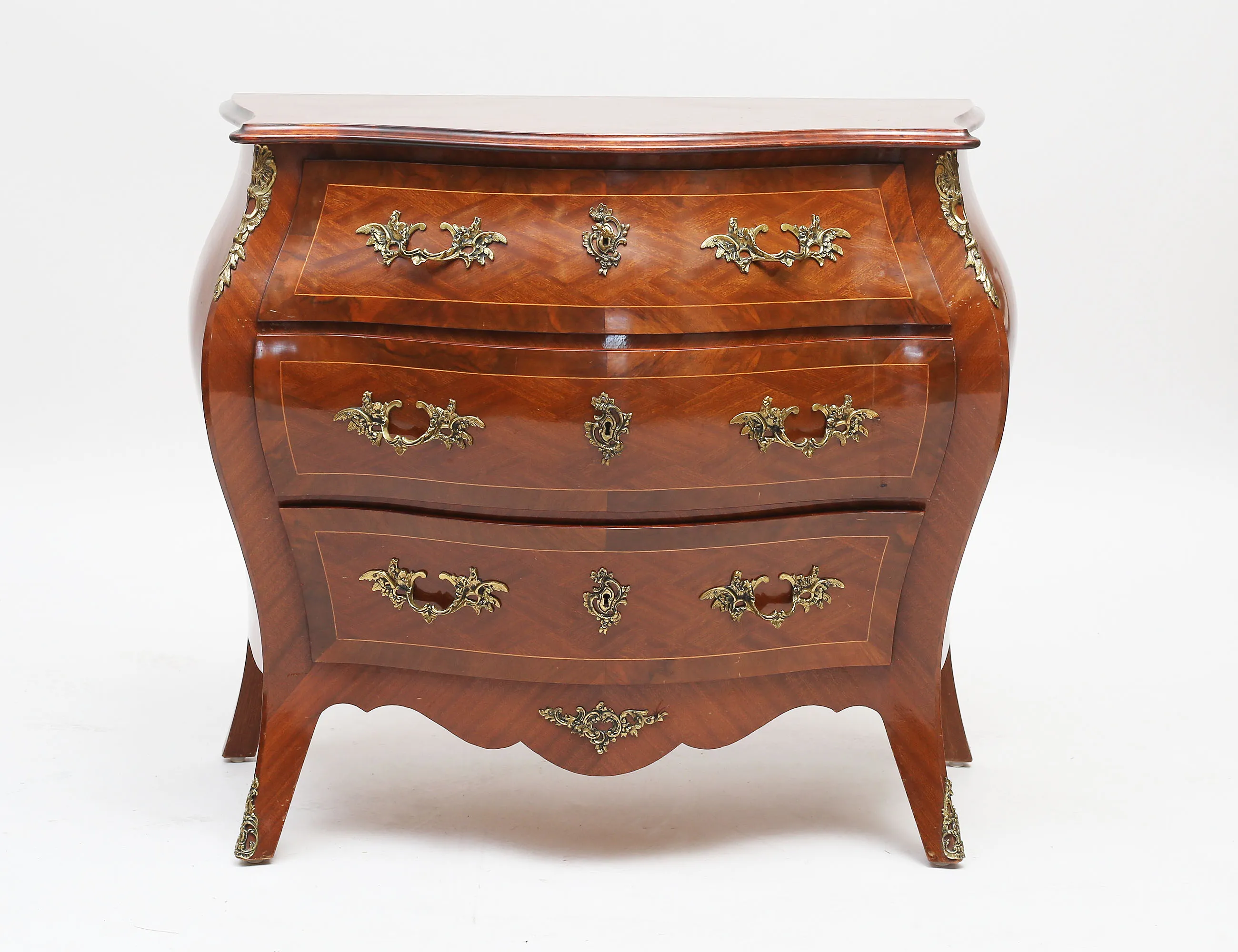 rutfanerad mahogny, bukig form, tre lådor, beslag i gjuten mässing, konturerad skiva, höjd 80, bredd 88, djup 50 (smärre bruksslitage)