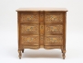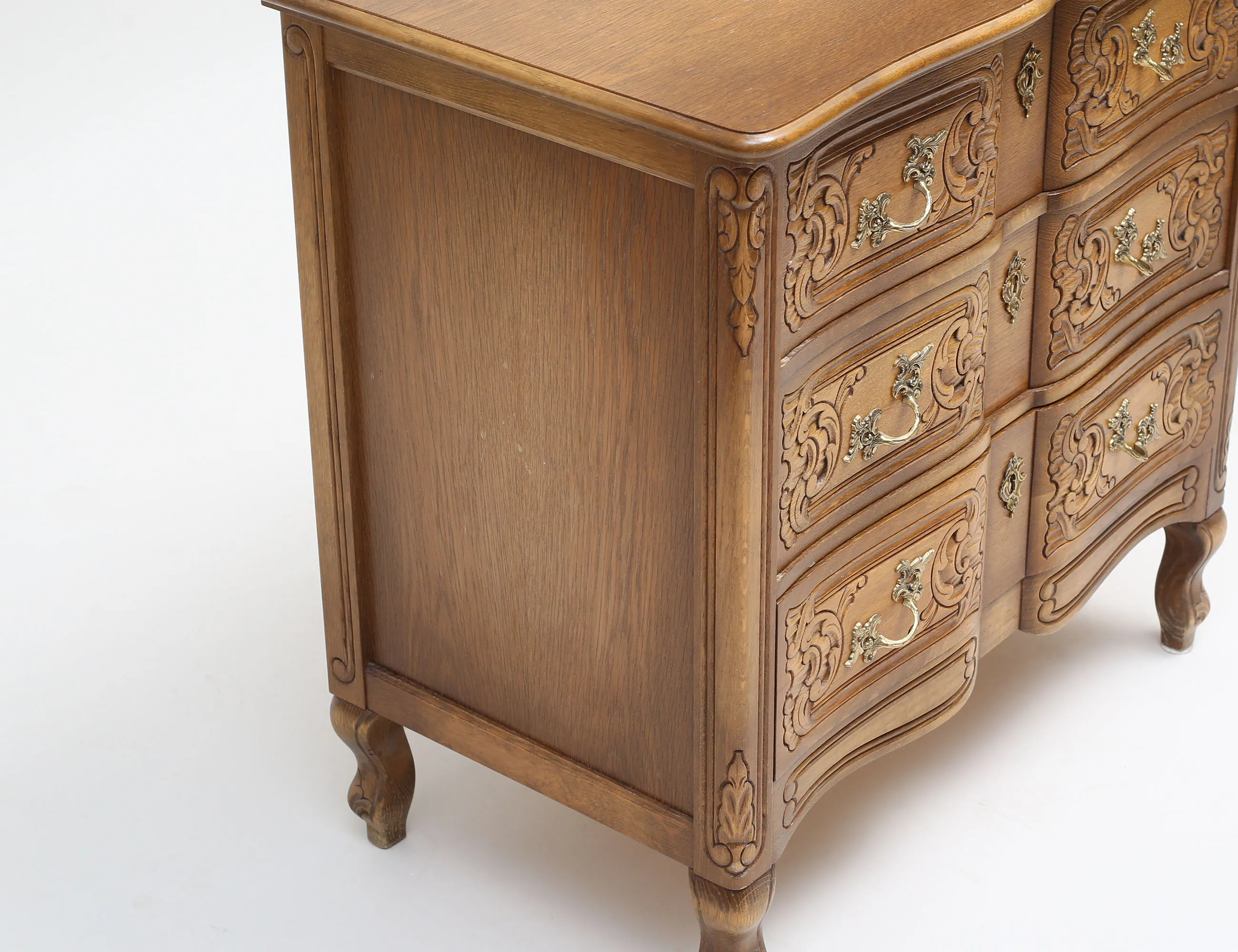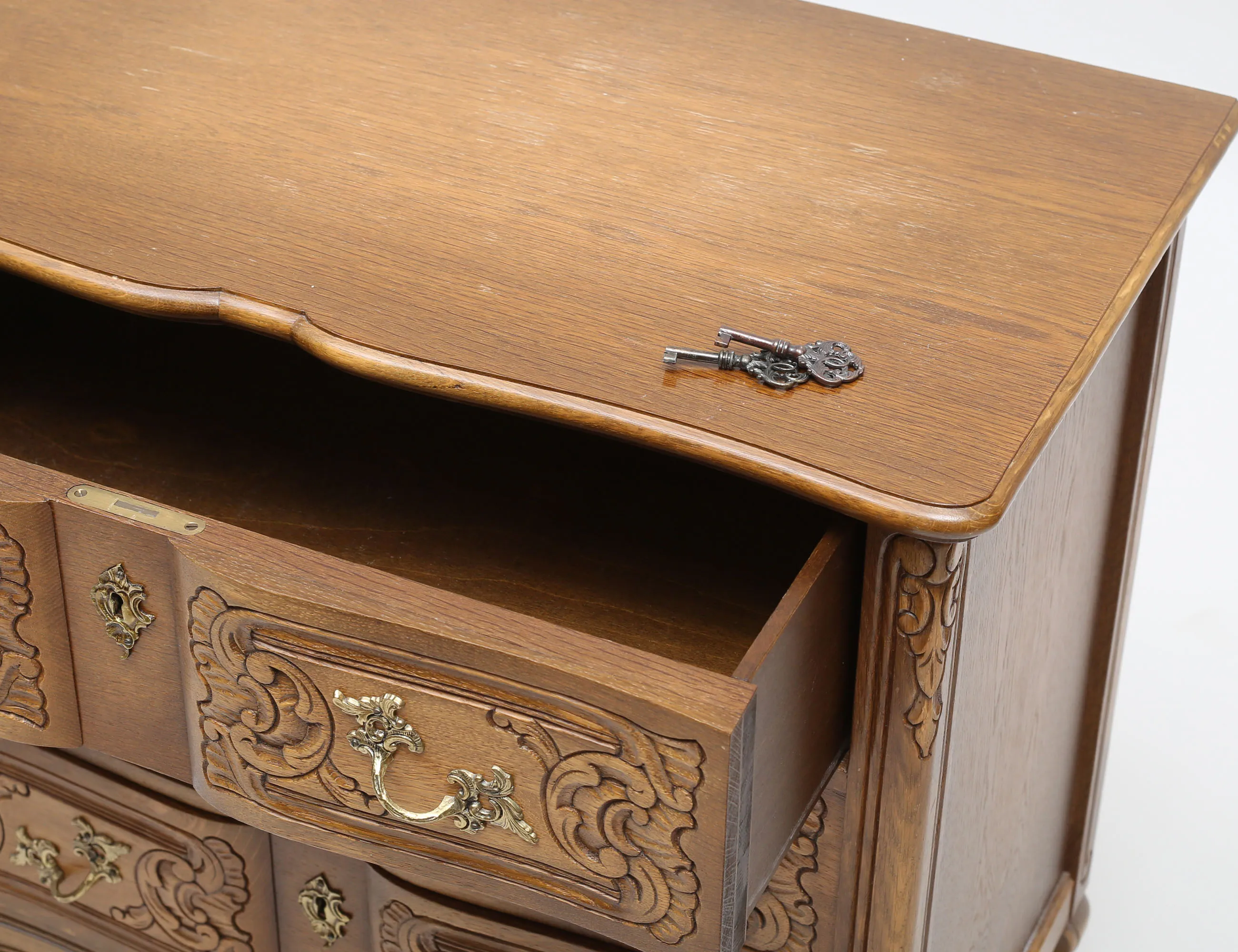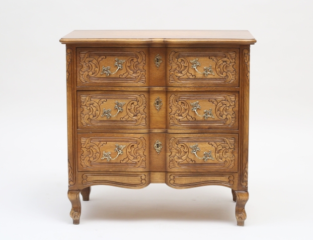 betsad ek, träskuren dekor, tre lådor, beslag i mässing, höjd 73, bredd 74, djup 43