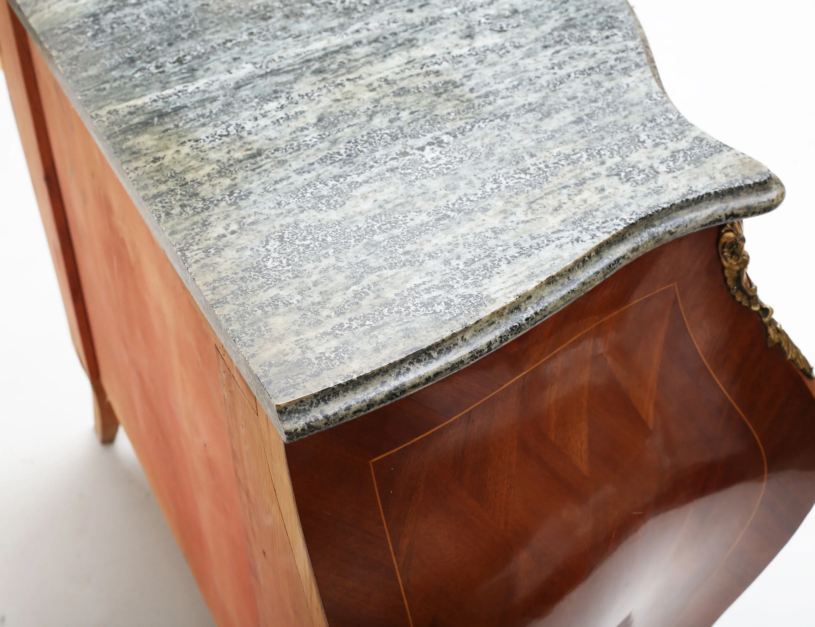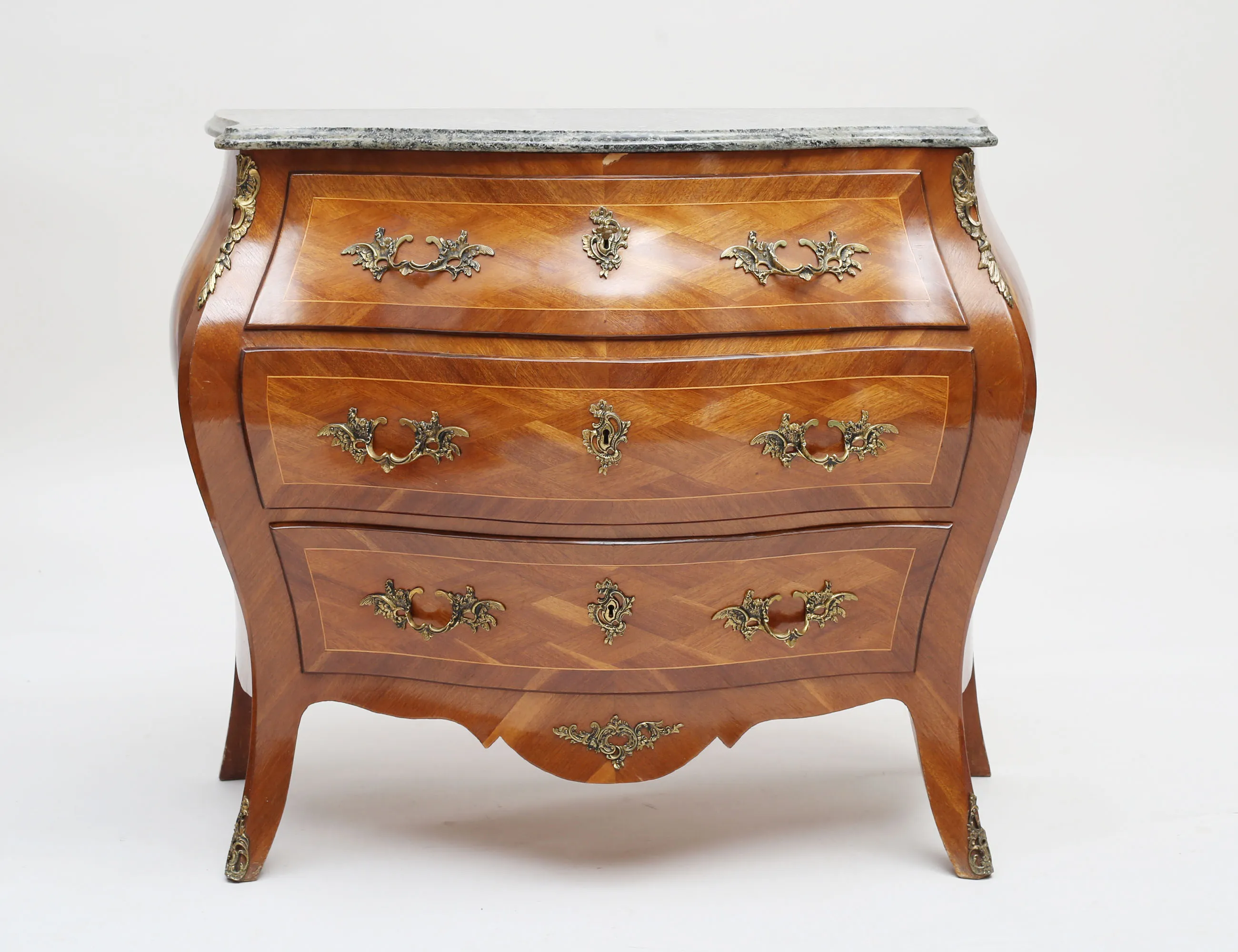 rutfanerad mahogny, bandintarsia tre lådor, beslag i gjuten mässing, profilerad marmorskiva, höjd 81, bredd 90, djup 47 (smärre fanerbortfall)