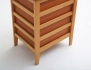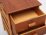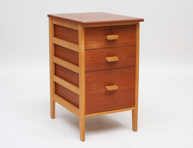 teak, tre lådor med draghandtag, benställning i bok, nyckel saknas, höjd 75, bredd 43x57