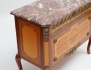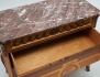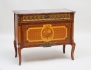 fanerad i olika träslag, intarsia, marmorskiva, beslag och ornament i mässing, höjd 72, bredd 85, djup 42