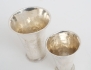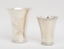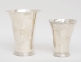 Henrik Nourin Norrköping 1768, ciselerad dekor, höjd 10,5, Nils Orstedt (änkan) 1774, stansad bård längs med mynning, höjd 8,5, (äldre lagning/kantspricka) båda med godronnerad fotring och vågbandsdekor, vikt ca. 120 gram