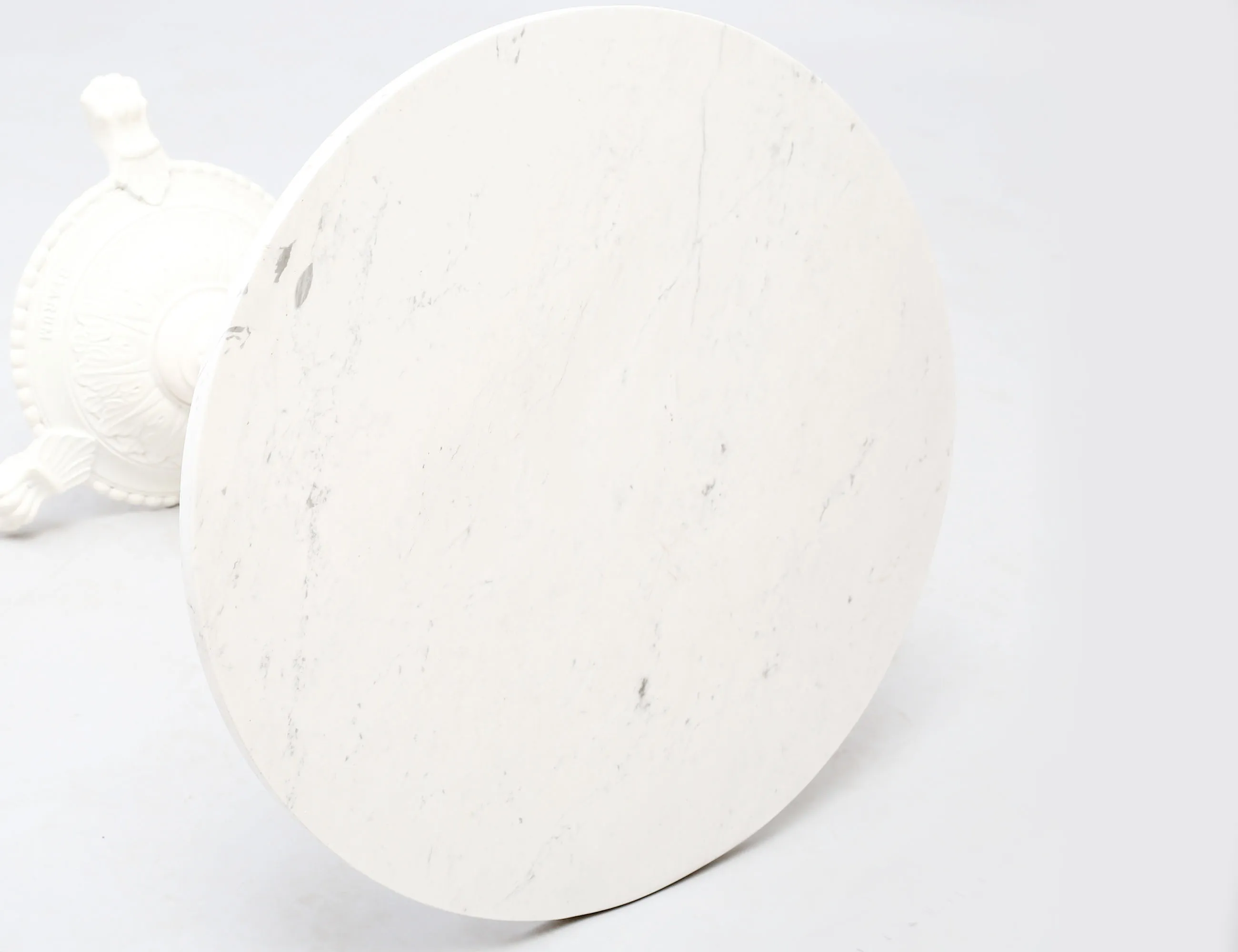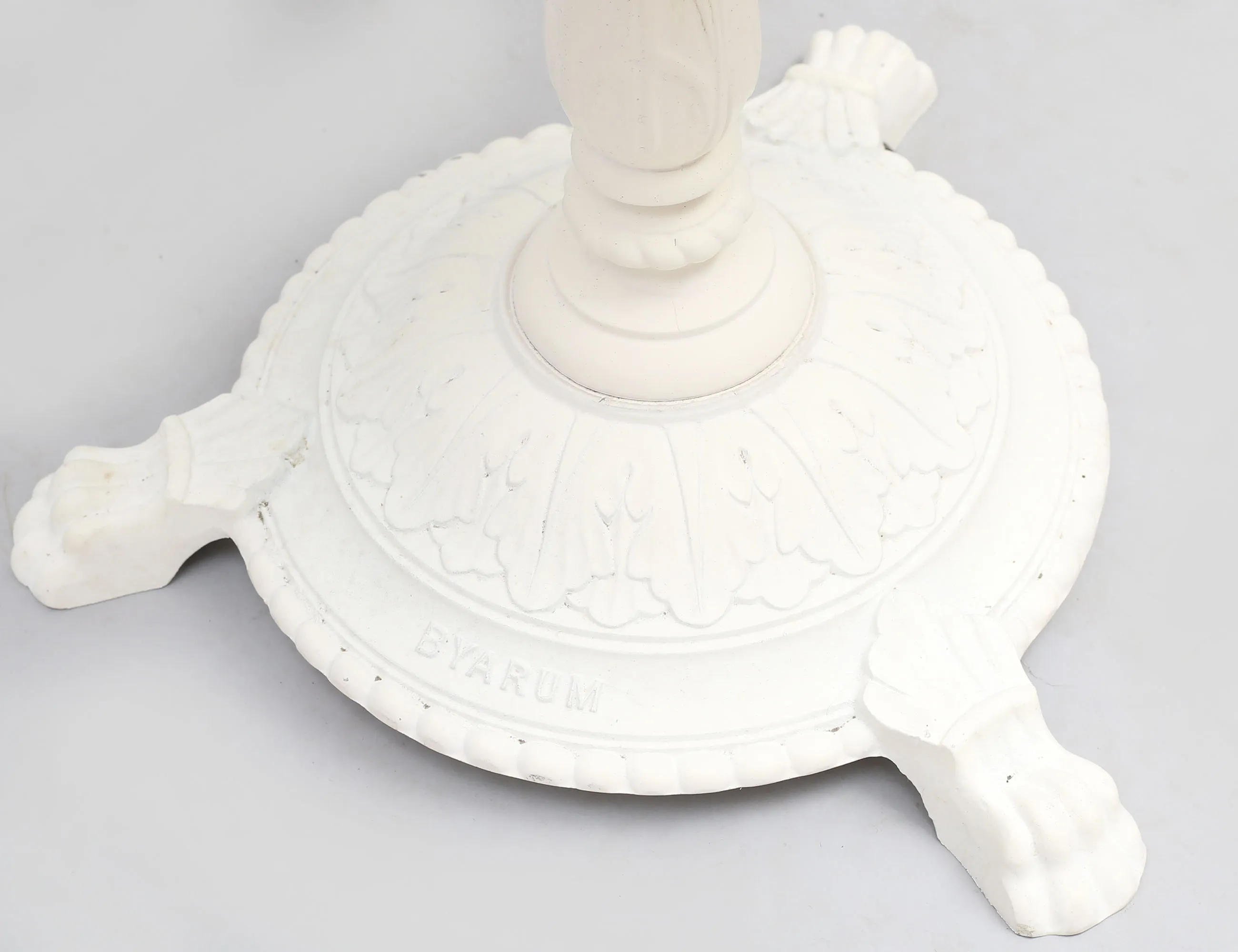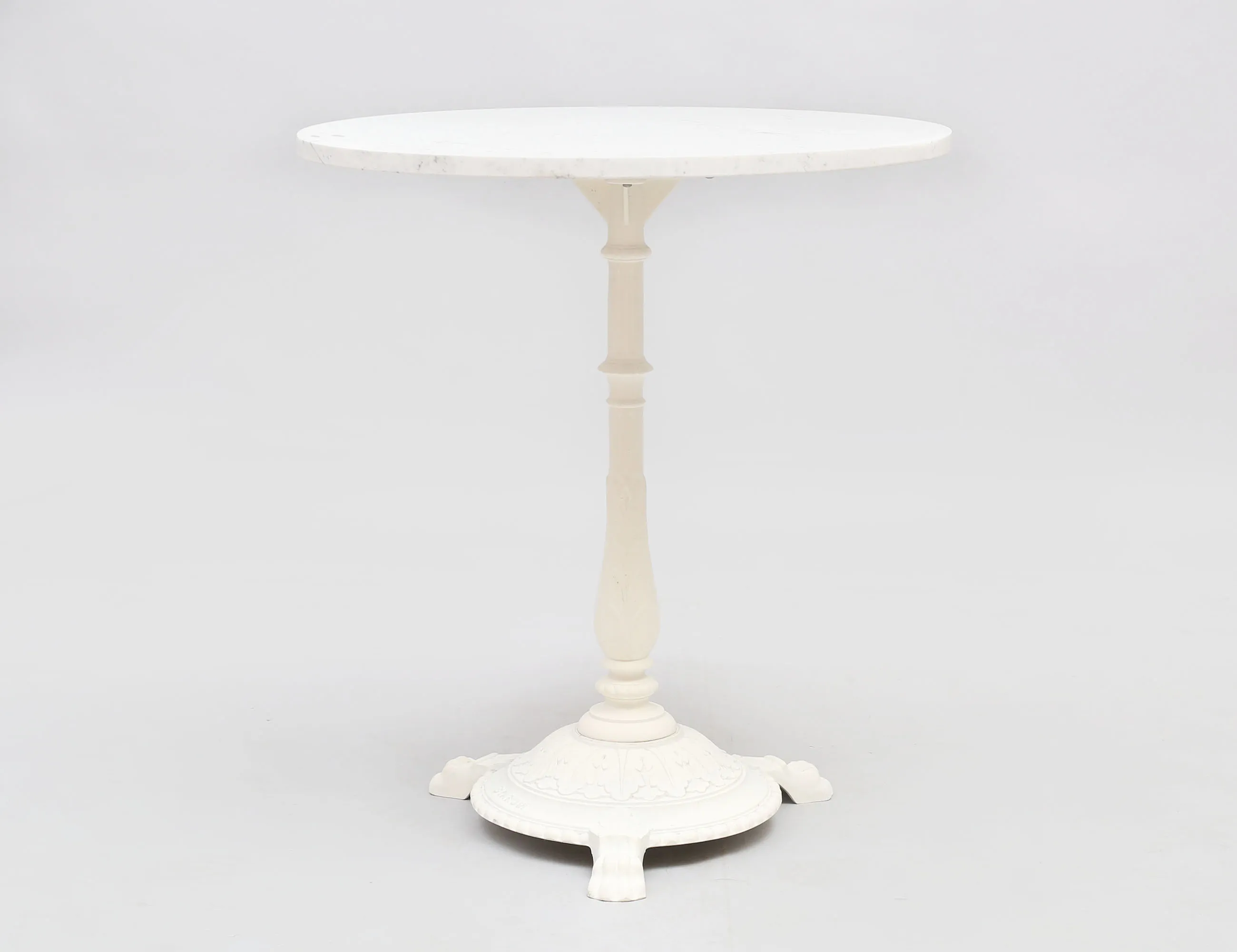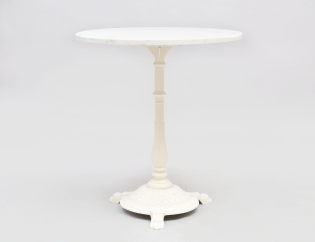 Byarums Bruk, skiva i carraramarmor, fot i vitlackerad aluminium, etikettmärkt, höjd 73, diameter 65 (smärre bruksslitage)