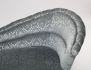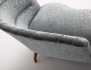 fristående, fast stoppning, gråblå plyschklädsel, svarvade ben med hjultrissor, höjd 77, bredd 130, djup 74 (en hjultrissa saknas)