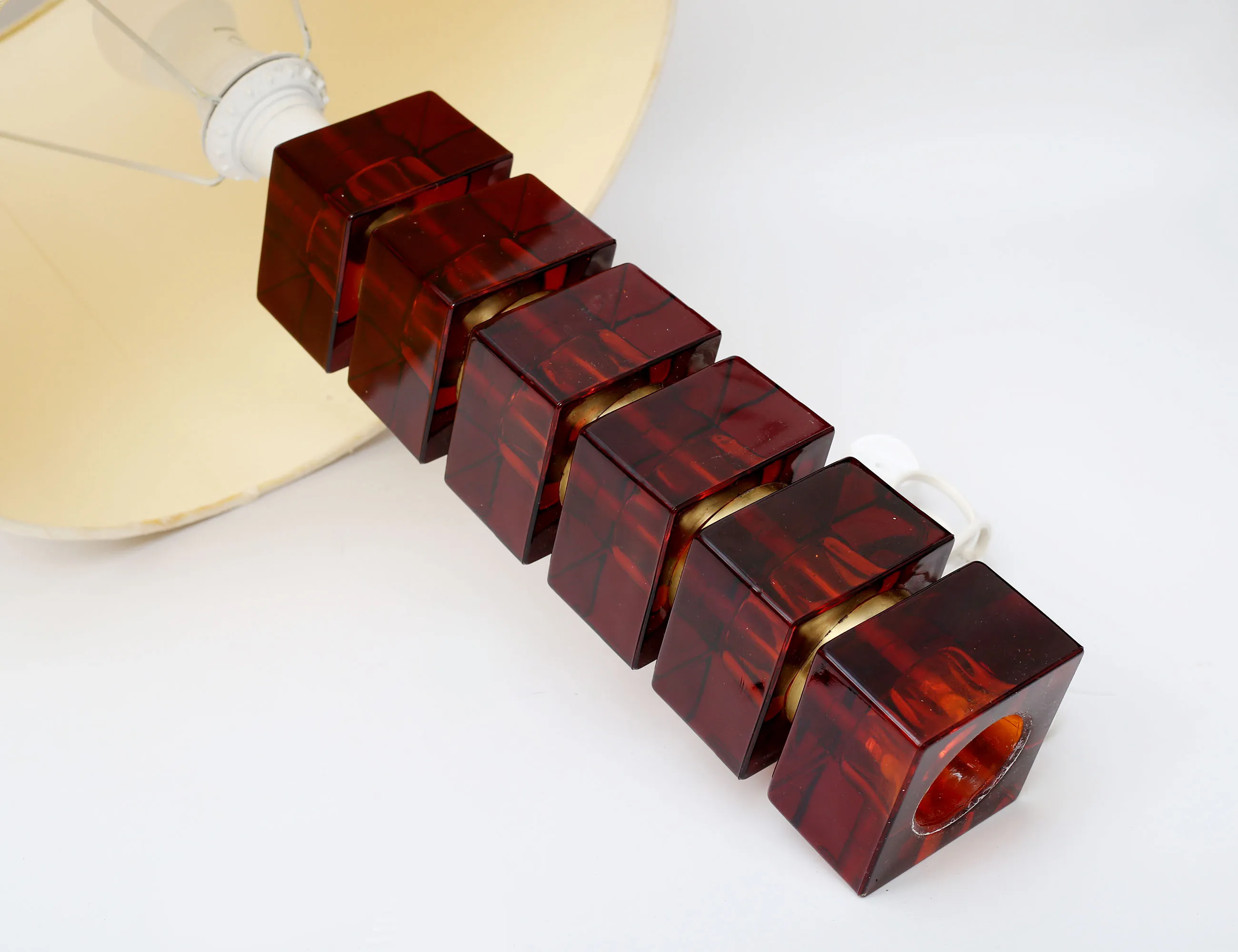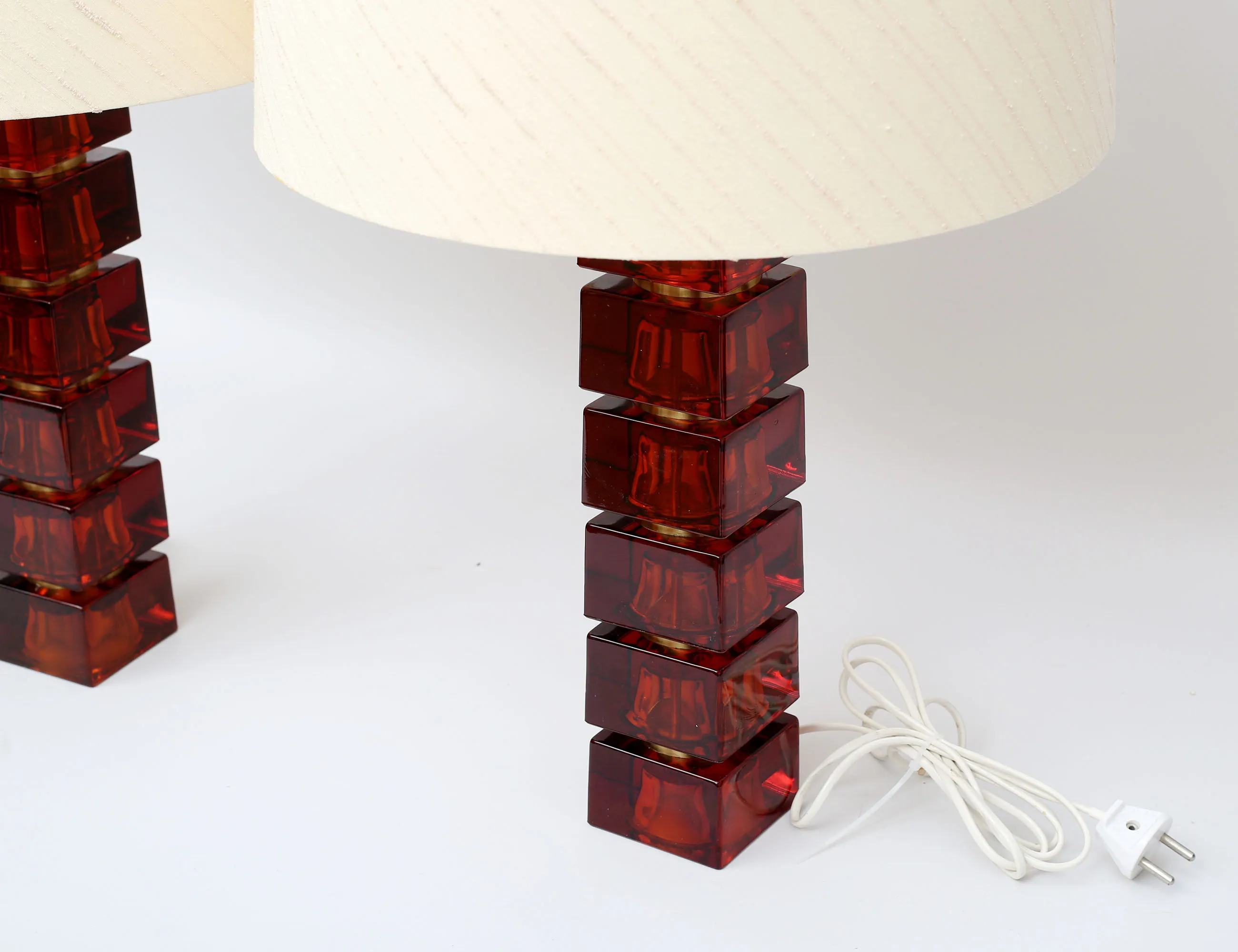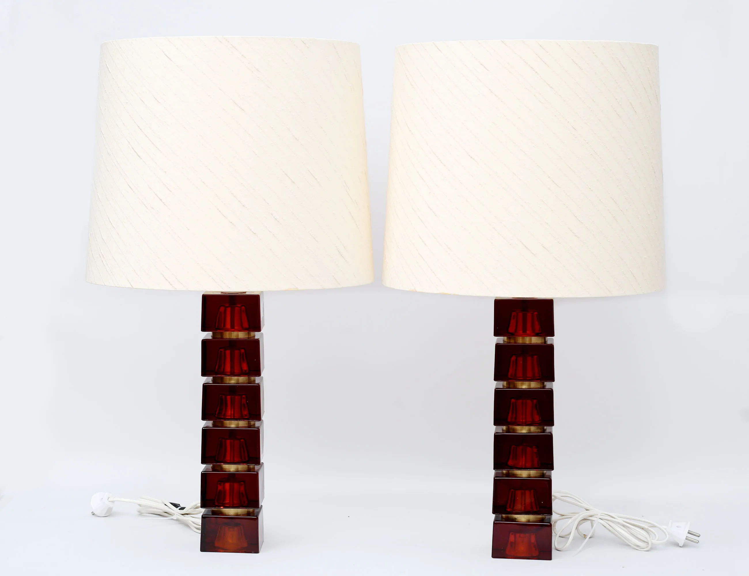 bordslampor 1 par 1960/70-tal, kvadratiska kuber i bärnstensfärgat glas, mellanlägg i mässing, originalskärmar i textil, höjd 42 (68)