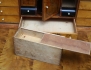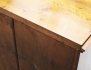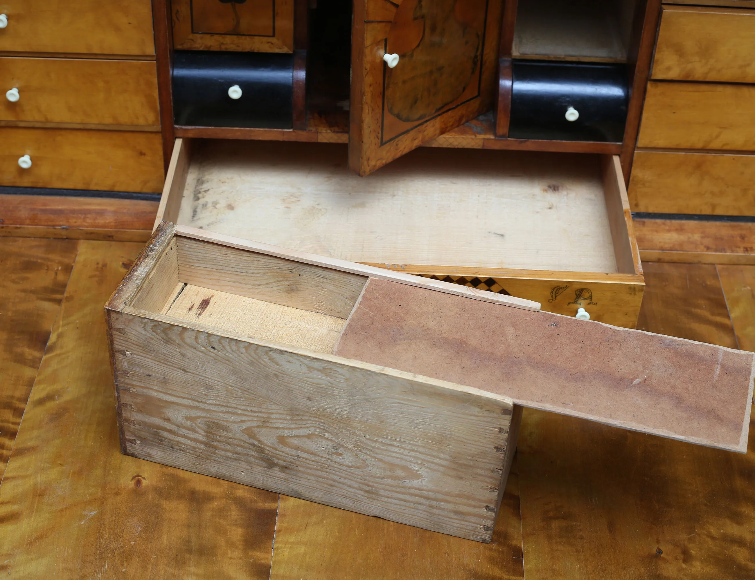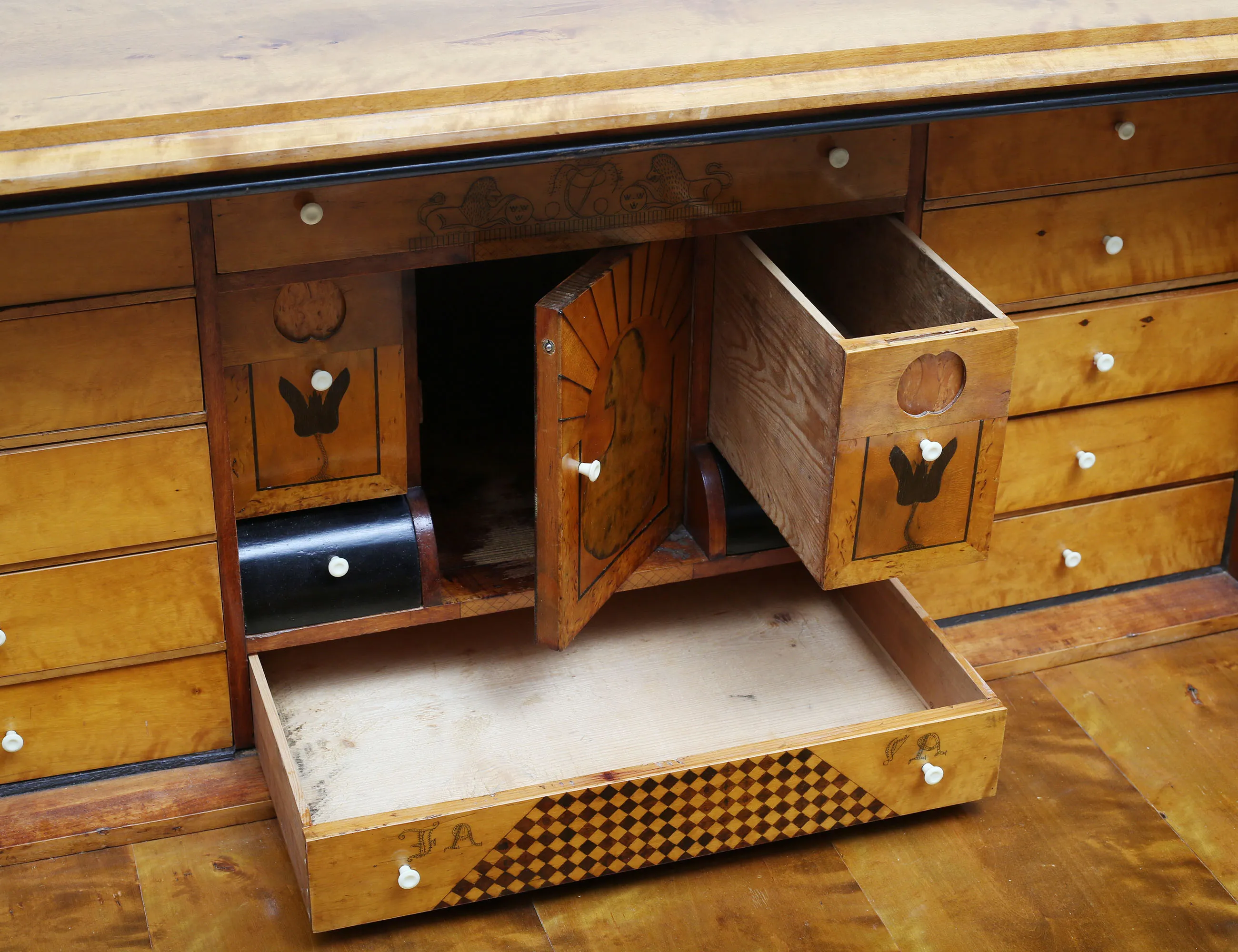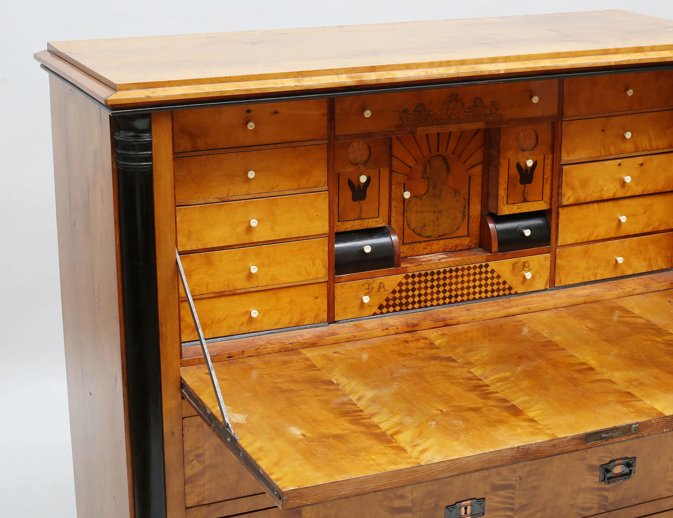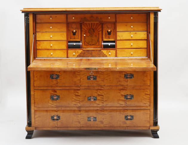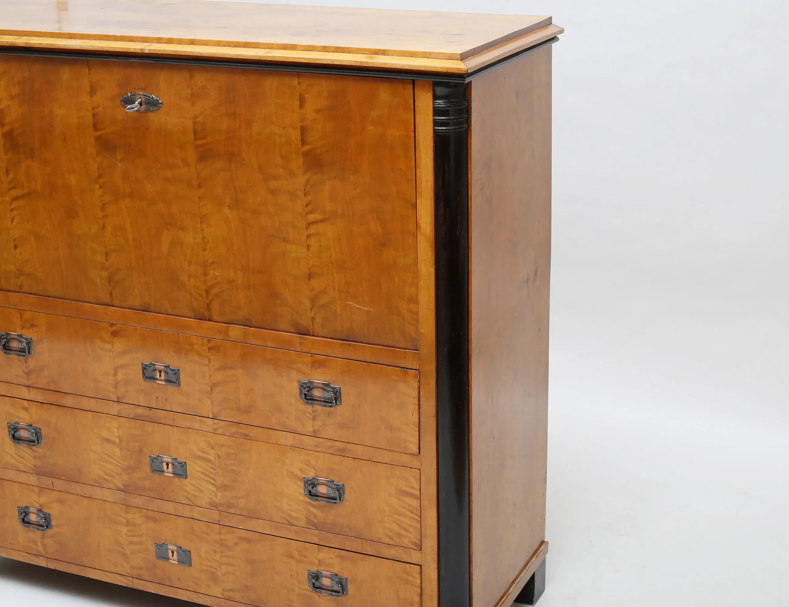 polerad björk, svärtade detaljer, lådinredning bakom klaff, två lönnlådor, tre lådor, senare beslag i patinerad koppar, höjd 114, bredd 119, djup 46